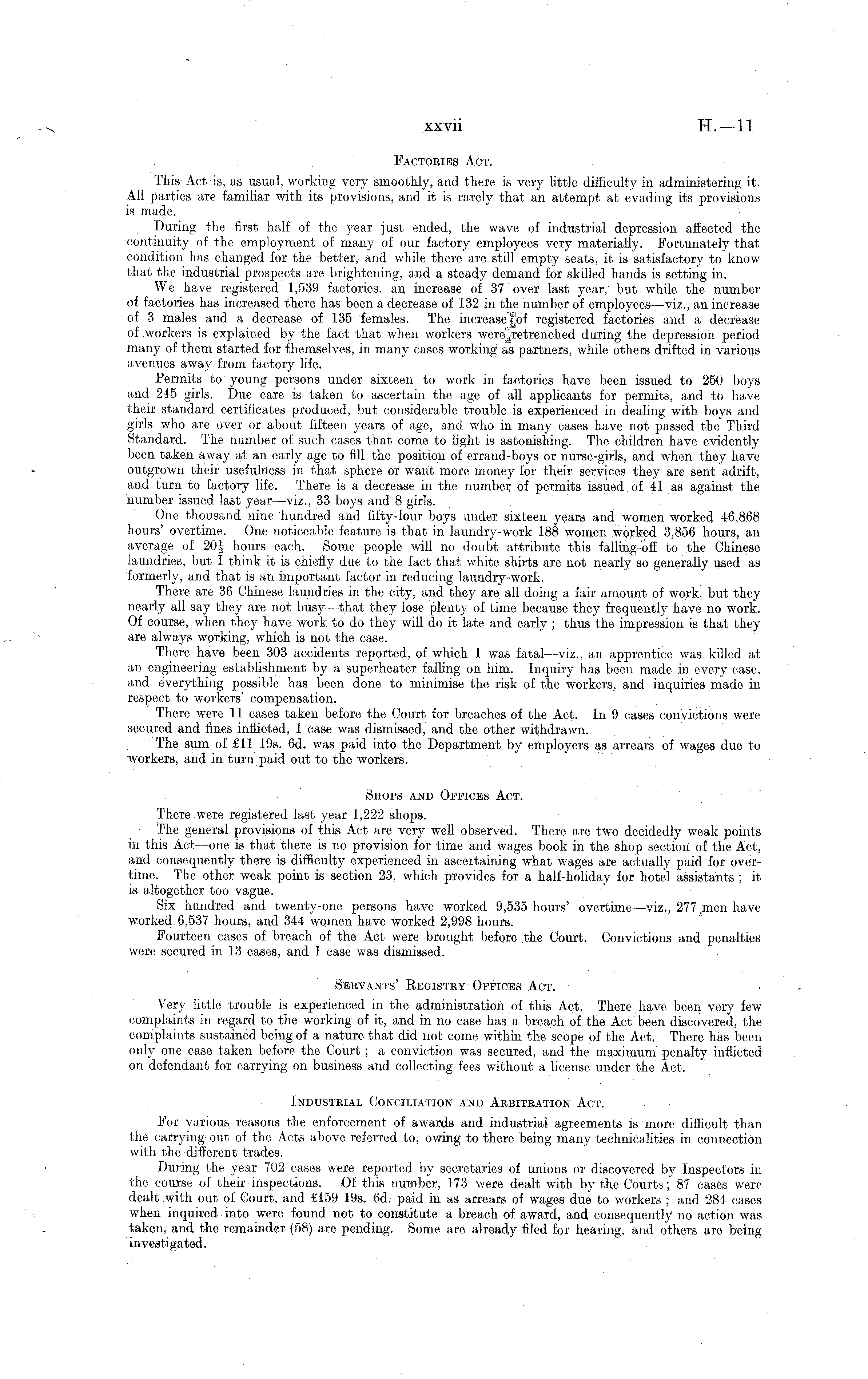 Factories Act. This Act is, as usual, working very smoothly, and there is very little difficulty in administering it. All parties are familiar with its provisions, and it is rarely that an attempt at evading its provisions is made. During the first half of the year just ended, the wave of industrial depression affected the continuity of the employment of many of our factory employees very materially. Fortunately that condition has changed for the better, and while there are still empty seats, it is satisfactory to know that the industrial prospects are brightening, and a steady demand for skilled hands is setting in. We have registered 1,539 factories, an increase of 37 over last year, but while the number of factories has increased there has been a decrease of 132 in the number of employees —viz., an increase of 3 males and a decrease of 135 females. The registered factories and a decrease of workers is explained by the fact that when workers during the depression period many of them started for themselves, in many cases working as partners, while others drifted in various avenues away from factory life. Permits to young persons under sixteen to work in factories have been issued to 250 boys and 245 girls. Due care is taken to ascertain the age of all applicants for permits, and to have their standard certificates produced, but considerable trouble is experienced in dealing with boys and girls who are over or about fifteen years of age, and who in many cases have not passed the Third Standard. The number of such cases that come to light is astonishing. The children have evidently been taken away at an early age to fill the position of errand-boys or nurse-girls, and when they have outgrown their usefulness in that sphere or want more money for their services they are sent adrift, and turn to factory life. There is a decrease in the number of permits issued of 41 as against the number issued last year —viz., 33 boys and 8 girls. One thousand rime hundred and fifty-four boys under sixteen years and women worked 46,868 hours' overtime. One noticeable feature is that in laundry-work 188 women worked 3,856 hours, an average of 20| hours each. Some people will no doubt attribute this falling-off to the Chinese laundries, but I think it is chiefly due to the fact that white shirts are not nearly so generally used as formerly, and that is an important factor in reducing laundry-work. There are 36 Chinese laundries in the city, and they are all doing a fair amount of work, but they nearly all say they are not busy-that they lose plenty of time because they frequently have no work. Of course, when they have work to do they will do it late and early ; thus the impression is that they are always working, which is not the caseThere have been 303 accidents reported, of which 1 was fatal —viz., an apprentice was killed at an engineering establishment by a superheater falling on him. Inquiry has been made in every case, and everything possible has been done to minimise the risk of the workers, and inquiries made in respect to workers' compensation. There were 11 cases taken before the Court for breaches of the Act. In 9 cases convictions were secured and fines inflicted, 1 case was dismissed, and the other withdrawn. The sum of £11 I9s. 6d. was paid into the Department by employers as arrears of wages due to workers, and in turn paid out to the workers. Shops and Offices Act. There were registered, last year 1,222 shops. The general provisions of this Act are very well observed. There are two decidedly weak points in this Act—one is that there is no provision for time and wages book in the shop section of the Act, and consequently there is difficulty experienced in ascertaining what wages are actually paid for overtime. The other weak point is section 23, which provides for a half-holiday for hotel assistants ; it is altogether too vague. Six hundred and twenty-one persons have worked 9,535 hours' overtime —viz., 277 men have worked 6,537 hours, and 344 women have worked 2,998 hours. Fourteen cases of breach of the Act were brought before .the Court. Convictions and penalties were secured in 13 cases, and 1 case was dismissed. Servants' Registry Offices Act. Very little trouble is experienced in the administration of this Act. There have been very few complaints in regard to the working of it, and in no case has a breach, of the Act been discovered, the complaints sustained being of a nature that did not come within the scope of the Act. There has been only one case taken before the Court ; a conviction was secured, and the maximum penalty inflicted on defendant for carrying on business and collecting fees without a license under the Act. Industrial Conciliation and Arbitration Act. For various reasons the enforcement of awards and industrial agreements is more difficult than the carrying-out of the Acts above referred to, owing to there being many technicalities in connection with the different trades. During the year 702 cases were reported by secretaries of unions or discovered by Inspectors in the course of their inspections. Of this number, 173 were dealt with by the Courts; 87 cases were dealt with out of Court, and £159 19s. 6d. paid in as arrears of wages due to workers ; and 284 cases when inquired into were found not to constitute a breach of award, and consequently no action was taken, and the remainder (58) are pending. Some are already filed for hearing, and others are being investigated.