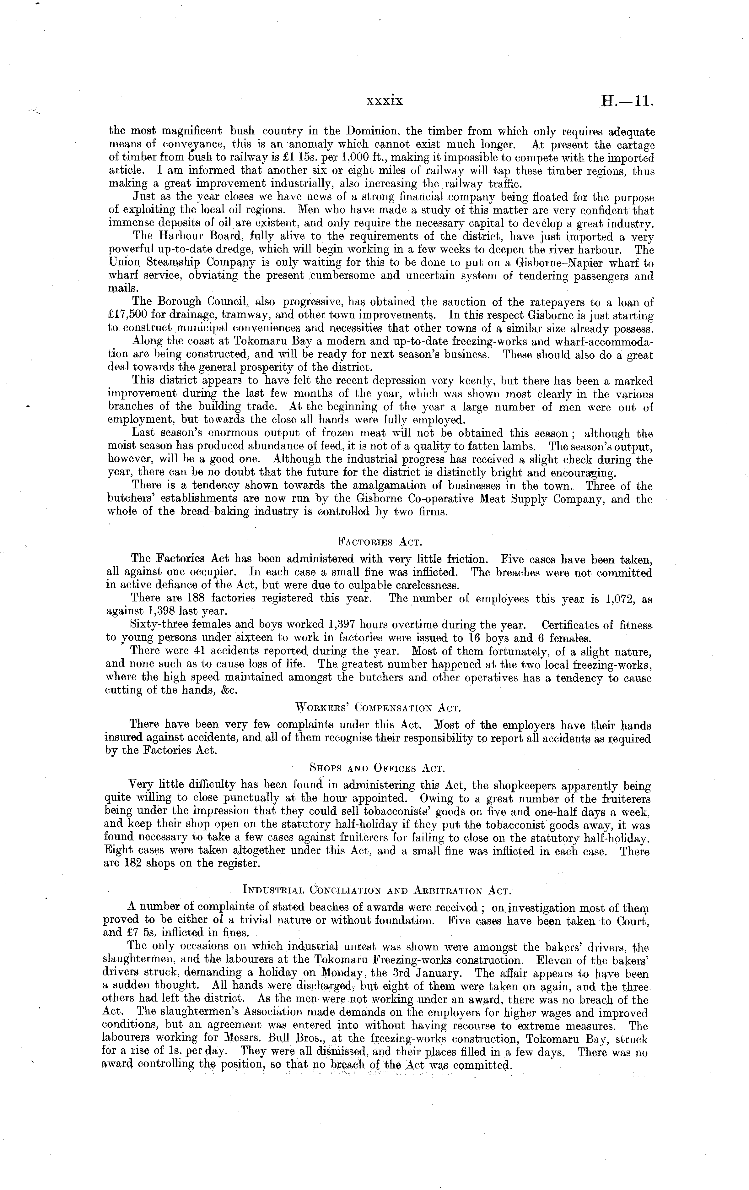 the most magnificent bush country in the Dominion, the timber from which only requires adequate means of conveyance, this is an anomaly which cannot exist much longer. At present the cartage of timber from bush to railway is £1 15s. per 1,000 ft., making it impossible to compete with the imported article. lam informed that another six or eight miles of railway will tap these timber regions, thus making a great improvement industrially, also increasing the railway traffic. Just as the year closes we have news of a strong financial company being floated for the purpose of exploiting the local oil regions. Men who have made a study of this matter are very confident that immense deposits of oil are existent, and only require the necessary capital to develop a great industry. The Harbour Board, fully alive to the requirements of the district, have just imported a very powerful up-to-date dredge, which will begin working in a few weeks to deepen the river harbour. The Union Steamship Company is only waiting for this to be done to put on a Gisborne-Napier wharf to wharf service, obviating the present cumbersome and uncertain system of tendering passengers and mails. The Borough Council, also progressive, has obtained the sanction of the ratepayers to a loan of £17,500 for drainage, tramway, and other town improvements. In this respect Gisborne is just starting to construct municipal conveniences and necessities that other towns of a similar size already possess. Along the coast at Tokomaru Bay a modern and up-to-date freezing-works and wharf-accommoda-tion are being constructed, and will be ready for next season's business. These should also do a great deal towards the general prosperity of the district. This district appears to have felt the recent depression very keenly, but there has been a marked improvement during the last few months of the year, which was shown most clearly in the various branches of the building trade. At the beginning of the year a large number of men were out of employment, but towards the close all hands were fully employed. Last season's enormous output of frozen meat will not be obtained this season ; although the moist season has produced abundance of feed, it is not of a quality to fatten lambs. The season's output, however, will be a good one. Although the industrial progress has received a slight check during the year, there can be no doubt that the future for the district is distinctly bright and encouraging. There is a tendency shown towards the amalgamation of businesses in the town. Three of the butchers' establishments are now run by the Gisborne Co-operative Meat Supply Company, and the whole of the bread-baking industry is controlled by two firms. Factories Act. The Factories Act has been administered with very little friction. Five cases have been taken, all against one occupier. In each case a small fine was inflicted. The breaches were not committed in active defiance of the Act, but were due to culpable carelessness. There are 188 factories registered this year. The number of employees this year is 1,072, as against 1,398 last year. Sixty-three females and boys worked 1,397 hours overtime during the year. Certificates of fitness to young persons under sixteen to work in factories were issued to 16 boys and 6 females. There were 41 accidents reported during the year. Most of them fortunately, of a slight nature, and none such as to cause loss of life. The greatest number happened at the two local freezing-works, where the high speed maintained amongst the butchers and other operatives has a tendency to cause cutting of the hands, &c. Workers' Compensation Act. There have been very few complaints under this Act. Most of the employers have their hands insured against accidents, and all of them recognise their responsibility to report all accidents as required by the Factories Act. Shops and Offices Act. Very little difficulty has been found in administering this Act, the shopkeepers apparently being quite willing to close punctually at the hour appointed. Owing to a great number of the fruiterers being under the impression that they could sell tobacconists' goods on five and one-half days a week, and keep their shop open on the statutory half-holiday if they put the tobacconist goods away, it was found necessary to take a few cases against fruiterers for failing to close on the statutory half-holiday. Eight cases were taken altogether under this Act, and a small fine was inflicted in each case. There are 182 shops on the register. Industrial Conciliation and Arbitration Act. A number of complaints of stated beaches of awards were received ; on. investigation most of them proved to be either of a trivial nature or without foundation. Five cases have been taken to Court, and £7 ss, inflicted in fines. The only occasions on which industrial unrest was shown were amongst the bakers' drivers, the slaughtermen, and the labourers at the Tokomaru Freezing-works construction. Eleven of the bakers' drivers struck, demanding a holiday on Monday, the 3rd January. The affair appears to have been a sudden thought. All hands were discharged, but eight of them were taken on again, and the three others had left the district. As the men were not working under an award, there was no breach of the Act. The slaughtermen's Association made demands on the employers for higher wages and improved conditions, but an agreement was entered into without having recourse to extreme measures. The labourers working for Messrs. Bull Bros., at the freezing-works construction, Tokomaru Bay, struck for a rise of Is. per day. They were all dismissed, and their places filled in a few days. There was no award controlling the position, so that no breach of the Act was committed.