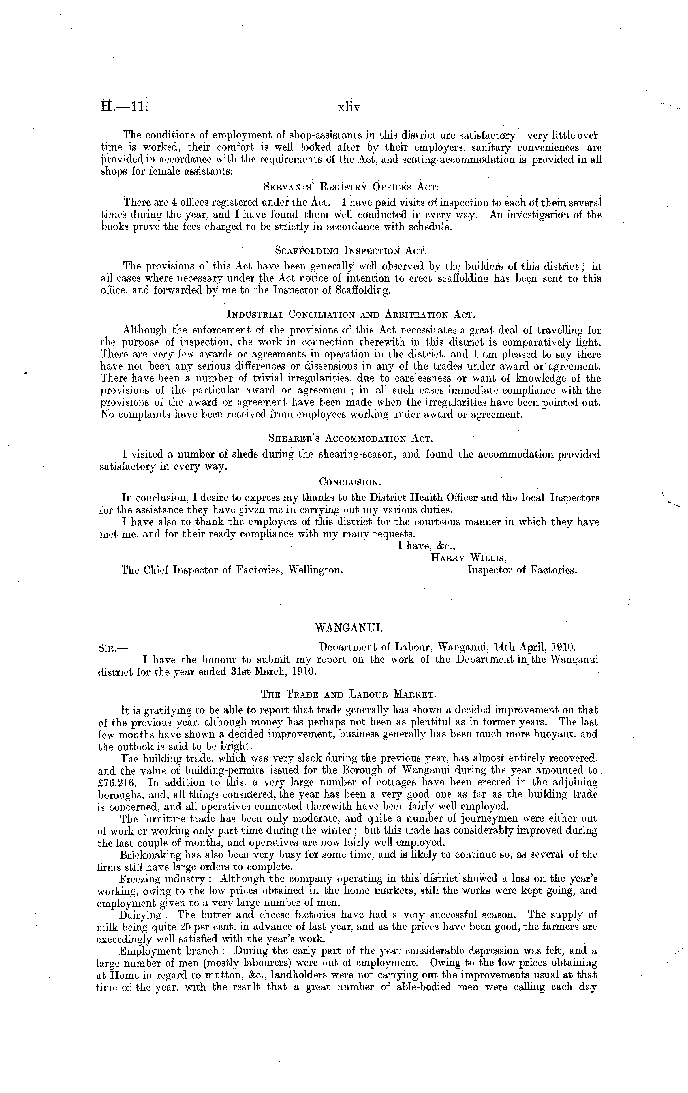 WANGANUI. Sir, — Department of Labour, Wanganui, 14th April, 1910. I have the honour to submit my report on the work of the Department in the Wanganui district for the year ended 31st March, 1910. The Trade and Labour Market. It is gratifying to be able to report that trade generally has shown a decided improvement on that of the previous year, although money has perhaps not been as plentiful as in former years. The last few months have shown a decided improvement, business generally has been much more buoyant, and the outlook is said to be bright. The building trade, which was very slack during the previous year, has almost entirely recovered, and the value of building-permits issued for the Borough of Wanganui during the year amounted to £76,216. In addition to this, a very large number of cottages have been erected in the adjoiningboroughs, and, all things considered, the year has been a very good one as far as the building trade is concerned, and all operatives connected therewith have been fairly well employed. The furniture trade has been only moderate, and quite a number of journeymen were either out of work or working only part time during the winter ; but this trade has considerably improved during the last couple of months, and operatives are now fairly well employed. Brickmaking has also been very busy for some time, and is likely to continue so, as several of the firms still have large orders to complete. Freezing industry : Although the company operating in this district showed a loss on the year's working, owing to the low prices obtained in the home markets, still the works were kept going, and employment given to a very large number of men. Dairying : The butter and cheese factories have had a very successful season. The supply of milk being quite 25 per cent, in advance of last year, and as the prices have been good, the farmers are exceedingly well satisfied with the year's work. Employment branch : During the early part of the year considerable depression was felt, and a large number of men (mostly labourers) were out of employment. Owing to the low prices obtaining at Home in regard to mutton, &c, landholders were not carrying out the improvements usual at that time of the year, with the result that a great number of able-bodied men were calling each day