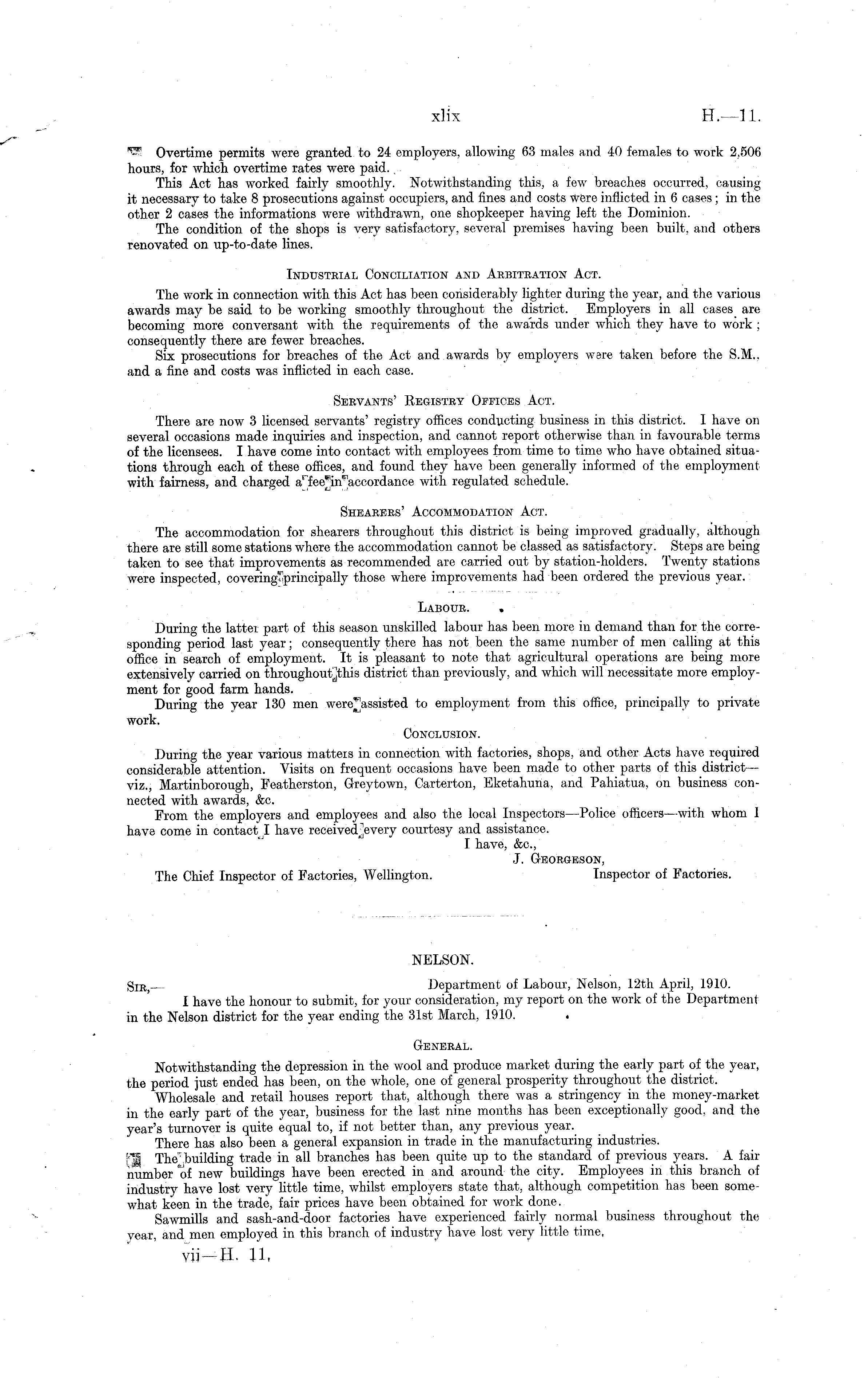 Overtime permits were granted to 24 employers, allowing 63 males and 40 females to work 2,506 hours, for which overtime rates were paid.. This Act has worked fairly smoothly. Notwithstanding this, a few breaches occurred, causing it necessary to take 8 prosecutions against occupiers, and fines and costs Were inflicted in 6 cases; in the other 2 cases the informations were withdrawn, one shopkeeper having left the Dominion. The condition of the shops is very satisfactory, several premises having been built, and others renovated on up-to-date lines. Industrial Conciliation and Arbitration Act. The work in connection with this Act has been considerably lighter during the year, and the various awards may be said to be working smoothly throughout the district. Employers in all cases_ are becoming more conversant with the requirements of the awaids under which, they have to work ; consequently there are fewer breaches. Six prosecutions for breaches of the Act and awards by employers were taken before the S.M., and a fine and costs was inflicted in each case. Servants' Registry Offices Act. There are now 3 licensed servants' registry offices conducting business in this district. I have on several occasions made inquiries and inspection, and cannot report otherwise than in favourable terms of the licensees. I have come into contact with employees from time to time who have obtained situations through each of these offices, and found they have been generally informed of the employment with fairness, and charged a r with regulated schedule. Shearers' Accommodation Act. The accommodation for shearers throughout this district is being improved gradually, although there are still some stations where the accommodation cannot be classed as satisfactory. Steps are being taken to see that improvements as recommended are carried out by station-holders. Twenty stations were inspected, covering'jprincipalry those where improvements had been ordered the previous year. Labour. . During the latter part of this season unskilled labour has been more in demand than for the corresponding period last year; consequently there has not been the same number of men calling at this office in search of employment. It is pleasant to note that agricultural operations are being more extensively carried on throughout]this district than previously, and which will necessitate more employment for good farm hands. During the year 130 men to employment from this office, principally to private work. Conclusion. During the year various matters in connection with factories, shops, and other Acts have required considerable attention. Visits on frequent occasions have been made to other parts of this district — viz., Martinborough, Featherston, Greytown, Carterton, Eketahuna, and Pahiatua, on business connected with awards, &c. From the employers and employees and also the local Inspectors —Police officers —with whom I have come in contact I have courtesy and assistance. I have, &c, J. Georgeson, The Chief Inspector of Factories, Wellington. Inspector of Factories. NELSON. S IB) Department of Labour, Nelson, 12th April, 1910. I have the honour to submit, for your consideration, my report on the work of the Department in the Nelson district for the year ending the 31st March, 1910. General. Notwithstanding the depression in the wool and produce market during the early part of the year, the period just ended has been, on the whole, one of general prosperity throughout the district. Wholesale and retail houses report that, although there was a stringency in the money-market in the early part of the year, business for the last nine months has been exceptionally good, and the year's turnover is quite equal to, if not better than, any previous year.^ There has also been a general expansion in trade in the manufacturing industries. f-fj trade in all branches has been quite up to the standard of previous years. A fair number of new buildings have been erected in and around the city. Employees in this branch of industry have lost very little time, whilst employers state that, although competition has been somewhat keen in the trade, fair prices have been obtained for work done. Sawmills and sash-and-door factories have experienced fairly normal business throughout the year, and men employed in this branch of industry have lost very little time,
