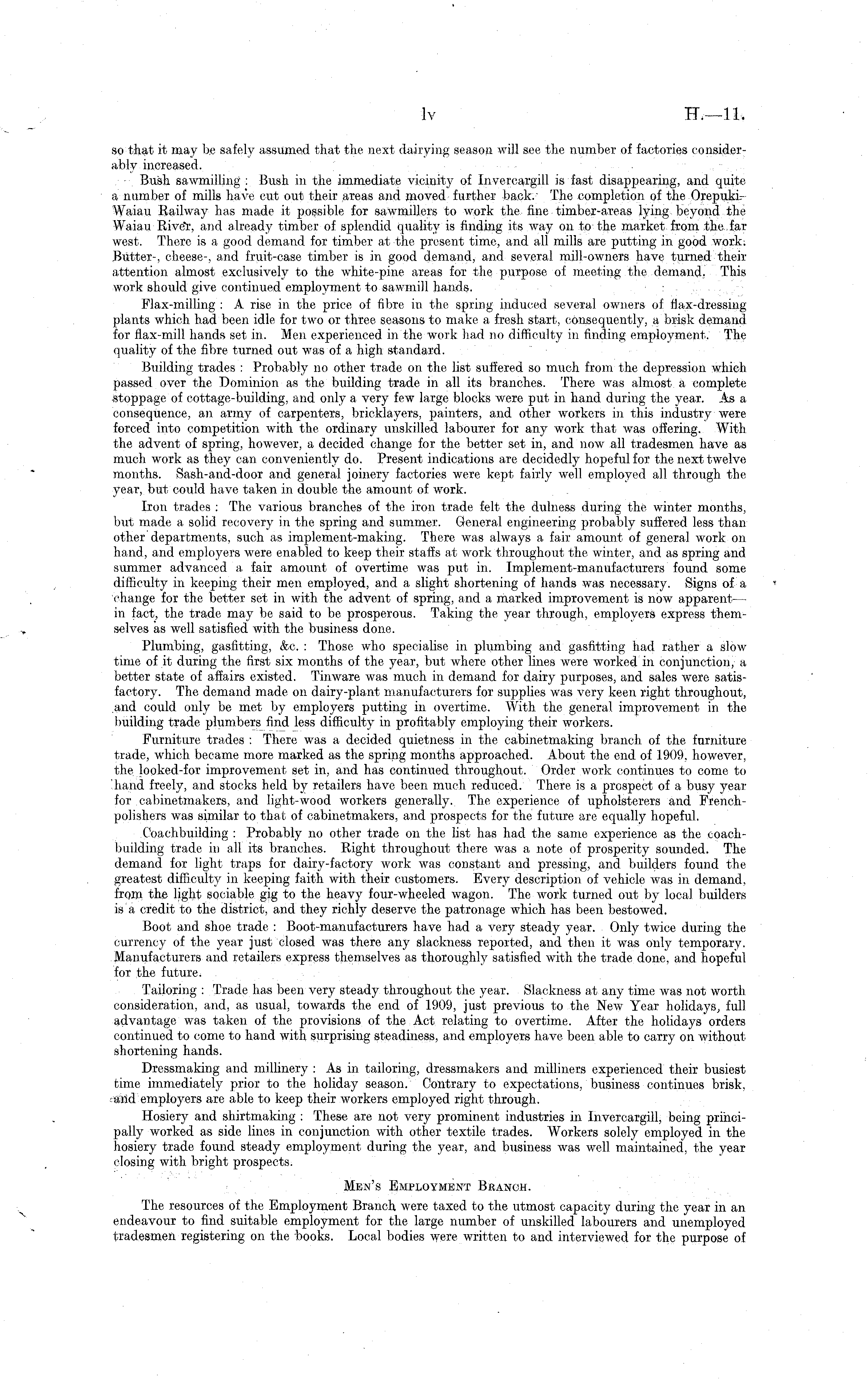 so that it may be safely assumed that the next dairying season will see the number of factories considerably increased. Bush sawmilling : Bush in the immediate vicinity of Invercargill is fast disappearing, and quite a number of mills have cut out their areas and moved further back/ The completion of the Orepukh Waiau Railway has made it possible for sawmillers to work the fine timber-areas lying beyond the. Waiau Rivet, and already timber of splendid quality is finding its way on to the market from the far west. There is a good demand for timber at the present time, and all mills are putting in good work. Butter-, cheese-, and fruit-case timber is in good demand, and several mill-owners have turned their attention almost exclusively to the white-pine areas for the purpose of meeting the demand. This work should give continued employment to sawmill hands. Flax-milling : A rise in the price of fibre in the spring induced several owners of flax-dressing plants which had been idle for two or three seasons to make a fresh start, consequently, a brisk demand for flax-mill hands set in. Men experienced in the work had no difficulty in finding employment. The quality of the fibre turned out was of a high standard. Building trades : Probably no other trade on the list suffered so much from the depression which passed over the Dominion as the building trade in all its branches. There was almost a complete stoppage of cottage-building, and only a very few large blocks were put in hand during the year. As a consequence, an army of carpenters, bricklayers, painters, and other workers in this industry were forced into competition with the ordinary unskilled labourer for any work that was offering. With, the advent of spring, however, a decided change for the better set in, and now all tradesmen have as much work as they can conveniently do. Present indications are decidedly hopeful for the next twelve months. Sash-and-door and general joinery factories were kept fairly well employed all through the year, but could have taken in double the amount of work. Iron trades : The various branches of the iron trade felt the dulness during the winter months, but made a solid recovery in the spring and summer. General engineering probably suffered less than other departments, such as implement-making. There was always a fair amount of general, work on hand, and employers were enabled to keep their staffs at work throughout the winter, and as spring and summer advanced a, fair amount of overtime was put in. Implement-manufacturers found some difficulty in keeping their men employed, and a slight shortening of hands was necessary. Signs of a change for the better set in with the advent of spring, and a marked improvement is now apparent — in fact, the trade may be said to be prosperous. Taking the year through, employers express themselves as well satisfied with the business done. Plumbing, gasfitting, &c. : Those who specialise in plumbing and gasfitting had rather a slow time of it during the first six months of the year, but where other lines were worked in conjunction, a better state of affairs existed. Tinware was much in demand for dairy purposes, and sales were satisfactory. The demand made on dairy-plant manufacturers for supplies was very keen right throughout, and could only be met by employers putting in overtime. With the general improvement in the building trade plumbers find less difficulty in profitably employing their workers. Furniture trades : There was a decided quietness in the cabinetmaking branch of the furniture trade, which became more marked as the spring months approached. About the end of 1909, however, the looked-for improvement set in, and has continued throughout. Order work continues to come to 'hand freely, and stocks held by retailers have been much reduced. There is a prospect of a busy year for cabinetmakers, and light-wood workers generally. The experience of upholsterers and Frenchpolishers was similar to that of cabinetmakers, and prospects for the future are equally hopeful. Coachbuilding : Probably no other trade on the list has had the same experience as the coachbuilding trade in all its branches. Right throughout there was a note of prosperity sounded. The demand for light traps for dairy-factory work was constant and pressing, and builders found the greatest difficulty in keeping faith with their customers. Every description of vehicle was in demand, from the light sociable gig to the heavy four-wheeled wagon. The work turned out by local builders is a credit to the district, and they richly deserve the patronage which has been bestowed. Boot and shoe trade : Boot-manufacturers have had a very steady year. Only twice during the currency of the year just closed was there any slackness reported, and then it was only temporary. Manufacturers and retailers express themselves as thoroughly satisfied with the trade done, and hopeful for the future. Tailoring : Trade has been very steady throughout the year. Slackness at any time was not worth consideration, and, as usual, towards the end of 1909, just previous to the New Year holidays, full advantage was taken of the provisions of the Act relating to overtime. After the holidays orders continued to come to hand with surprising steadiness, and employers have been able to carry on without shortening hands. Dressmaking and millinery : As in tailoring, dressmakers and milliners experienced their busiest time immediately prior to the holiday season. Contrary to expectations, business continues brisk, and employers are able to keep their workers employed right through. Hosiery and shirtmaking : These are not very prominent industries in Invercargill, being principally worked as side lines in conjunction with other textile trades. Workers solely employed in the hosiery trade found steady employment during the year, and business was well maintained, the year closing with bright prospects. Men's Employment Branch. The resources of t