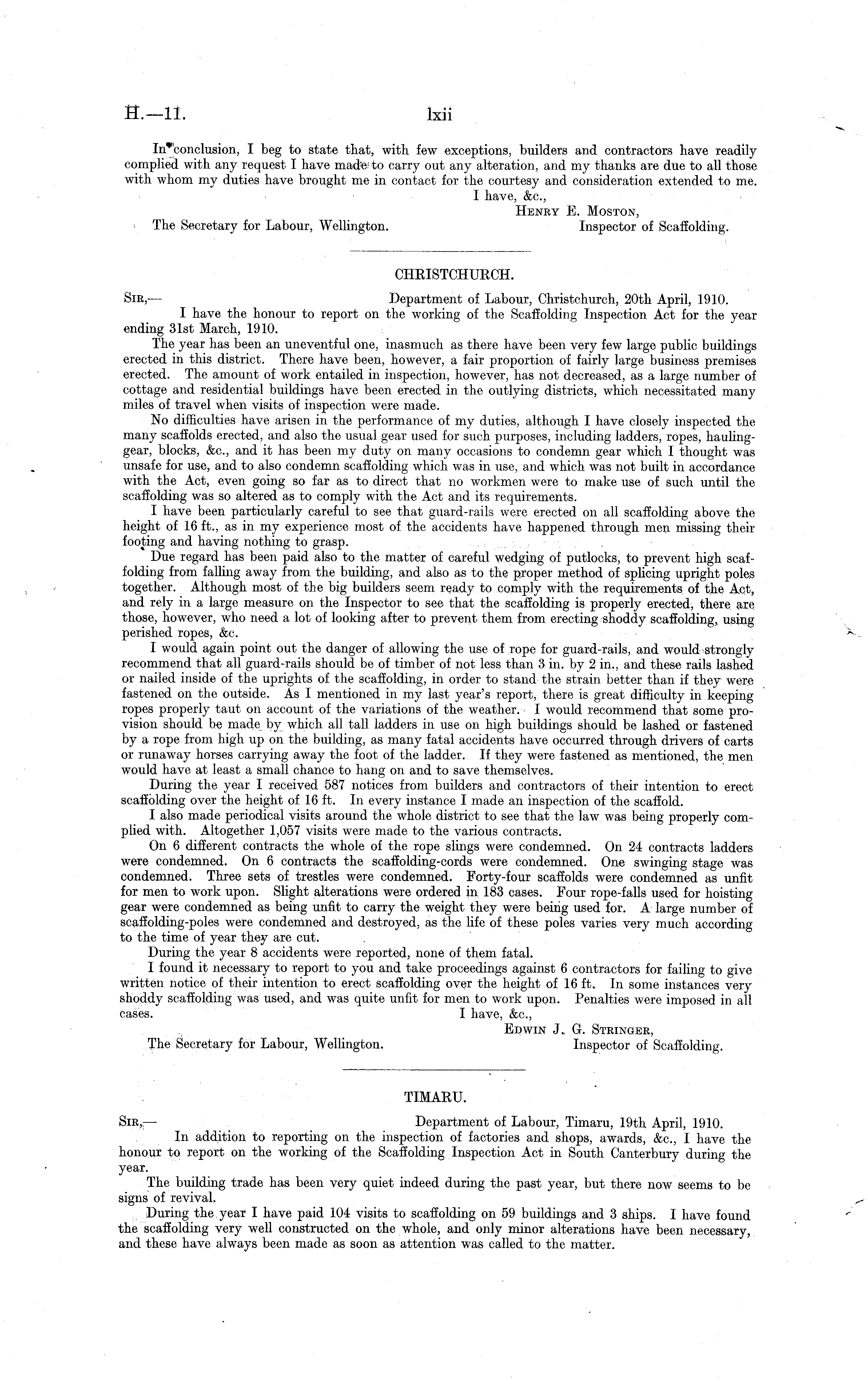 TIMARU. Sir,; — Department of Labour, Timaru, 19th April, 1910. In addition to reporting on the inspection of factories and shops, awards, &c, I have the honour to report on the working of the Scaffolding Inspection Act in South Canterbury during the year. The building trade has been very quiet indeed during the past year, but there now seems to be signs of revival. During the,year I have paid 104 visits to scaffolding on 59 buildings and 3 ships. I have found the scaffolding very well constructed on the whole, and only minor alterations have been necessary, and these have always been made as soon as attention was called to the matter.