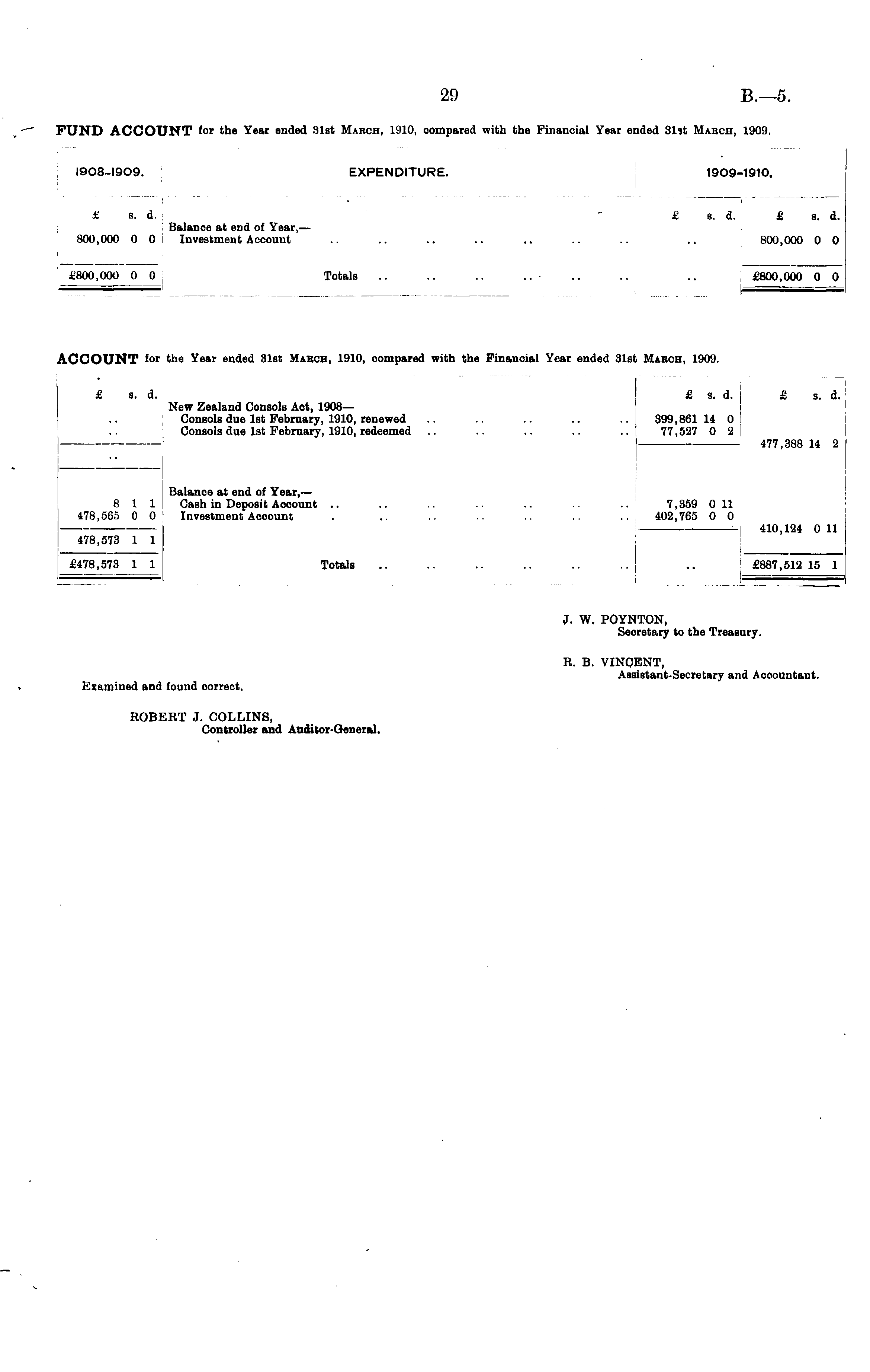 I9O8-I9O9. EXPENDITURE. 19O9-1910. £ s. d. £ s. d. £ a. d. Balance at end of Year, — 800,000 0 0 Investment Account .. .. .. .. .. .. .. .. 800,000 0 0 £800,000 0 0 Totals .. .. .. .. .. .. .. £800,000 0 0 ACCOUNT for the Year ended 31st Mabch, 1910, compared with the Financial Year ended 31st March, 1909. £ s. d. £ s. d. ] £ s. d. New Zealand Consols Aot, 1908— Consols due 1st February, 1910, renewed .. .. .. .. .. 399,86114 0 Coneols due 1st February, 1910, redeemed .. .. .. .. .. 77,527 0 2 1 477,388 14 2 Balance at end of Year, — 8 11 Cash in Deposit Aocount .. .. .-. .. .. .. .. 7,359 0 11 478,565 0 0 Investment Account . .. .. .. .. .. .. 402,765 0 0 410,124 0 11 478,573 1 1 £478,573 1 1 Totals .. .. .. .. .. .. .. £887,512 15 1 £478,573 1 1