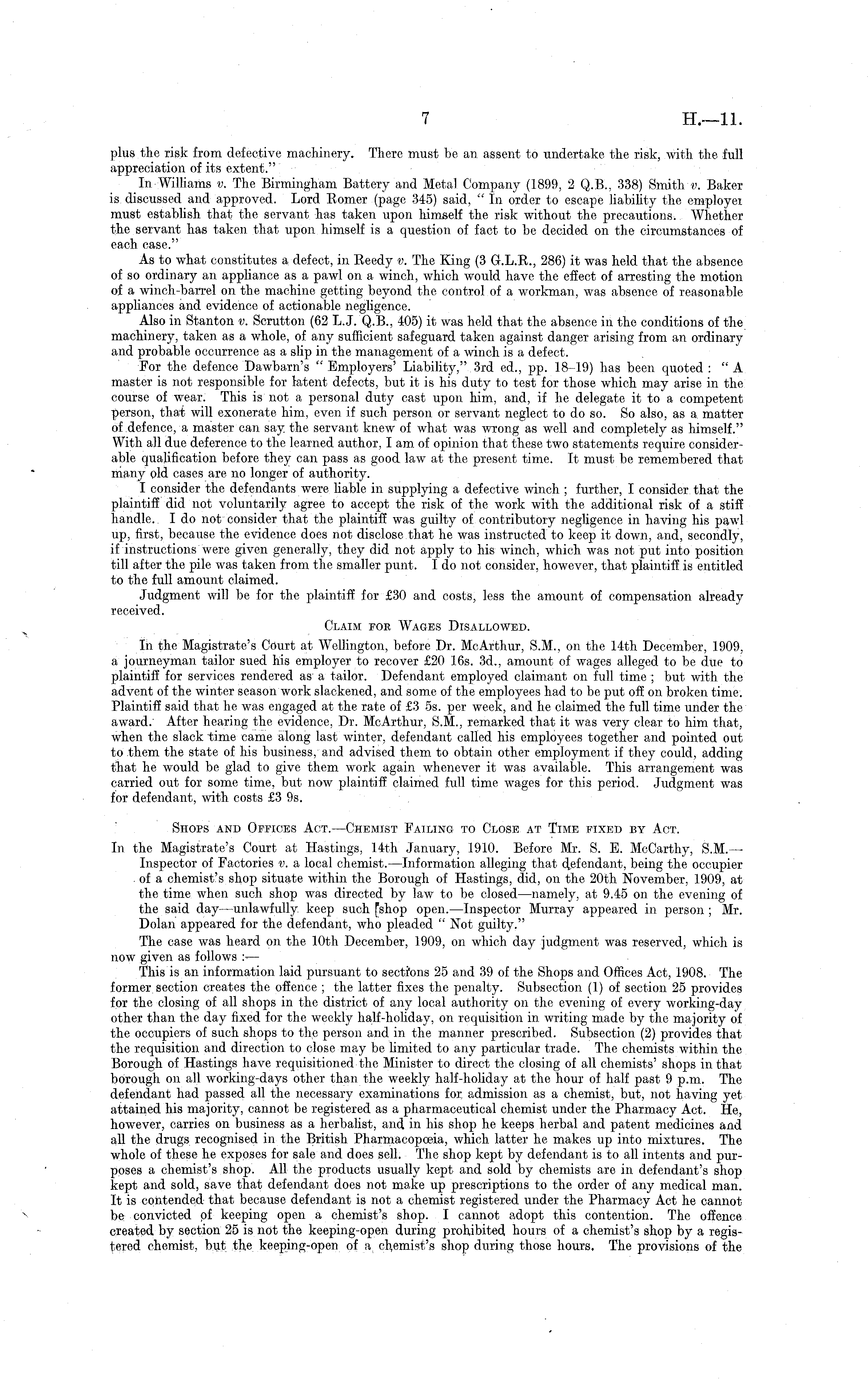 plus the risk from defective machinery. There must be an assent to undertake the risk, with the full appreciation of its extent." In Williams v. The Birmingham Battery and Metal Company (1899, 2 Q. 8., 338) Smith -v. Baker is discussed and approved. Lord Romer (page 345) said, "In order to escape liability the employer must establish that the servant has taken upon himself the risk without the precautions, Whether the servant has taken that upon himself is a question of fact to be decided on the circumstances of each case." As to what constitutes a defect, in Reedy v. The King (3 G.L.R., 286) it was held that the absence of so ordinary an appliance as a pawl on a winch, which would have the effect of arresting the motion of a winch-barrel on the machine getting beyond the control of a workman, was absence of reasonable appliances and evidence of actionable negligence. Also in Stanton v. Scrutton (62 L.J. Q. 8., 405) it was held that the absence in the conditions of the machinery, taken as a whole, of any sufficient safeguard taken against danger arising from an ordinary and probable occurrence as a slip in the management of a winch is a defect. For the defence Dawbarn's " Employers' Liability," 3rd cd., pp. 18-19) has been quoted : " A master is not responsible for latent defects, but it is his duty to test for those which may arise in the course of wear. This is not a personal duty cast upon him, and, if he delegate it to a competent person, that will exonerate him, even if such person or servant neglect to do so. So also, as a matter of defence, a master can say the servant knew of what was wrong as well and completely as himself." With all due deference to the learned author, I am of opinion that these two statements require considerable qualification before they can pass as good law at the present time. It must be remembered that many old cases are no longer of authority. I consider the defendants were liable in supplying a defective winch ; further, I consider that the plaintiff did not voluntarily agree to accept the risk of the work with the additional risk of a stiff handle. Ido not consider that the plaintiff was guilty of contributory negligence in having his pawl up, first, because the evidence does not disclose that he was instructed to keep it down, and, secondly, if instructions were given generally, they did not apply to his winch, which was not put into position till after the pile was taken from the smaller punt. Ido not consider, however, that plaintiff is entitled to the full amount claimed. Judgment will be for the plaintiff for £30 and costs, less the amount of compensation already received. Claim for Wages Disallowed. In the Magistrate's Court at Wellington, before Dr. McArthur, S.M., on the 14th December, 1909, a journeyman tailor sued his employer to recover £20 16s. 3d., amount of wages alleged to be due to plaintiff for services rendered as a tailor. Defendant employed claimant on full time ; but with the advent of the winter season work slackened, and some of the employees had to be put off on broken time. Plaintiff said that he was engaged at the rate of £3 ss. per week, and he claimed the full time under the award. After hearing the evidence, Dr. McArthur, S.M., remarked that it was very clear to him that, when the slack time came along last winter, defendant called his employees together and pointed out to them the state of his business, and advised them to obtain other employment if they could, adding that he would be glad to give them work again whenever it was available. This arrangement was carried out for some time, but now plaintiff claimed full time wages for this period. Judgment was for defendant, with costs £3 9s. Shops and Offices Act. —Chemist Failing to Close at Time fixed by Act. In the Magistrate's Court at Hastings, 14th January, 1910. Before Mr. S. E. McCarthy, S.M.— Inspector of Factories v. a local chemist. —Information alleging that defendant, being the occupier .of a chemist's shop situate within the Borough of Hastings, did, on the 20th November, 1909, at the time when such shop was directed by law to be closed —namely, at 9.45 on the evening of the said day —unlawfully keep such [shop open. —Inspector Murray appeared in person ; Mr. Dolan appeared for the defendant, who pleaded " Not guilty." The case was heard on the 10th December, 1909, on which day judgment was reserved, which is now given as follows :— This is an information laid pursuant to sections 25 and 39 of the Shops and Offices Act, 1908. The former, section creates the offence ; the latter fixes the penalty. Subsection (1) of section 25 provides for the closing of all shops in the district of any local authority on the evening of every working-day other than the day fixed for the weekly half-holiday, on requisition in writing made by the majority of the occupiers of such shops to the person and in the manner prescribed. Subsection (2) provides that the requisition and direction to close may be limited to any particular trade. The chemists within the Borough of Hastings have requisitioned the Minister to direct the closing of all chemists' shops in that borough on all working-days other than the weekly half-holiday at the hour of half past 9 p.m. The defendant had passed all the necessary examinations for. admission as a chemist, but, not having yet attained his majority, cannot be registered as a pharmaceutical chemist under the Pharmacy Act. He, however, carries on business as a herbalist, and in his shop he keeps herbal and patent medicines and all the drugs recognised in the British Pharmacopoeia, which latter he makes up into mixtures. The whole of these he exposes for sale and does sell. The shop kept by defendant is to all intents and purposes a chemist's shop. AH the products usually kept and sold by chemists are in defendant's shop kept and sold, save that defendant does not make up prescriptions to the order of any medical man. It is contended tha