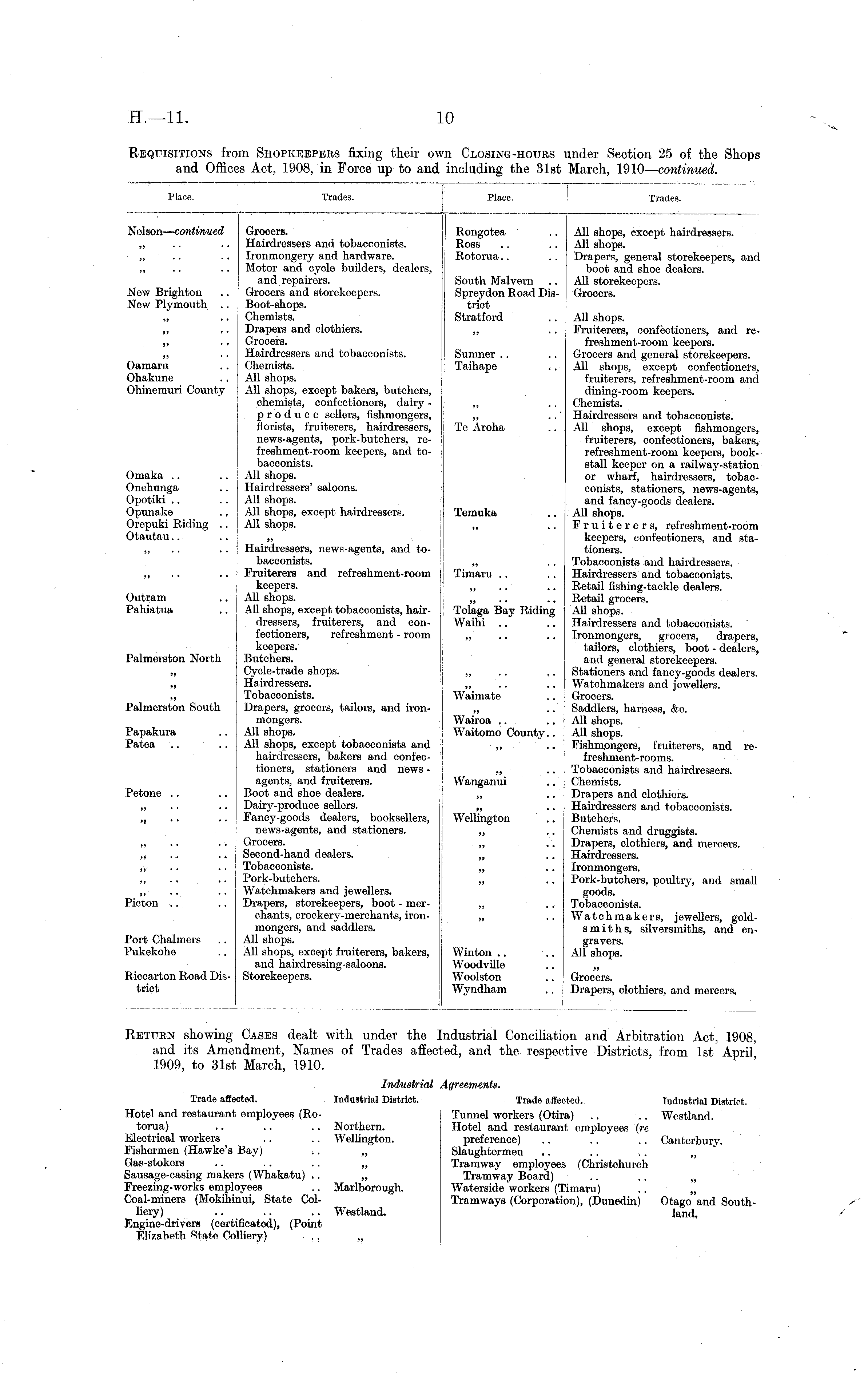 Place. I Trades. Plane. Trades. Nelson-— continued Grocers. Hairdressers and tobacconists. Ironmongery and hardware. Motor and cycle builders, dealers, and repairers. Grocers and storekeepers. Boot-shops. Chemists. Drapers and clothiers. Grocers. Hairdressers and tobacconists. Chemists. All shops. All shops, except bakers, butchers, chemists, confectioners, dairy - produce sellers, fishmongers, florists, fruiterers, hairdressers, news-agents, pork-butchers, re-freshment-room keepers, and tobacconists. All shops. Hairdressers' saloons. All shops. All shops, except hairdressers. All shops. Rongotea Ross .. Rotorua All shops, except hairdressers. All shops. Drapers, general storekeepers, and boot and shoe dealers. All storekeepers. Grocers. New Brighton New Plymouth .. South Malvern Spreydon Road District Stratford S5 ■ ' Oamaru Ohakune Ohinemuri County Omaka Onehunga Opotiki Opunake Orepuki Riding .. Otautau Outram Pahiatua Palmerston North Hairdressers, news-agents, and tobacconists. Fruiterers and refreshment-room keepers. All shops. All shops, except tobacconists, hairdressers, fruiterers, and confectioners, refreshment - room keepers. Butchers. Cycle-trade shops. Hairdressers. Tobacconists. Drapers, grocers, tailors, and ironmongers. All shops. All shops, except tobacconists and hairdressers, bakers and confectioners, stationers and news • agents, and fruiterers. Boot and shoe dealers. Dairy-produce sellers. Fancy-goods dealers, booksellers, news-agents, and stationers. Grocers. Second-hand dealers. Tobacconists. Pork-butchers. Watchmakers and jewellers. Drapers, storekeepers, boot - merchants, crockery-merchants, ironmongers, and saddlers. All shops. All shops, except fruiterers, bakers, and hairdressing-saloons. Storekeepers. I Sumner .. ; Taihape Te Aroha Tomuka „ 11 Timaru Tolaga Bay Riding 1 Waihi .. All shops. Fruiterers, confectioners, and re-freshment-room keepers. Grocers and general storekeepers. All shops, except confectioners, fruiterers, refreshment-room and dining-room keepers. Chemists. Hairdressers and tobacconists. All shops, except fishmongers, fruiterers, confectioners, bakers, refreshment-room keepers, bookstall keeper on a railway-station or wharf, hairdressers, tobacconists, stationers, news-agents, and fancy-goods dealers. All shops. Fruiterers, refreshment-room keepers, confectioners, and stationers. Tobacconists and hairdressers. Hairdressers and tobacconists. Retail fishing-tackle dealers. Retail grocers. All shops. Hairdressers and tobacconists. Ironmongers, grocers, drapers, tailors, clothiers, boot - dealers, and general storekeepers. Stationers and fancy-goods dealers. Watchmakers and jewellers. Grocers. Saddlers, harness, &e. All shops. All shops. Fishmongers, fruiterers, and re-freshment-rooms. Tobacconists and hairdressers. Chemists. Drapers and clothiers. Hairdressers and tobacconists. Butchers. Chemists and druggists. Drapers, clothiers, and mercers. Hairdressers. Ironmongers. Pork-butchers, poultry, and small goods. Tobacconists. Watchmakers, jewellers, goldsmiths, silversmiths, and engravers. All shops. >f >» Waimate Palmerston South Wairoa Waitomo County.. Papakura Patea Petone Wanganui >> • - Wellington Picton " Port Chalmers Pukekohe Winton Woodville Woolston Wyndhatn Riccarton Road District Grocers. Drapers, clothiers, and mercers.