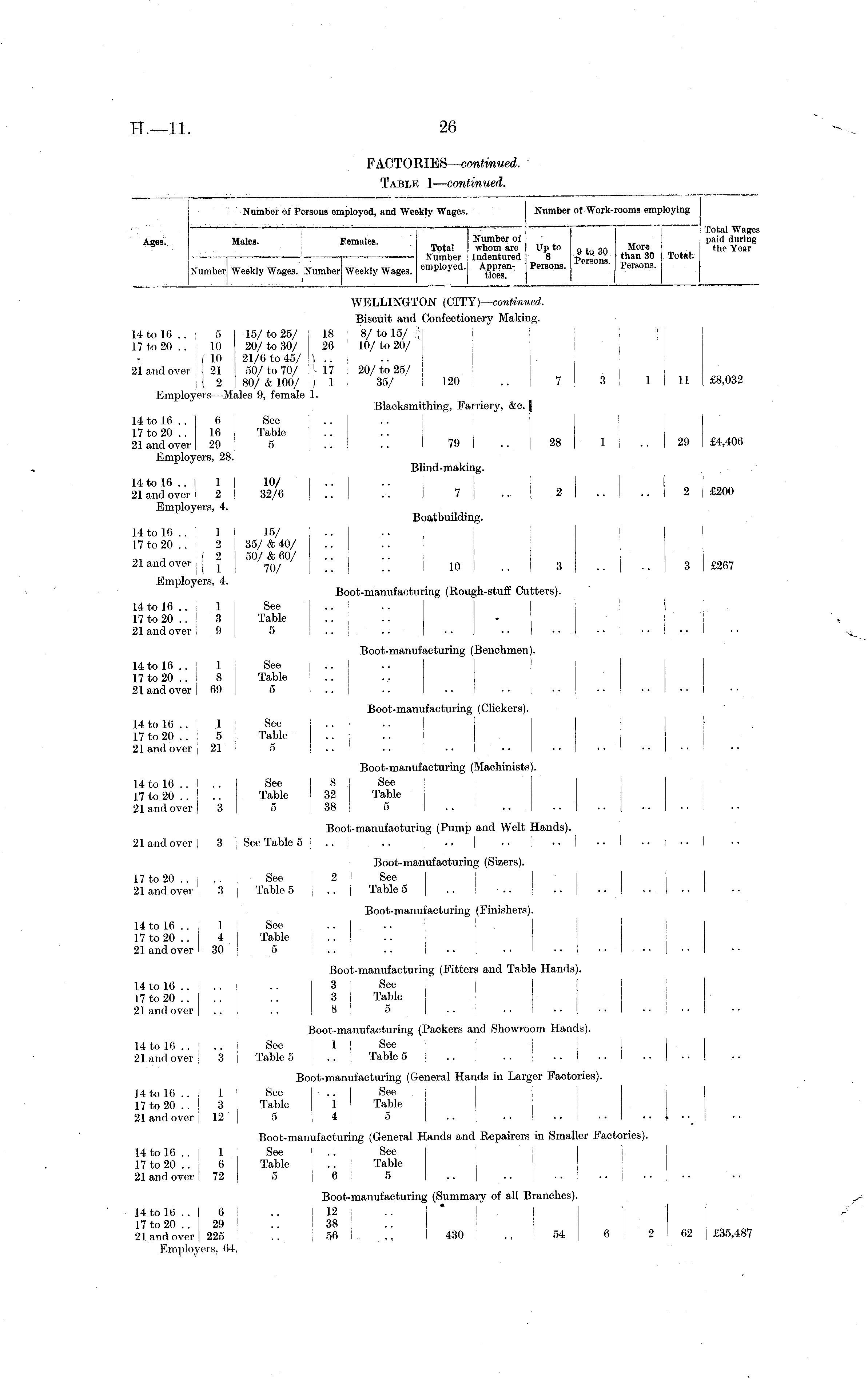I Number o( Work-rooms employing Number of Persons employed, and Weekly Wages. Ages. Males. Females. females. „ , , Total , Number Weekly Wages, Number of whom are Indentured Apprentices. Up to a i,, Qn More 8 llrsom than30 Totil - Persons. lorsons - Persons. Total Wages paid during the Year Number Weekly Wages. Number WELLINGTON (CITY)— continued. Biscuit and Confectionery Making. L4tol6.. : 5 15/to 25/ [ 18 8/ to 15/ || 17 to 20 .. ; 10 20/ to 30/ 26 10/ to 20/ f 10 21/6 to 45/ ! "I .. ! 21 and over -: 21 50/ to 70/ ;- 17 20/ to 25/ ( 2 80/ & 100/ i) 1 35/ 120 | 7 3 | 1 Employers—Males 9, female 1. Blacksmithing, Farriery, &c. | 14 to 16 .. 6| See 17 to 20 .. 16 j Table 21 and over 29 I 5 I .. .. I 79 i .. 28 1 | .. Employers, 28. Blind-making. 14 to 16 .. I 1 I 10/ .. .. I 21 and overi 2 32/6 .. .. 7 j .. [ 2 Employers, 4. Boatbuilding. 14 to 16 .. ': 1 I 15/ ! .. 17 to 20 .. 2 ! 35/ &40/ .. .. i O1 i 2 50/ & 60/ 21 and over.j l ?()/ ;■• | 10 I .. i 3 Employers, 4. Boot-manufacturing (Rough-stuff Cutters). 14 to 16 .. 1 See .. .. [ 17 to 20 . . 3 Table 21 and over 9 | 5 i 11 £8,032 29 £4,406 2 j £200 3 £267 II Boot-manufacturing (Benchmen). 14 to 16 .. 1 See I • •' I 17 to 20 .. 8 Table 21 and over 69 5 Boot-manufacturing (Clickers). 14 to 16 .. 1 : See .. .. | 17 to 20 .. 5 Table 21 and over 21 5 .. .. I Boot-manufacturing (Machinists). 14 to 16 .. i .. I See 8 See 17 to 20 . . ! .. Table 32 Table 21 and over | 3 5 38 5 .. .. Boot-manufacturing (Pump and Welt Hands). 21 and over i 3 I See Table 5 | .. j .. ! .. | •• ! .-I •• I Boot-manufacturing (Sizers). 17 to 20 See 2 See 21 and over , 3 Table 5 .. Table 5 Boot-manufacturing (Finishers). 14 to 16 .. 1 j See 17 to 20 .. 4 Table 21 and over 30 5 I .. Boot-manufacturing (Fitters and Table Hands). 14 to 16 .. ; .. .. 3 1 See 17 to 20 .. .. .. 3 ! Table 21 and over .. .. 8 5 Boot-manufacturing (Packers and Showroom Hands). 14 to 16 .. J .. See 1 See 21 and over j 3 i Table 5 .. Table 5 Boot-manufacturing (General Hands in Larger Factories). 14 to 16 .. 1 See ... 1 See . : 17 to 20 .. 3 ' Table I Table 21 and over j 12' | 5 | 4 5 ! ! .. I LI .. Boot-manufacturing (General Hands and Repairers in Smaller Factories). 14 to 16 .. 1 ( See ' .. See 17 to 20 .. I 6 Table ' .. Table 21 and over I 72 5 j 6 5 .. J .. .. | Boot-manufacturing (Summary of all Branches). 14 to 16 .. 6 .. 12 17 to 20 .. 29 .. 38 21 and over 225 .. 56 i ,, i 430 | ,, 54 6 J 2 Employers, 64, 62 £35,487