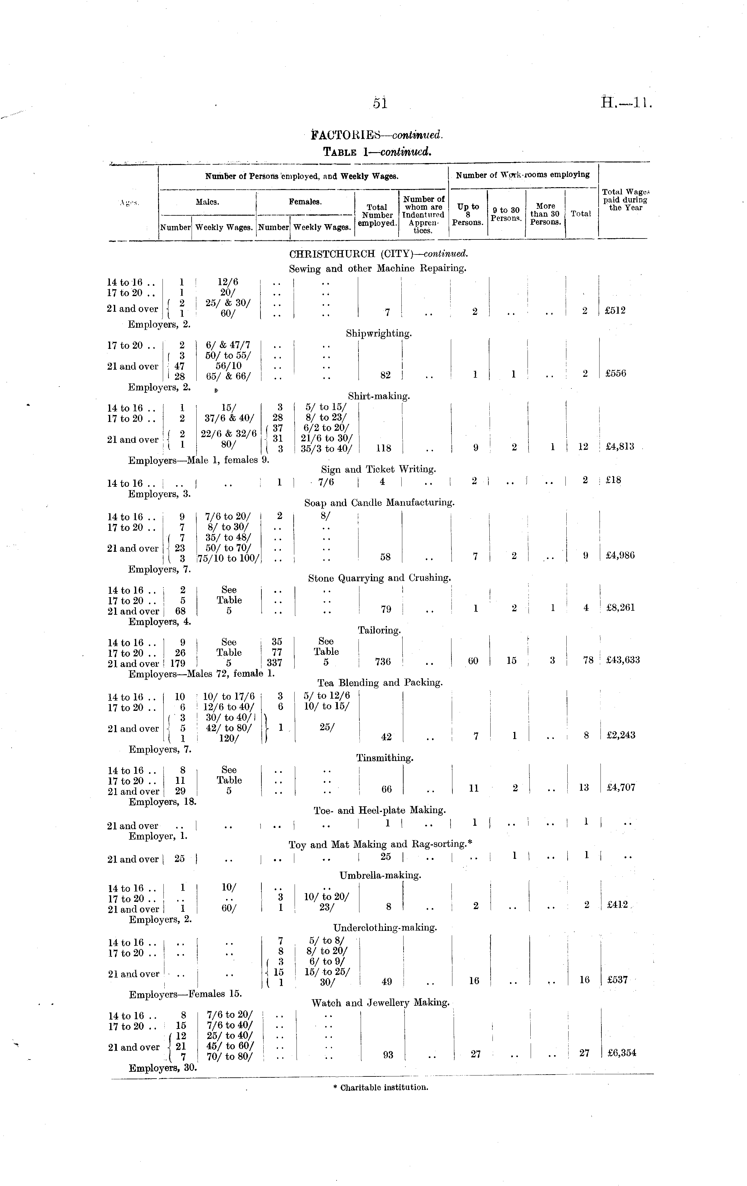 Number of Persons employed, and Weekly Wages. Numl ier ol ; rooms empl ing AgfS. Males. Females. Number «t j T pgdSg Number Indentured 8 person" than 30 Total , i*t" ,« «r T l Utt i, TTr employed. Appren- Persons. " ' Persons, j Number Weekly Wages. Number Weekly Wages. f J es Males. Females. CHR1STCHURCH (CITY)—continued. Sewing and other Machine Repairing. 14 to 16 .. 1 ' 12/6 J .. J 17 to 20 .. 1 20/ .. o, a f 2 I 25/ & 30/ 21 and over J J l 60/ .. .. 7 •■ 2 Employers, 2. Shipwrighting. 17 to 20 .. 2 6/ & 47/7 .. .. [ ( 3 50/to 55/ 21 and over ! 47 56/10 I 28 I 65/ & 66/ j .. 82 I .. 1 Employers, 2. t Shirt-making. 14 to 16 .. 1 15/ [31 5/ to 15/ j 17 to 20 .. 2 37/6 & 40/ 28 ! 8/ to 23/ „ H ! i 2 22/6 & 32/6 (37 «{**% 21 and over ■ •! , ' aft/ ' , 31 21/6 to 30/ < x m/ (■ 3 35/3 to 40/ I 118 .. j 9 | Employers—Male 1, females 9. Sign and Ticket Writing. 14 to 16 .. I .. I .. l]-7/6 I 4 I .. ! 2 I Employers, 3. Soap and Candle Manufacturing. 14 to 16 .. 9 7/6 to 20/ i 2 j 8/ 17 to 20 .. 7 8/ to 30/ (7 35/ to 48/ 21 and over j 23 50/ to 70/ j ( 3 175/10 to 100/ .. .. 58 .. 7 j Employers, 7. Stone Quarrying and Crushing, 14 to 16 .. i 2 See 17 to 20 .. ! 5 Table .... ! 21 and over j 68 5 .. .. 7-9,.. | 1 Employers, 4. Tailoring. 14 to 16 .. 9 See 35 See 17 to 20 .. 26 Table 77 Table 21 and over: 179 ; 5 j 337 5 736 .. 60 Employers —Males 72, female 1. Tea Blending and Packing. 14 to 16 .. 10 I 10/ to 17/6 3 | 5/ to 12/6 j 17 to 20 .. 6 ' 12/6 to 40/ 6 10/ to 15/ ( 3 i 30/to 40/1 ) 21 and over \ 5 ' 42/to 80/ \ 1 , 25/ ( 1 I 120/ I) 42 .. 7 Employers, 7. Tinsmithing. 14 to 16 .. [ 8 See 17 to 20 .. ; 11 Table 21 and over [29 5 .. .. ■ 66 .. 11 Employers, 18. Toe- and Heel-plate Making. 21 and over | .. I ... | •• 11 •• * I Employer, 1. Toy and Mat Making and Rag-sorting.* 21 and over[ 25 ] .. I ■• I •• 1 25 I ..[... I 1 j I [ 1 I I 2 I .. I 2 2 I15 j 1 2 1 I 1 [ I 2 £512 2 I £556 1 1 12 £4,813 .. I 2 i £18 .. 9 i £4,986 1 I 4 J £8,261 3 J 78 £43,633 8-1 £2,243 .. I 13 £4,707 .. ! 1 I .. 2 2 £512 £556 £512 Umbrella-making. 14 to 16 .. ! 1 10/ .. .. I 17 to 20 . . ! .. • • 3 10/ to 20/ 21 and over I 1 60/ I 1 | 23/ 8 .. 2 Employers, 2. Underclothing-making. 14 to 16 .. I .. .. 7 5/ to 8/ ■ 17 to 20 .. \ .. .. 8 I 8/ to 20/ ( 3 ; 6/to 9/ 21 and over 1 .. .. \ 15 15/to 25/ | { 1 30/ i 49 ! 16 Employers —Females 15. Watch and Jewellery Making. 14 to 16 .. 8 7/6 to 20/ I .. I 17 to 20 .. 15 7/6 to 40/ j .. .. | ( 12 25/ to 40/ I .. 21 and over \ 21 45/to 60/ .. .( 7 70/to 80/ I"".: •• 93 •• 27 Employers, 30. i i ■ j 2 I £412. 16 £537 .. I 27 £6,354 £537 £6,354 itii in.