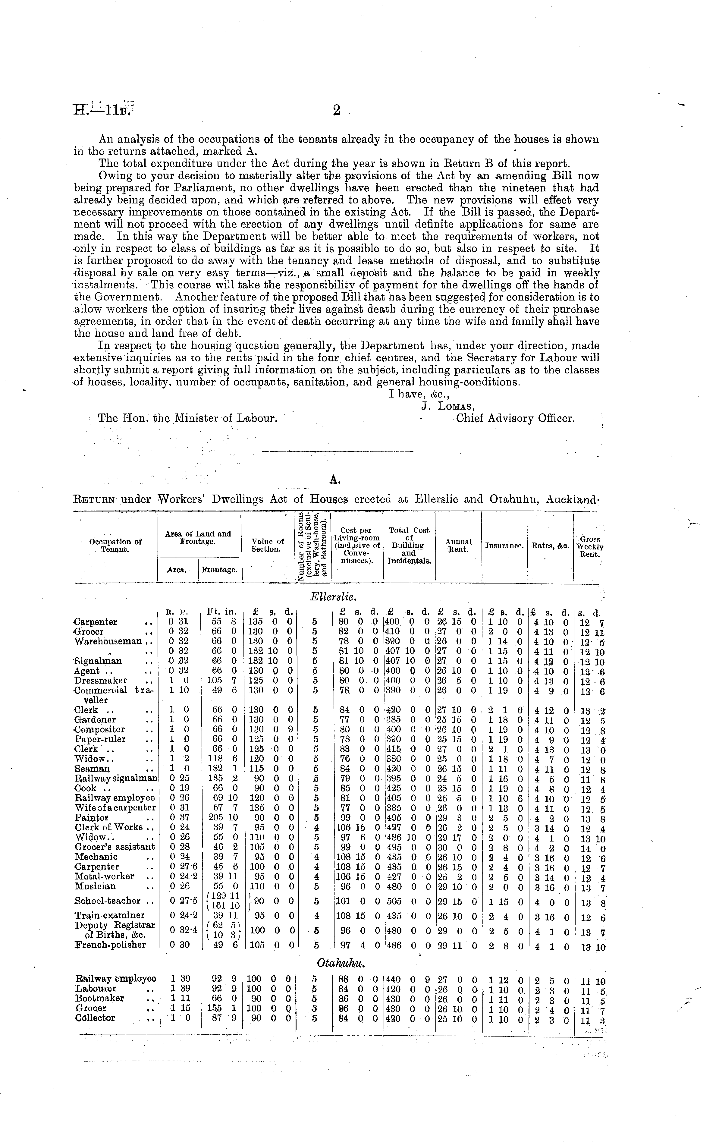 An analysis of the occupations of the tenants already in the occupancy of the houses is shown in the returns attached, marked A. The total expenditure under the Act during the year is shown in Eeturn B of this report. Owing to your decision to materially alter the provisions of the Act by an amending Bill now being prepared for Parliament, no other dwellings have been erected than the nineteen that had already being decided upon, and which are referred to above. The new provisions will effect very necessary improvements on those contained in the existing Act. If the Bill is passed, the Department will not proceed with the erection of any dwellings until definite applications for same are made. In this way the Department will be better able to meet the requirements of workers, not only in respect to class of buildings as far as it is possible to do so, but also in respect to site. It is further proposed to do away with the tenancy and lease methods of disposal, and to substitute disposal by sale on very easy terms—viz., a small deposit and the balance to be paid in weekly instalments. This course will take the responsibility of payment for the dwellings off the hands of the Government. Another feature of the proposed Bill that has been suggested for consideration is to allow workers the option of insuring their lives against death during the currency of their purchase agreements, in order that in the event of death occurring at any time the wife and family shall have the house and land free of debt. In respect to the housing question generally, the Department has, under your direction, made -extensive inquiries as to the rents paid in the four chief centres, and the Secretary for Labour will shortly submit a report giving full information on the subject, including particulars as to the classes -of houses, locality, number of occupants, sanitation, and general housing-conditions. I have, &c, J. Lomas, The Hon, the Minister of Labour; Chief Advisory Officer.