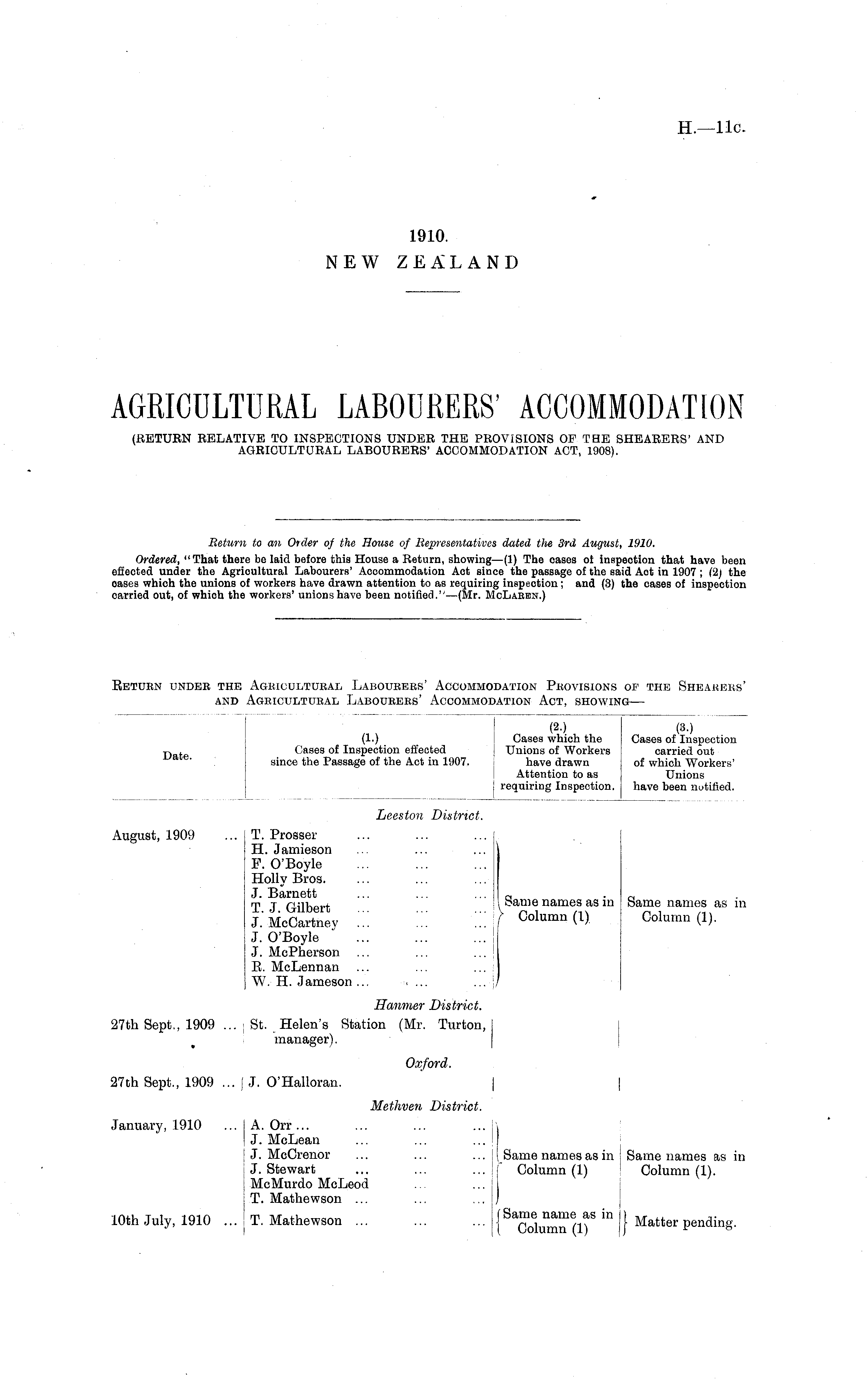 Return to an Order of the House of Representatives dated the 3rd August, 1910. Ordered, "That there be laid before this House a Return, showing—(l) The cases ot inspection that have been effected under the Agricultural Labourers' Accommodation Act since the passage of the said Aot in 1907 ; (2) the oases which the unions of workers have drawn attention to as requiring inspection; and (3) the cases of inspection carried out, of which the workers' unions have been notified."—(Mr. McLaben.)