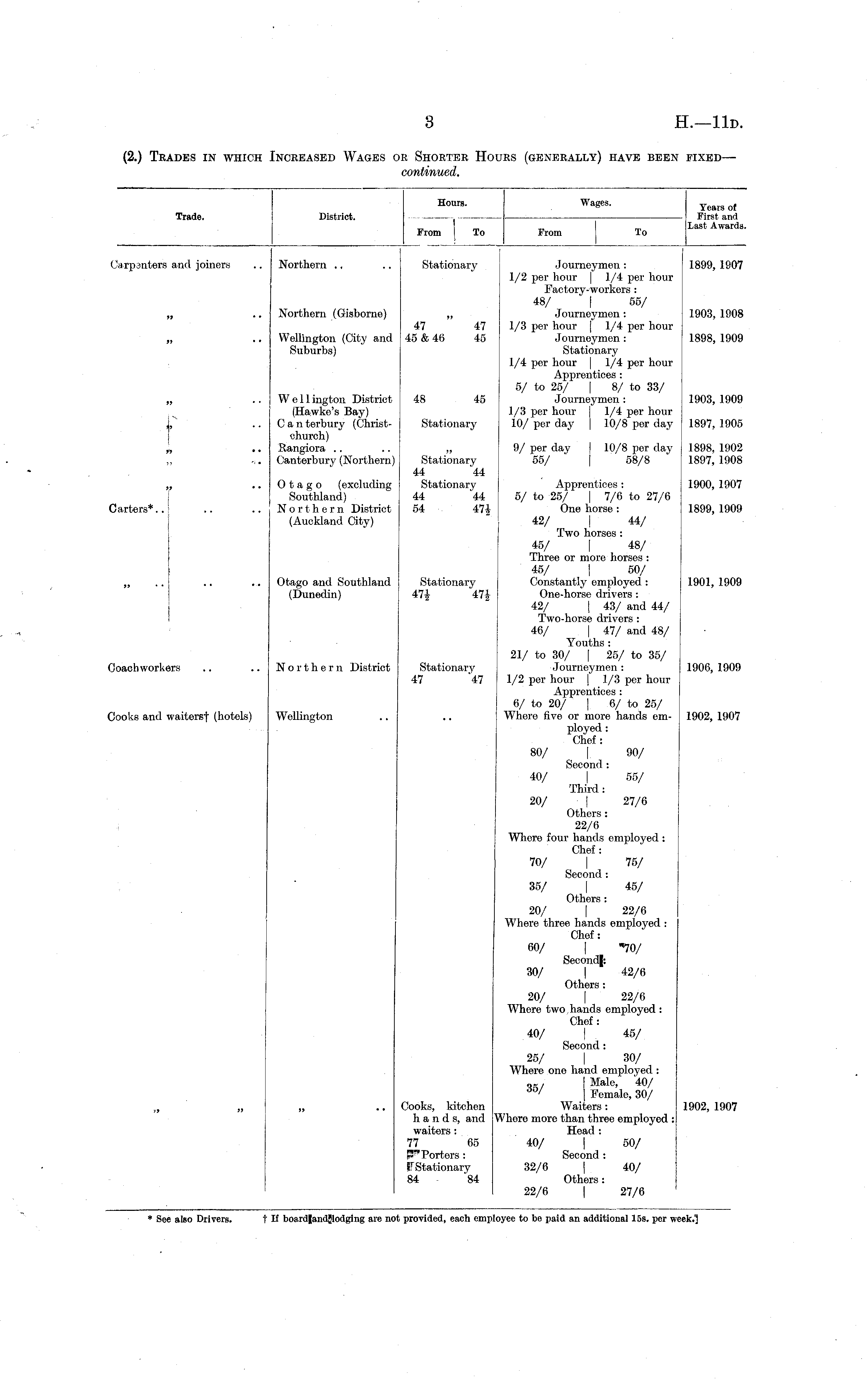Trade. District. Hours. From Hours. 3. To Wages. Years of First and Last Awards From To Carpenters and joiners Northern Stationary Journeymen : 1/2 per hour | 1/4 per hour Factory-workers : 48/ I 55/ Journeymen : I 1/3 per hour | 1/4 per hour Journeymen : Stationary 1/4 per hour j 1/4 per hour Apprentices : 5/ to 25/ j 8/ to 33/ Journeymen : 1/3 per hour ] 1/4 per hour 10/ per day | 10/8 per day 1899, 1907 » Northern (Gisborne) 1903, 1908 s> • • Wellington (City and Suburbs) 47 47 45 & 46 45 1898, 1909 »> • ■ Well ington District (Hawke's Bay) Can terbury (Christchurch) Rangiora Canterbury (Northern) 48 45 1903, 1909 f Stationary 1897, 1905 Stationary 44 44 Stationary 44 44 54 47J 9/ per day ' 10/8 per day 55/ j 58/8 1898, 1902 1897, 1908 t Carters*.. O t a g o (excluding Southland) Northern District (Auckland City) Apprentices : 5/ to 25/ I 7/6 to 27/6 One horse : 42/ I 44/ Two horses : 45/ I 48/ Three or more horses : 45/ I 50/ Constantly employed : One-horso drivers : 42/ I 43/ and 44/ Two-horse drivers : 46/ I 47/ and 48/ Youths : 21/ to 30/ I 25/ to 35/ Journeymen : 1/2 per hour j 1/3 per hour Apprentices : 6/ to 20/ I 6/ to 25/ Where five or more hands employed : Chef: 80/ I 90/ Second : 40/ I 55/ Third : 20/ ] 27/6 Others : 22/6 Where four hands employed : Chef : 70/ I 75/ Second : 35/ I 45/ Others : 20/ [ 22/6 Where three hands employed : Chef: 60/ I -"70/ Secondl: 30/ I 42/6 Others : 20/ I 22/6 Where two hands employed : Chef: 40/ I 45/ Second : 25/ I 30/ Where one hand employed : ,,-, Male, 40/ d0/ Female, 30/ Waiters : Where more than three employed : Head : 40/ I 50/ Second: 32/6 I 40/ Others : 22/6 I 27/6 1900, 1907 1899, 1909 ,, . . . . . * Otago and Southland (Dunedin) Stationary 47J 47J 1901, 1909 Ooachworkers Northern District Stationary 47 47 1906, 1909 Cooks and waitersf (hotels) Wellington 1902, 1907 » >} Cooks, kitchen hands, and waiters: 77 65 ""Porters: IF Stationary 84 '84 1902, 1907 • Si Jso Drivers If board! ;,-iK Modi are not >rovided, each em; >Io; <ee to be >aid an additional 15s. >er reek. ,
