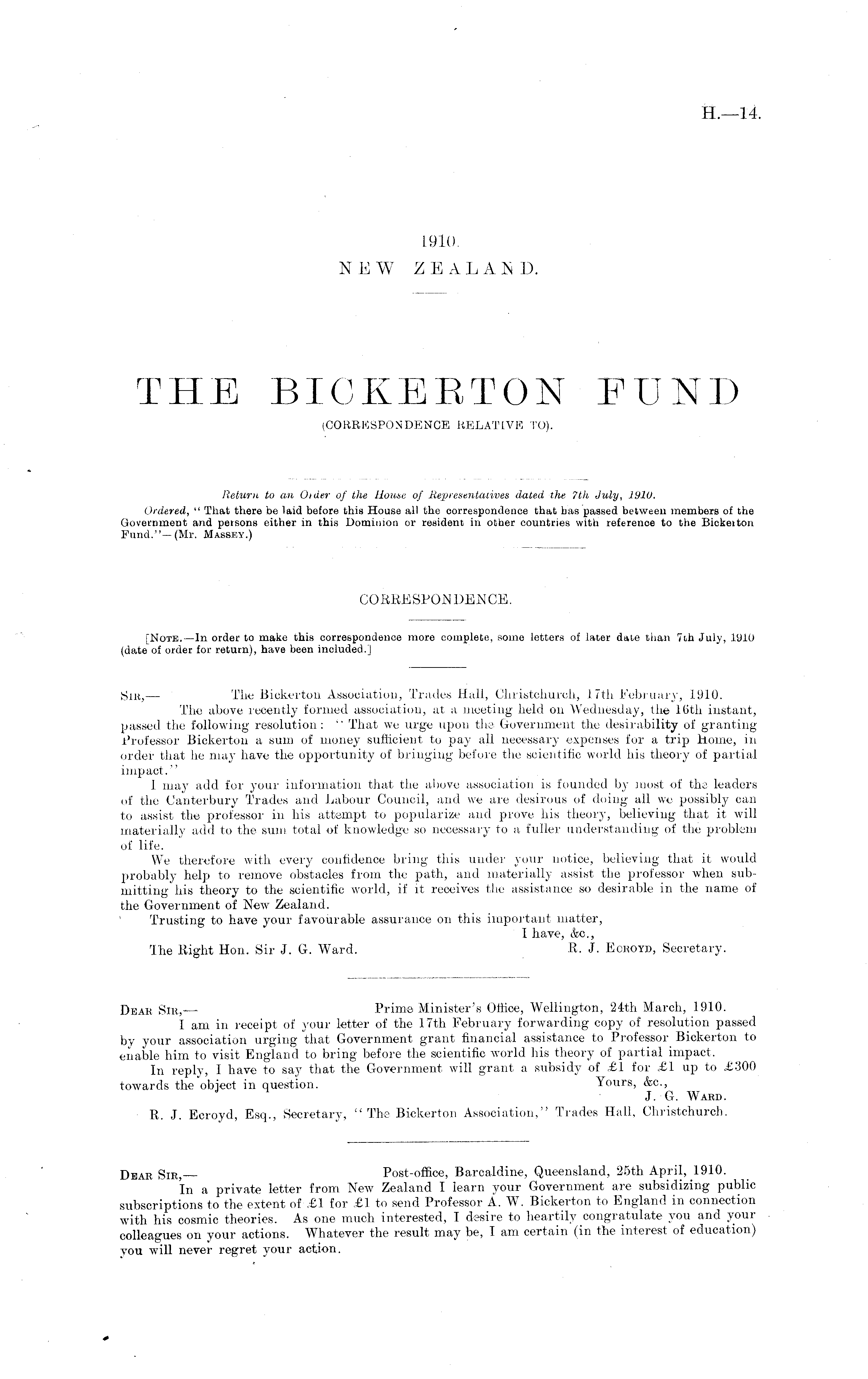 Sir, — The Bickerton Association, Trades Hall, Christchurch, 17th February, 1910. The above recently formed association, at a meeting' held on Wednesday, the 16th instant, passed the following resolution: " That we urge upon the Government the desirability of granting I'rofessor Bickerton a sum of money sufficient to pay all necessary expenses for a trip home, in order tiiat lie may have the opportunity of bringing before the scientific world his theory of partial impact. 1 may add for your information that the above association is founded by most of the. leaders of the Canterbury Trades and Labour Council, and we are desirous of doing all we possibly can to assist the professor in his attempt to popularize and prove his theory, believing that it will materially add to the sum total of knowledge so necessary to a. fuller understanding of the problem of life. We therefore with every confidence bring this under your notice, believing that it would probably help to remove obstacles from the path, and materially assist the professor when submitting his theory to the scientific world, if it receives the assistance so desirable in the name of the Government of New Zealand. ' Trusting to have your favourable assurance on this important matter, I have, &c, The Eight Hon. Sir J. G. Ward. R. J. Ecroyd, Secretary.