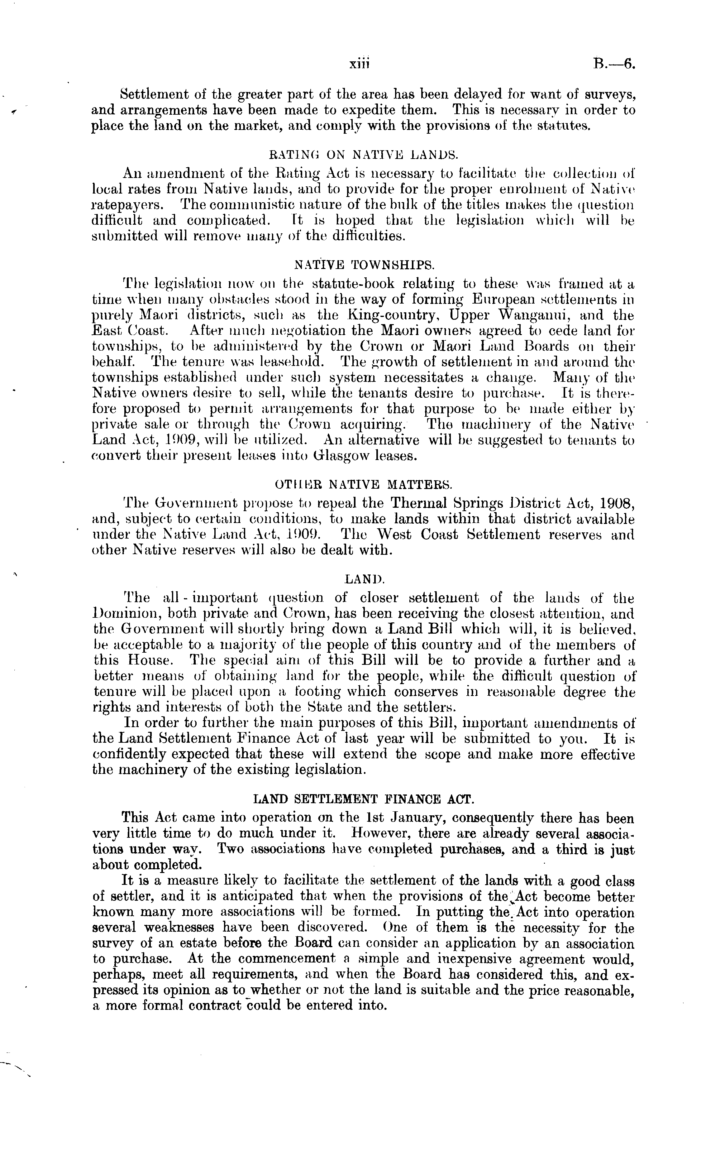 Settlement of the greater part of the area has been delayed for want of surveys, and arrangements have been made to expedite them. This is necessary in order to place the land on the market, and comply with the provisions of the statutes. EATING ON NATIVE LANDS. An amendment of the Hating Act is necessary bo facilitate the collection of local rates from Native lands, and to provide for the proper enrolment of Nal ive ratepayers. The communistic nature of the bulk of the titles makes the question difficult and complicated. It is hoped that the legislation which will be submitted will remove many of the difficulties. NATIVE TOWNSHIPS. The legislation now on the statute-book relating to the.se was framed at a time when many obstacles stood in the way of forming European settlements in purely Maori districts, such as the King-country, Upper Wanganui, and the East Coast. After much negotiation the Maori owners agreed to cede land for townships, to he administered by the Crown or Maori Land Boards on their behalf. The tenure was leasehold. The growth of settlement in and around the townships established under such system necessitates a change. Many of the Native owners desire to sell, while the tenants desire to purchase. It is therefore proposed to permh arrangements for that purpose to be made either by private sale or through the Crown acquiring. The machinery of the Native Land Act, 1009, will he utilized. An alternative will be suggested to tenants to convert their present leases into Glasgow leases. OTHKR NATIVE MATTERS. The Government propose to repeal the Thermal Springs District Act, 1908, and, subject to certain conditions, to make lands within that district available under the Native Land Act, L 909. The West Coast Settlement reserves and other Native reserves will also be dealt with. LAND. The all - important question of closer settlement of the lands of the Dominion, both private and Crown, has been receiving the closest attention, and the Government will shortly bring down a Land Bill which will, it is believed, be acceptable to a majority of the people of this country and of the members of this House. The special aim of this Bill will be to provide a further and a better means of obtaining laud for the people, while the difficult question of tenure will be placed upon a footing which conserves in reasonable degree the rights and interests of both the State and the settlers. In order to further the main purposes of this Bill, important amendments of the Land Settlement Finance Act of last year will be submitted to you. It is confidently expected that these will extend the scope and make more effective the machinery of the existing legislation. LAND SETTLEMENT FINANCE ACT. This Act came into operation on the Ist January, consequently there has been very little time to do much under it. However, there are already several associations under way. Two associations have completed purchases, and a third is just about completed. It is a measure likely to facilitate the settlement of the lands with a good class of settler, and it is anticipated that when the provisions of the v Act become better known many more associations will be formed. In putting the. Act into operation several weaknesses have been discovered. One of them is the necessity for the survey of an estate before the Board can consider an application by an association to purchase. At the commencement a simple and inexpensive agreement would, perhaps, meet all requirements, and when the Board has considered this, and expressed its opinion as to whether or not the land is suitable and the price reasonable, a more formal contract could be entered into.