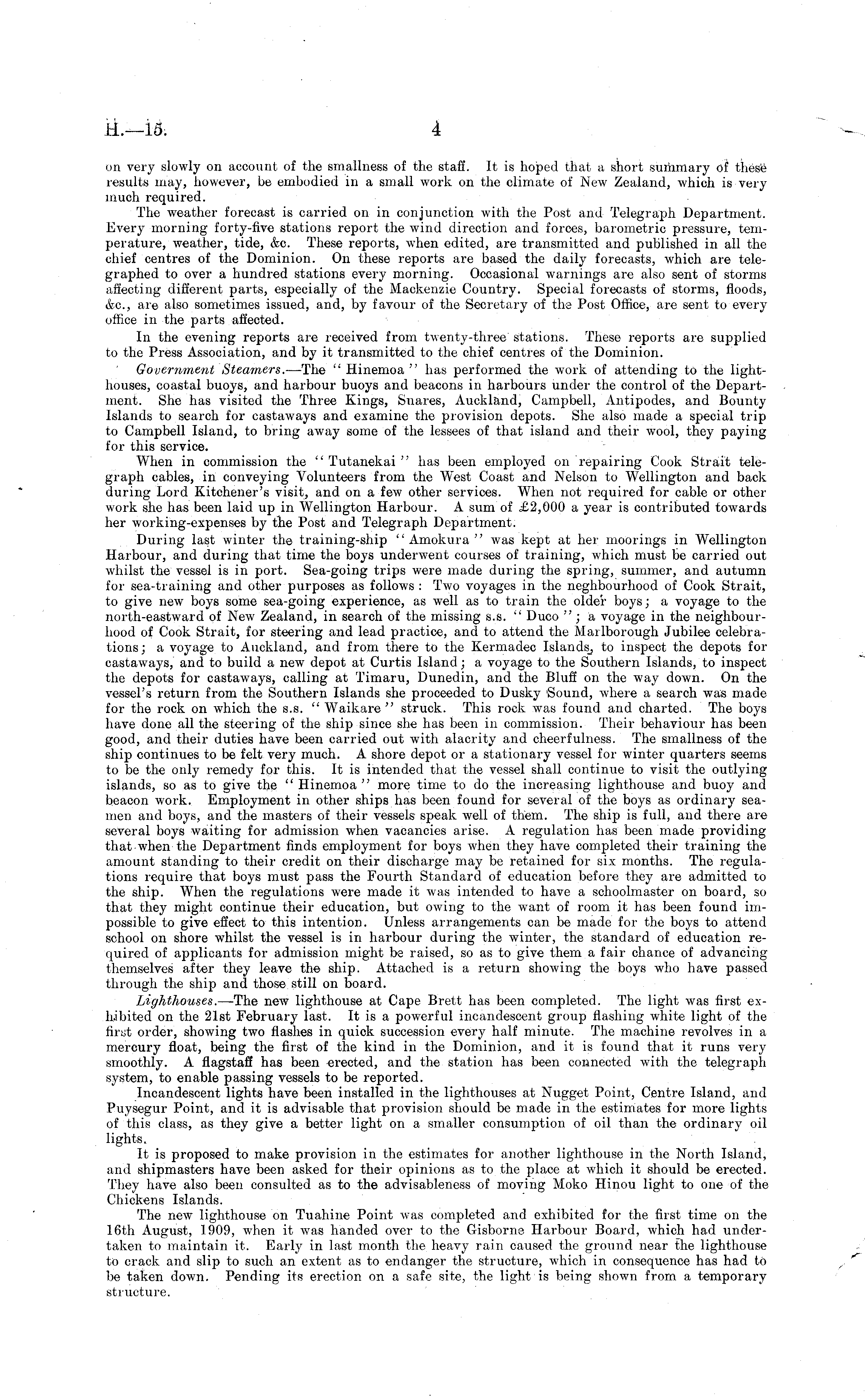 on very slowly on account of the smallness of the staff. It is hoped that a short summary of these results may, however, be embodied in a small work on the climate of New Zealand, which is very much required. The weather forecast is carried on in conjunction with the Post and Telegraph Department. Every morning forty-five stations report the wind direction and forces, barometric pressure, temperature, weather, tide, &c. These reports, when edited, are transmitted and published in all the chief centres of the Dominion. On these reports are based the daily forecasts, which are telegraphed to over a hundred stations every morning. Occasional warnings are also sent of storms affecting different parts, especially of the Mackenzie Country. Special forecasts of storms, floods, &c, are also sometimes issued, and, by favour of the Secretary of the Post Office, are sent to every office in the parts affected. In the evening reports are received from twenty-three stations. These reports are supplied to the Press Association, and by it transmitted to the chief centres of the Dominion. Government Steamers. —The " Hinemoa " has performed the work of attending to the lighthouses, coastal buoys, and harbour buoys and beacons in harbours under the control of the Department. She has visited the Three Kings, Snares, Auckland, Campbell, Antipodes, and Bounty Islands to search for castaways and examine the provision depots. She also made a special trip to Campbell Island, to bring away some of the lessees of that island and their wool, they paying for this service. When in commission the " Tutanekai " has been employed on repairing Cook Strait telegraph cables, in conveying Volunteers from the West Coast and Nelson to Wellington and back during Lord Kitchener's visit, and on a few other services. When not required for cable or other work she has been laid up in Wellington Harbour. A sum of £2,000 a year is contributed towards her working-expenses by the Post and Telegraph Department. During last winter the training-ship " Amokura " was kept at her moorings in Wellington Harbour, and during that time the boys underwent courses of training, which must be carried out whilst the vessel is in port. Sea-going trips were made during the spring, summer, and autumn for sea-training and other purposes as follows : Two voyages in the neghbourhood of Cook Strait, to give new boys some sea-going experience, as well as to train the older boys; a voyage to the north-eastward of New Zealand, in search of the missing s.s. " Duco " ; a voyage in the neighbourhood of Cook Strait, for steering and lead practice, and to attend the Marlborough Jubilee celebrations ; a voyage to Auckland, and from there to the Kermadec to inspect the depots for castaways, and to build a new depot at Curtis Island; a voyage to the Southern Islands, to inspect the depots for castaways, calling at Timaru, Dunedin, and the Bluff on the way down. On the vessel's return from the Southern Islands she proceeded to Dusky Sound, where a search was made for the rock on which the s.s. " Waikare " struck. This rock was found and charted. The boys have done all the steering of the ship since she has been in commission. Their behaviour has been good, and their duties have been carried out with alacrity and cheerfulness. The smallness of the ship continues to be felt very much. A shore depot or a stationary vessel for winter quarters seems to be the only remedy for this. It is intended that the vessel shall continue to visit the outlying islands, so as to give the "Hinemoa" more time to do the increasing lighthouse and buoy and beacon work. Employment in other ships has been found for several of the boys as ordinary seamen and boys, and the masters of their vessels speak well of them. The ship is full, and there are several boys waiting for admission when vacancies arise. A regulation has been made providing that when the Department finds employment for boys when they have completed their training the amount standing to their credit on their discharge may be retained for six months. The regulations require that boys must pass the Fourth Standard of education before they are admitted to the ship. When the regulations were made it was intended to have a schoolmaster on board, so that they might continue their education, but owing to the want of room it has been found impossible to give effect to this intention. Unless arrangements can be made for the boys to attend school on shore whilst the vessel is in harbour during the winter, the standard of education required of applicants for admission might be raised, so as to give them a fair chance of advancing themselves after they leave the ship. Attached is a return showing the boys who have passed through the ship and those still on board. Lighthouses. —The new lighthouse at Cape Brett has been completed. The light was first exhibited on the 21st February last. It is a powerful incandescent group flashing white light of the first order, showing two flashes in quick succession every half minute. The machine revolves in a mercury float, being the first of the kind in the Dominion, and it is found that it runs very smoothly. A flagstaff has been erected, and the station has been connected with the telegraph system, to enable passing vessels to be reported. Incandescent lights have been installed in the lighthouses at Nugget Point, Centre Island, and Puysegur Point, and it is advisable that provision should be made in the estimates for more lights of this class, as they give a better light on a smaller consumption of oil than the ordinary oil lights. It is proposed to make provision in the estimates for another lighthouse in the North Island, and shipmasters have been asked for their opinions as to the place at which it should be erected. They have also been consulted as to the advisableness of moving Moko Hinou light to one of the Chickens Islands. The new lighthouse on Tuahine Point was completed and exhibited for t