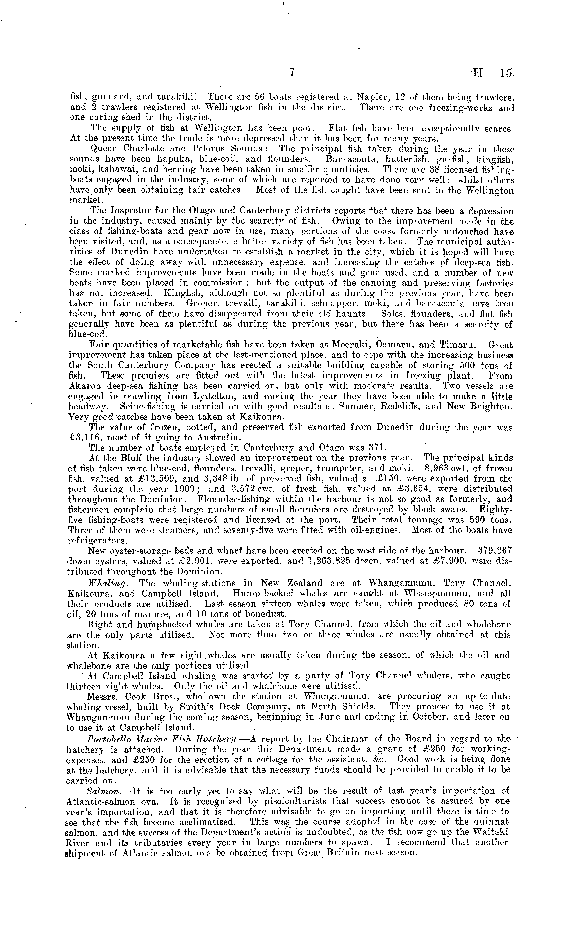 fish, gurnard, and tarakihi. Theie are 56 boats registered at Napier, 12 of them being trawlers, and 2 trawlers registered at Wellington fish in the district. There are one freezing-works and one curing-shed in the district. The supply of fish at Wellington has been poor. Flat fish have been exceptionally scarce At the present time the trade is more depressed than it has been for many years. Queen Charlotte and Pelorus Sounds : The principal fish taken during the year in these sounds have been hapuka, blue-cod, and flounders. Barracouta, butterfish, garfish, kingfish, mold, kahawai, and herring have been taken in smaller quantities. There are 38 licensed fishingboats engaged in the industry, some of which are reported to have done very well; whilst others have_only been obtaining fair catches. Most of the fish caught have been sent to the Wellington market. The Inspector for the Otago and Canterbury districts reports that there has been a depression in the industry, caused mainly by the scarcity of fish. Owing to the improvement made in the class of fishing-boats and gear now in use, many portions of the coast formerly untouched have been visited, and, as a consequence, a better variety of fish has been taken. The municipal authorities of Dunedin have undertaken to establish a market in the city, which it is hoped will have the effect of doing away with unnecessary expense, and increasing the catches of deep-sea fish. Some marked improvements have been made in the boats and gear used, and a number of newboats have been placed in commission; but the output of the canning and preserving factories has not increased. Kingfish, although not so plentiful as during the previous year, have been taken in fair numbers. Groper, trevalli, tarakihi, schnapper, moki, and barracouta have been taken, but some of them have disappeared from their old haunts. Soles, flounders, and flat fish generally have been as plentiful as during the previous year, but there has been a scarcity of blue-cod. Fair quantities of marketable fish have been taken at Moeraki, Oamaru, and Timaru. Great improvement has taken place at the last-mentioned place, and to cope with the increasing business the South Canterbury Company has erected a suitable building capable of storing 500 tons of fish. These premises are fitted out with the latest improvements in freezing plant. From Akaroa deep-sea fishing has been carried on, but only with moderate results. Two vessels are engaged in trawling from Lyttelton, and during the year they have been able to make a little headway. Seine-fishing is carried on with good results at Sumner, Redcliffs, and New Brighton. Very good catches have been taken at Kaikoura. The value of frozen, potted, and preserved fish exported from Dunedin during the year was £3,116, most of it going to Australia. The number of boats employed in Canterbury and Otago was 371. At the Bluff the industry showed an improvement on the previous year. The principal kinds of fish taken were blue-cod, flounders, trevalli, groper, trumpeter, and moki. 8,963 cwt. of frozen fish, valued at £13,509, and 3,3481b. of preserved fish, valued at £150, were exported from the port during the year 1909; and 3,572 cwt. of fresh fish, valued at £3,654, were distributed throughout the Dominion. Flounder-fishing within the harbour is not so good as formerly, and fishermen complain that large numbers of small flounders are destroyed by black swans. Eightyfive fishing-boats were registered and licensed at the port. Their total tonnage was 590 tons. Three of them were steamers, and seventy-five were fitted with oil-engines. Most of the boats have refrigerators. New oyster-storage beds and wharf have been erected on the west side of the harbour. 379,267 dozen oysters, valued at £2,901, were exported, and 1,263,825 dozen, valued at £7,900, were distributed throughout the Dominion. Whaling. —The whaling-stations in New Zealand are at Whangamumu, Tory Channel, Kaikoura, and Campbell Island. Hump-backed whales are caught at Whangamumu, and all their products are utilised. Last season sixteen whales were taken, which produced 80 tons of oil, 20 tons of manure, and 10 tons of bonedust. Right and humpbacked whales are taken at Tory Channel, from which the oil and whalebone are the only parts utilised. Not more than two or three whales are usually obtained at this station. At Kaikoura a few right.whales are usually taken during the season, of which the oil and whalebone are the only portions utilised. At Campbell Island whaling was started by a party of Tory Channel whalers, who caught thirteen right whales. Only the oil and whalebone were utilised. Messrs. Cook Bros., who own the station at Whangamumu, are procuring an up-to-date whaling-vessel, built by Smith's Dock Company, at North Shields. They propose to use it at Whangamumu during the coming season, beginning in June and ending in October, and later on to use it at Campbell Island. Portobello Marine Fish Hatchery. —A report by the Chairman of the Board in regard to the hatchery is attached. During the this Department made a grant of £250 for workingexpenses, and £250 for the erection of a cottage for the assistant, &c. Good work is being done at the hatchery, and it is advisable that the necessary funds should be provided to enable it to be carried on. Salmon. —It is too early yet to say what will be the result of last year's importation of Atlantic-salmon ova. It is recognised by pisciculturists that success cannot be assured by one year's importation, and that it is therefore advisable to go on importing until there is time to see that the fish become acclimatised. This was the course adopted in the case of the quinnat salmon, and the success of the Department's action is undoubted, as the fish now go up the Waitaki River and its tributaries every year in large numbers to spawn. I recommend that another shipment of Atlantic salmon ova be obtained from Great Britain next season,