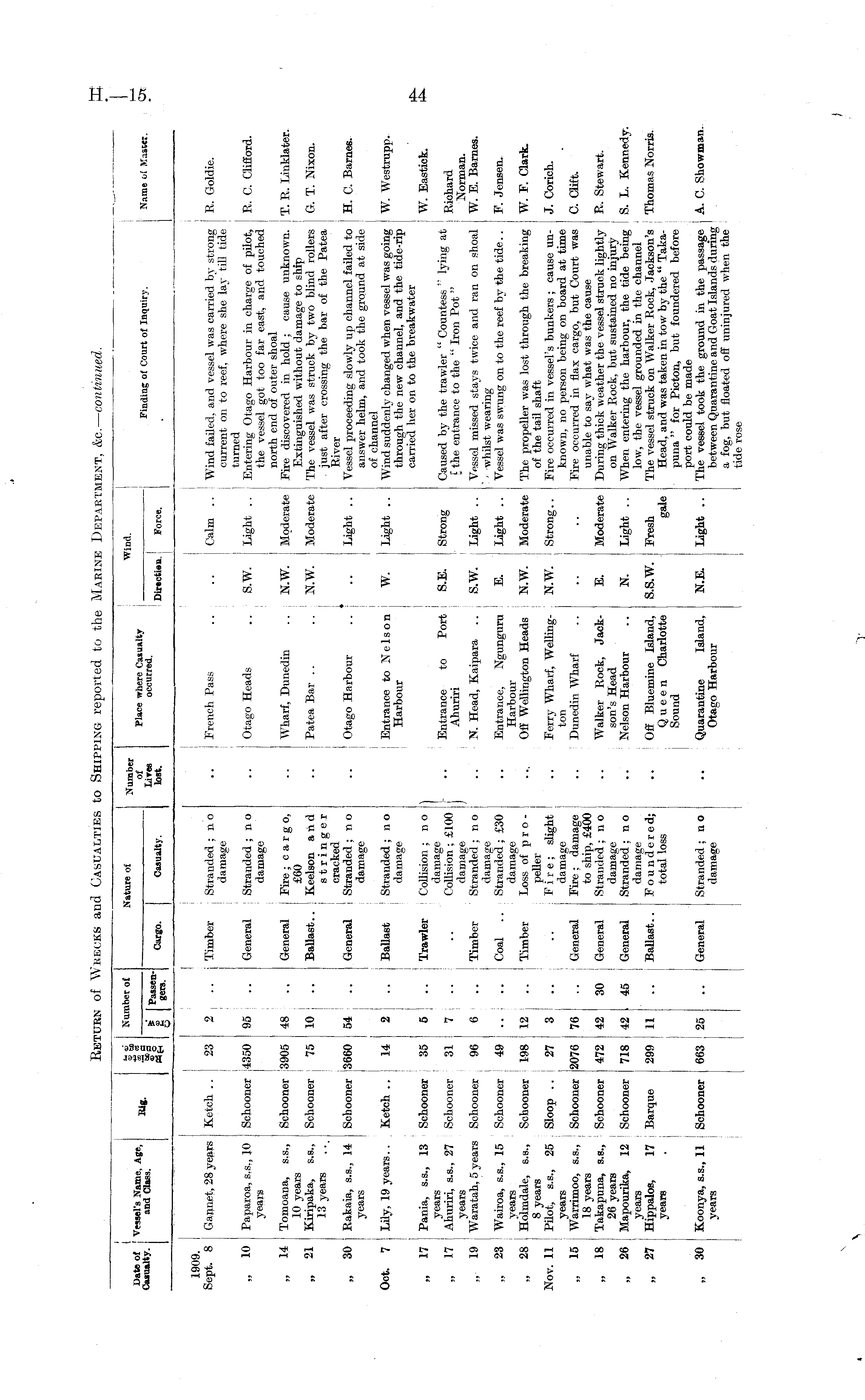 Date of j Vessel's Name, Age, Casualty. ] and Class. Rig. £ « Number of sS jjj Passenm f g gets. Nature of Number of Lives lost. Place where Casualty occurred. Directien, Wind. Force. I Finding of Court of Inquiry. j Name oC Matter. Cargo. Casualty. i i 1909. Sept. 8 j Gannet, 28 years Ketch .. 23 95 48 54 2 7 6 12 3 76 42 42 11 25 30 45 j Timber Stranded ; n o damage General Stranded ; n o damage General Fire; cargo, £60 Ballast.. Keelson and stringer cracked General Stranded ; n o damage i Ballast Stranded ; n o damage j Trawler Collision ; n o damage Collision ; £100 damage Timber Stranded ; n o damage Coal .. Stranded; £30 damage Timber Loss of propeller ; F i r e ; slight damage General Fire; damage to ship, £400 General Stranded ; n o damage General Stranded ; n o damage Ballast.. Foundered; total loss General Stranded ; n o damage ) I French Pass Otago Heads .. S.W. Wharf, Dunedin .. , N.W. Patea Bar .. .. N.W T . Otago Harbour Entrance to Nelson W. Harbour Entrance to Port : S.E. Ahuriri N. Head, Kaipara .. , S.W. Entrance, Ngunguru E. Harbour Off WeUington Heads N.W. Ferry Wharf, Welling- N.W. ton Dunedin Wharf Walker Rock, Jack- E. son's Head Nelson Harbour .. N. Off Bluemine Island, S.S.W. Queen Charlotte Sound Quarantine Island, N.E. Otago Harbour Calm .. W T ind failed, and vessel was carried by strong R. Goldie. current on to reef, where she lay till tide turned Light .. Entering Otago Harbour in charge of pilot, R. C. Clifford. the vessel got too far east, and touched north end of outer shoal Moderate Fire discoverer! in hold ; cause unknown. T. R. Linklater. Extinguished without damage to ship Moderate The vessel was struck by two blind rollers G. T. Nixon. just after crossing the bar of the Patea River Light .. Vessel proceeding slowly up channel failed to H. C. Barnes. answer helm, and took the ground at side of channel Light .. Wind suddenly changed when vessel was going W. Westrupp. through the new channel, and the tide-rip carried her on to the breakwater I W. Eastick. Strong Caused by the trawler " Countess " lying at ' T>-„y. aT( j [the entrance to the " Iron Pot " TV an Light .. Vessel missed stays twice and ran on shoal W. E. Barnes. whilst wearing Light .. Vessel was swung on to the reef by the tide.. F. Jensen. Moderate The propeller was lost through the breaking W. F. Clark. of the tail shaft Strong.. Fire occurred in vessel's bunkers; cause un- J. Corich. known, no person being on board at time Fire occurred in flax cargo, but Court was C. Clift. unable to say what was the cause Moderate During thick weather the vessel struck lightly R. Stewart. on Walker Rock, but sustained no injuryLight .. 'When entering the harbour, the tide being S. L. Kennedy low, the vessel grounded in the channel Fresh The vessel struck on Walker Rock, Jackson's I Thomas Norris. gale Head, and was taken in tow by the " Takapuna " for Picton, but foundered before port could be made Light .. The vessel took the ground in the passage i A. C. Showman between Quarantine and Goat Islands during a fog, but floated off uninjured when the tide rose „ 10 Paparoa, s,s„ 10 Schooner J4350 years „ 14 Tomoana, s.s., Schooner 3905 10 years „ 21 Kiripaka, s.s., Schooner : 75 13 years „ 30 Rakaia, s.s., 14 Schooner 3660 years i Oct. 7 I Lily, 19 years.. Ketch .. 14 „ 17 Pania, s.s., 13 Schooner 35 years „ 17 Ahuriri, s.s., 27 Schooner 31 years „ 19 Waratah, 5 years Schooner 96 ' „ 23 Wairoa, s.s., 15 Schooner 49 years „ 28 Holmdale, s.s., Schooner 198 8 years Nov. 11 Pilot, s.s., 25 Sloop .. 27 years „ 15 Warrimoo, s.s., Schooner 2076 18 years „ 18 Takapuna, s.s., Schooner 472 26 years „ 26 Mapourika, 12 Schooner 718 years „ 27 Hippalos, 17 Barque 299 years „ 30 Koonya, s.s., 11 Schooner 663 years 663 25