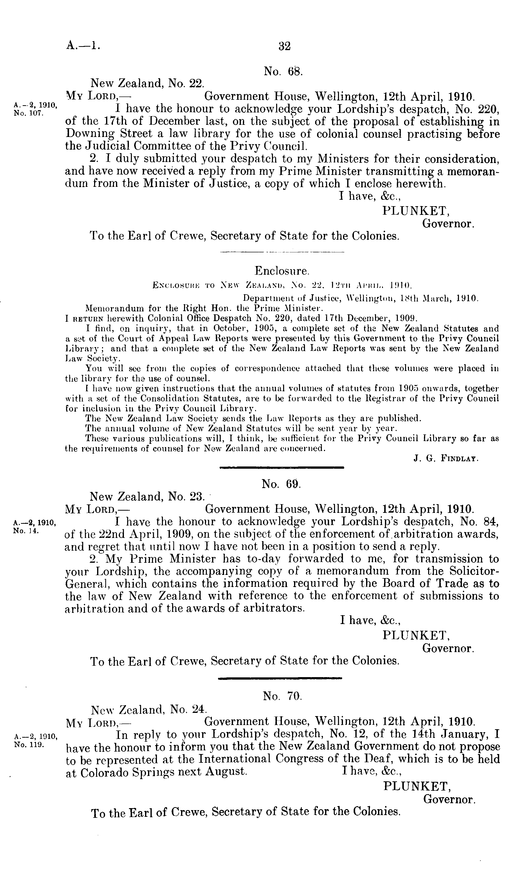 Enclosure. Enclosure to New Zealand, No. 22. 12th April, 1910, Department (if Justice, Wellington, 18th March, 1910. Memorandum for the Right Hon. the Prime Minister. I return herewith Colonial Office Despatch No. 220, dated 17th December, 1909. I find, on inquiry, that in October, 1905, a complete set of the New Zealand Statutes and a set of the Court of Appeal Law Reports were presented by this Government to the Privy Council Library; and that a complete set of the New Zealand Law Reports was sent by the New Zealand Law Society. You will see from the copies of correspondence attached that these volumes were placed in the library for the use of counsel. I have now given instructions that the annual volumes of statutes from 1905 onwards, together with a set of the Consolidation Statutes, are to be forwarded to the Registrar of the Privy Council for inclusion in the Privy Council Library. The New Zealand Law Society sends the Law Reports as they are published. The annual volume of New Zealand Statutes will be sent year by year. These various publications will, I think, be sufficient for the Privy Council Library so far as the requirements of counsel for New Zealand are concerned. J. G. Findlat.