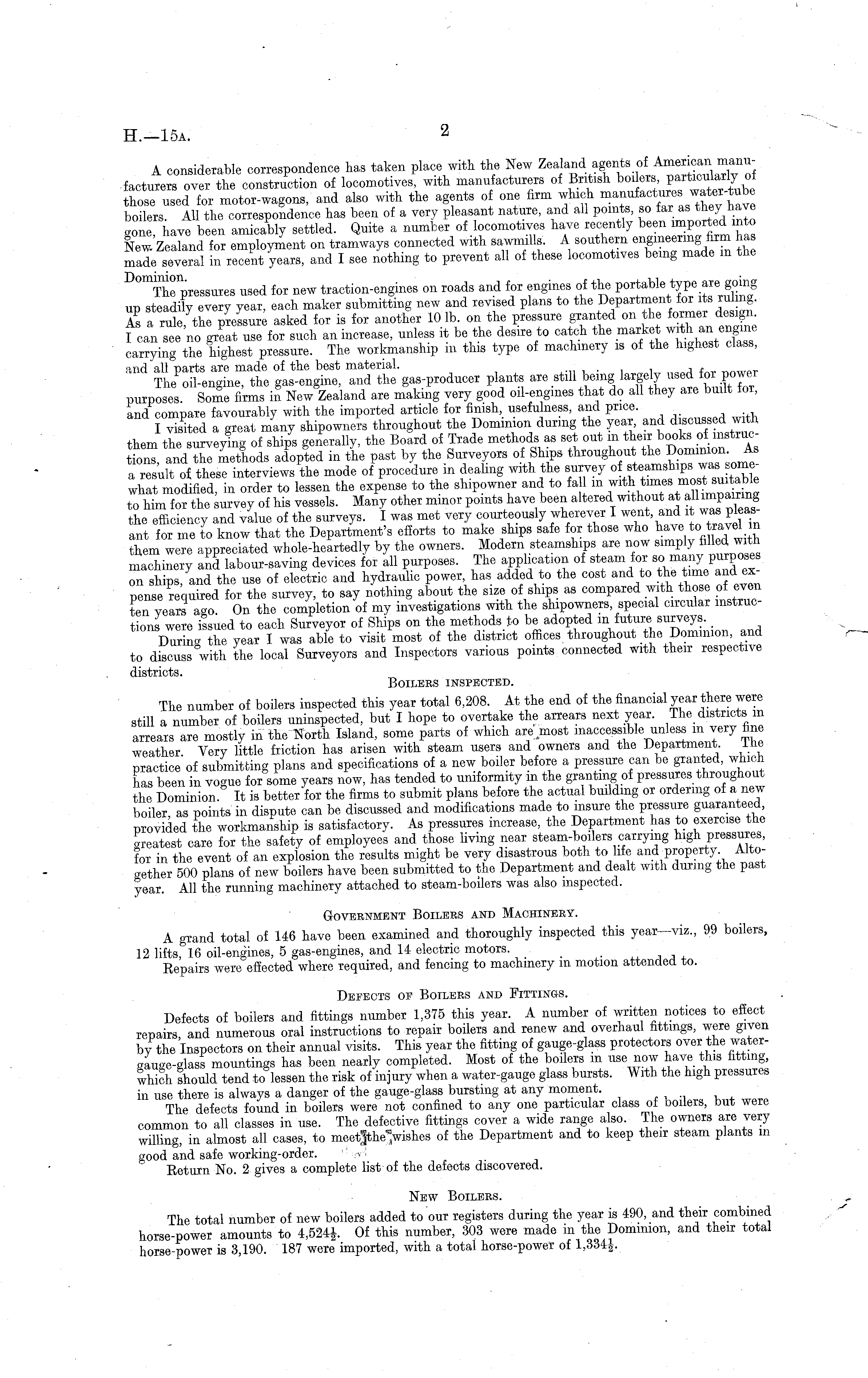 A considerable correspondence has taken place with the New Zealand agents of Amer can man facturers over the construction of locomotives, with manufacturers of British boilers, particularly of those used for motor-wagons, and also with the agents of one firm which manufactures water-tube boilers. All the correspondence has been of a very pleasant nature, and all points, so far as they have gone, have been amicably settled. Quite a number of locomotives have recently been imported into New. Zealand for employment on tramways connected with sawmills. A southern engineering firm has made several in recent years, and I see nothing to prevent all of these locomotives being made m the DOm The n pressures used for new traction-engines on roads and for engines of the up steadily every year, each maker submitting new and revised plans to the Department for its ruling. Z a rut thTpressure asked for is for another 101b. on the pressure granted on the former design. Fcan stVo great 1 for such an increase, unless it be the desire to catch the market with «i engine carrying the highest pressure. The workmanship in this type of machinery is of the highest class, and all parts are made of the best material. . The oil-engine, the gas-engine, and the gas-producer plants are still being largely used power purposes. Some firms in New Zealand are making very good oil-engines that do all they are built lor, and compare favourably with the imported article for finish, usefulness, and price. visuted a great many shipowners throughout the Dominion during the year and discuss d with them the surveying of ships generally, the Board of Trade methods as set out in their books of instruction" and the methods adapted in the past by the. Surveyors of Ships throughout^ a result of these interviews the mode of procedure in dealing with the survey of steamships was some whTt modified, in order to lessen the expense to the shipowner and to fa m«t « surt ble to him for the survey of his vessels. Many other minor points have been altered without at all™Pairing the efficiency and value of the surveys. I was met very courteously wherever I went, and it waspleasant for me to know that the Department's efforts to make ships safe for those who haveto <****}* them were appreciated whole-heartedly by the owners. Modern steamships are now simply filled with and labour-saving devices for all purposes. The application of steam for^ manypurpose on ships/and the use of electric and hydraulic power has added to the cost and to the time and ex pense required for the survey, to say nothing about the size of ships as compared with those of even ten years ago On the completion of my investigations with the shipowners, special circular instructions were issued to each Surveyor of Ships on the methods to be adopted in future surveys. _ During the year I was able to visit most of the district offices throughout the Dominion, and to discuss with the local Surveyors and Inspectors various points connected with their respective districts. Boilers inspected. The number of boilers inspected this year total 6,208. At the end of the financial year there were still a number of boilers uninspected, but I hope to overtake the arrears next year. The districts m arrears are mostly in the North Island, some parts of which are most inaccessible unless m very fine weather Very little friction has arisen with steam users and owners and the Department. lne practice' of submitting plans and specifications of a new boiler before a pressure can be granted, which has been in vogue for some years now, has tended to uniformity in the granting of pressures throughout the Dominion. It is better for the firms to submit plans before the actual building or ordering of a new boiler, as points in dispute can be discussed and modifications made to insure the pressure guaranteed, provided the workmanship is satisfactory. As pressures increase, the Department has to exercise the Greatest care for the safety of employees and those living near steam-boilers carrying high pressures, for in the event of an explosion the results might be very disastrous both to life and property Altogether 500 plans of new boilers have been submitted to the Department and dealt with during the past year. All the running machinery attached to steam-boilers was also inspected. Government Boilers and Machinery. A grand total of 146 have been examined and thoroughly inspected this year—viz., 99 boilers, 12 lifts, 16 oil-engines, 5 gas-engines, and 14 electric motors. _ Eepairs were effected where required, and fencing to machinery m motion attended to. Defects of Boilers and Eittings. Defects of boilers and fittings number 1,375 this year. A number of written notices to effect repairs and numerous oral instructions to repair boilers and renew and overhaul fittings, were given by the Inspectors on their annual visits. This year the fitting of gauge-glass protectors over the water-gauge-glass mountings has been nearly completed. Most of the boilers m use now have this fitting, which should tend to lessen the risk of injury when a water-gauge glass bursts. With the high pressures in use there is always a danger of the gauge-glass bursting at any moment. The defects found in boilers wore not confined to any one particular class of boilers, but were common to all classes in use. The defective fittings cover a wide range also. The owners are very willing, in almost all cases, to meet]the>ishes of the Department and to keep their steam plants m good and safe working-order. ■• i Eeturn No. 2 gives a complete list of the defects discovered. New Boilers. The total number of new boilers added to our registers during the year is 490, and their combined horse-power amounts to 4,524|. Of this number, 303 were made in the Dominion, and their total horse-power is 3,190. 187 were imported, with a total horse-power of 1,334|.