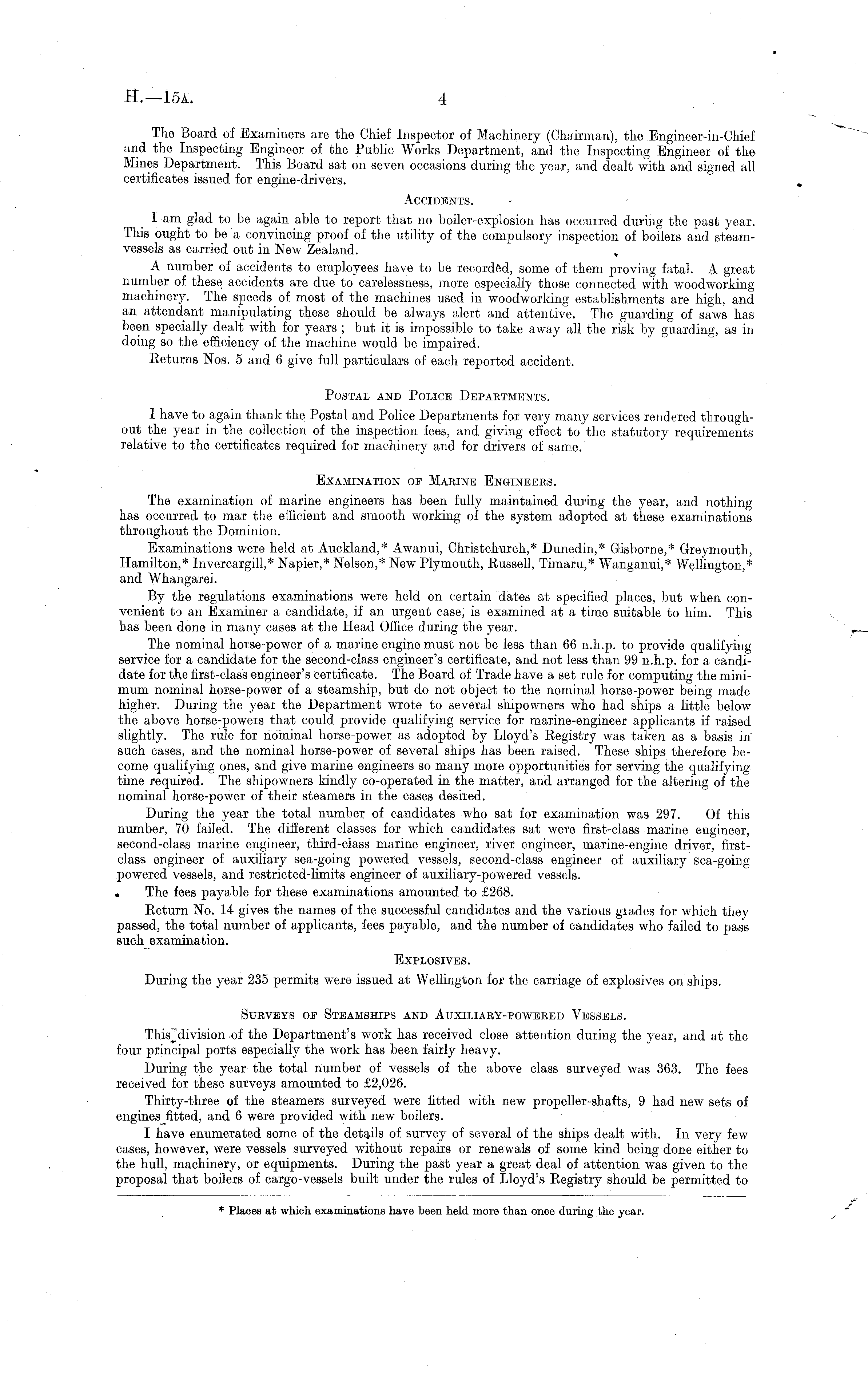 The Board of Examiners are the Chief Inspector of Machinery (Chairman), the Engineer-in-Chief and the Inspecting Engineer of the Public Works Department, and the Inspecting Engineer of the Mines Department. This Board sat on seven occasions during the year, and dealt with and signed all certificates issued for engine-drivers. Accidents. I am glad to be again able to report that no boiler-explosion has occurred during the past year. This ought to be a convincing proof of the utility of the compulsory inspection of boilers and steamvessels as carried out in New Zealand. , A number of accidents to employees have to be recorded, some of them proving fatal. A great number of these accidents are due to carelessness, more especially those connected with woodworking machinery. The speeds of most of the machines used in woodworking establishments are high, and an attendant manipulating these should be always alert and attentive. The guarding of saws has been specially dealt with, for years ; but it is impossible to take away all the risk by guarding, as in doing so the efficiency of the machine would be impaired. Returns Nos. 5 and 6 give full particulars of each reported accident. Postal and Police Departments. I have to again thank the Postal and Police Departments for very many services rendered throughout the year in the collection of the inspection fees, and giving effect to the statutory requirements relative to the certificates required for machinery and for drivers of same. Examination of Marine Engineers. The examination of marine engineers has been fully maintained during the year, and nothing has occurred to mar the efficient and smooth working of the system adopted at these examinations throughout the Dominion. Examinations were held at Auckland,* Awanui, Christchurch,* Dunedin,* Gisborne,* Greymouth, Hamilton,* Invercargill,* Napier,* Nelson,* New Plymouth, Russell, Timaru,* Wanganui,* Wellington,* and Whangarei. By the regulations examinations were held on certain dates at specified places, but when convenient to an Examiner a candidate, if an urgent case, is examined at a time suitable to him. This has been done in many cases at the Head Office during the year. The nominal horse-power of a marine engine must not be less than 66 n.h.p. to provide qualifying service for a candidate for the second-class engineer's certificate, and not less than 99 n.h.p. for a candidate for the first-class engineer's certificate. The Board of Trade have a set rule for computing the minimum nominal horse-power of a steamship, but do not object to the nominal horse-power being made higher. During the year the Department wrote to several shipowners who had ships a little below the above horse-poweis that could provide qualifying service for marine-engineer applicants if raised slightly. The rule for nominal horse-power as adopted by Lloyd's Registry w r as taken as a basis in such cases, and the nominal horse-power of several ships has been raised. These ships therefore become qualifying ones, and give marine engineers so many moie opportunities for serving the qualifyingtime required. The shipowners kindly co-operated in the matter, and arranged for the altering of the nominal horse-power of their steamers in the cases desired. During the year the total number of candidates who sat for examination was 297. Of this number, 70 failed. The different classes for which candidates sat were first-class marine engineer, second-class marine engineer, third-class marine engineer, river engineer, marine-engine driver, firstclass engineer of auxiliary sea-going powered vessels, second-class engineer of auxiliary sea-going powered vessels, and restricted-limits engineer of auxiliary-powered vessels. • The fees payable for these examinations amounted to £268. Return No. 14 gives the names of the successful candidates and the various grades for which they passed, the total number of applicants, fees payable, and the number of candidates who failed to pass such examination. Explosives. During the year 235 permits were issued at Wellington for the carriage of explosives on ships. Surveys of Steamships and Auxiliary-powered Vessels. of the Department's work has received close attention during the year, and at the four principal ports especially the work has been fairly heavy. During the year the total number of vessels of the above class surveyed was 363. The fees received for these surveys amounted to £2,026. Thirty-three of the steamers surveyed were fitted with new propeller-shafts, 9 had new sets of engines fitted, and 6 were provided with new boilers. I have enumerated some of the details of survey of several of the ships dealt with. In very few cases, however, were vessels surveyed without repairs or renewals of some kind being done either to the hull, machinery, or equipments. During the past year a great deal of attention was given to the proposal that boilers of cargo-vessels built under the rules of Lloyd's Registry should be permitted to * Places at which examinations have been held more than once during the year.