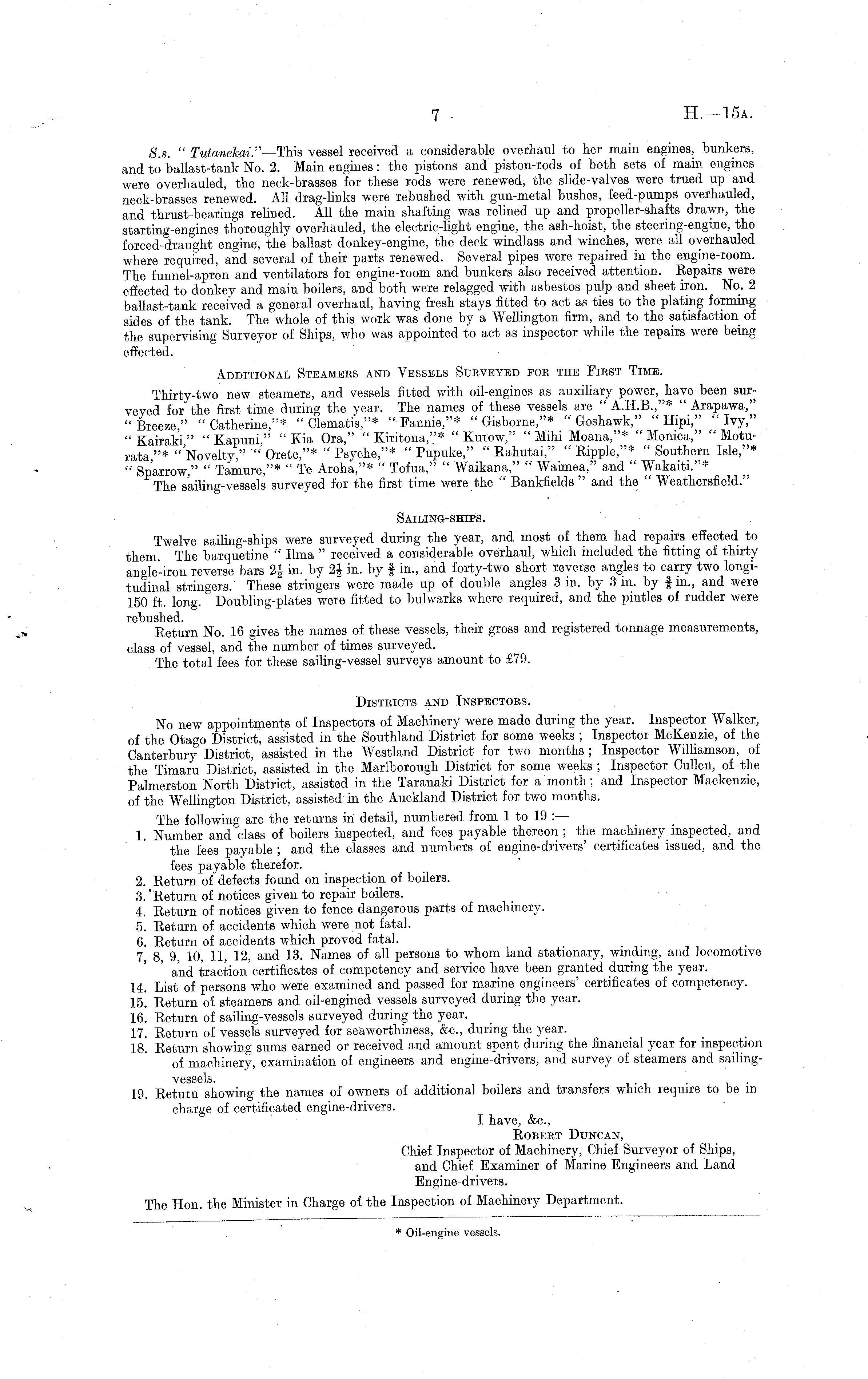 S.s. " Tutanekai." —This vessel received a considerable overhaul to her main engines, bunkers, and to ballast-tank No. 2. Main engines: the pistons and piston-rods of both sets of main engines were overhauled, the neck-brasses for these rods were renewed, the slide-valves were trued up and neck-brasses renewed. All drag-links were rebushed with gun-metal bushes, feed-pumps overhauled, and thrust-bearings relined. All the main shafting was relined up and propeller-shafts drawn, the starting-engines thoroughly overhauled, the electric-light engine, the ash-hoist, the steering-engine, the forced-draught engine, the ballast donkey-engine, the deck windlass and winches, were all overhauled where required, and several of their parts renewed. Several pipes were repaired in. the engine-room. The funnel-apron and ventilators for engine-room and bunkers also received attention. Repairs were effected to donkey and main boilers, and both were relagged with asbestos pulp and sheet iron. No. 2 ballast-tank received a general overhaul, having fresh stays fitted to act as ties to the plating forming sides of the tank. The whole of this work was done by a Wellington firm, and to the satisfaction of the supervising Surveyor of Ships, who was appointed to act as inspector while the repairs were being effected. Additional Steamers and Vessels Surveyed for the First Time. Thirty-two new steamers, and. vessels fitted with oil-engines as auxiliary power, have been surveyed for the first time during the year. The names of these vessels are " A.H.8.,"* " Arapawa," " Breeze " " Catherine,"* " Clematis,"* " Fannie,"* " Gisborne,"* " Goshawk," " Hipi," " Ivy," " Kairak'i " " Kapuni," " Kia Ora," " Kiritona,"* " Kuiow," " Mihi Moana,"* " Monica," " Moturata,"* "Novelty," '" Orete,"* " Psyche,"* " Pupuke," " Rahutai," "Ripple,"* " Southern Isle,"* " Sparrow," " Tamure,"* " Te Aroha,"* " Tofua," " Waikana," " Waimea," and " Wakaiti."* The sailing-vessels surveyed for the first time were the " Bankfields " and the " Weathersfield." Sailing-ships. Twelve sailing-ships were surveyed during the year, and most of them had repairs effected, to them The barquetine " lima " received a considerable overhaul, which included the fitting of. thirty angle-iron reverse bars 2| in. by 2J in. by -| in., and forty-two short reverse angles to carry two longitudinal stringers. These stringers were made up of double angles 3 in. by 3 in. by fin., and were 150 ft. long. Doubling-plates were fitted to bulwarks where required, and the pintles of rudder were rt? b usli cci.. Return No. 16 gives the names of these vessels, their gross and registered tonnage measurements, class of vessel, and the number of times surveyed. The total fees for these sailing-vessel surveys amount to £79. Districts and Inspectors. No new appointments of Inspectors of Machinery were made during the year. Inspector Walker, of the Otago District, assisted in the Southland District for some weeks ; Inspector McKenzie, of the Canterbury District, assisted in the Westland District for two months ; Inspector Williamson, of the Timaru District, assisted in the Marlborough District for some weeks ; Inspector Culleri, of the Palmerston North District, assisted in the Taranaki District for a month; and Inspector Mackenzie, of the Wellington District, assisted in the Auckland District for two months. The following are the returns in detail, numbered from 1 to 19 : — 1 Number and class of boilers inspected, and fees payable thereon ; the machinery inspected, and the fees payable ; and the classes and numbers of engine-drivers' certificates issued, and the fees payable therefor. 2. Return of defects found on inspection of boilers. 3. 'Return of notices given, to repair boilers. 4. Return of notices given to fence dangerous parts of machinery. 5. Return of accidents which were not fatal. 6. Return of accidents which proved fatal. 7. 8, 9, 10, 11, 12, and 13. Names of all persons to whom land stationary, winding, and locomotive and traction'certificates of competency and service have been granted during the year. 14. List of persons who were examined and passed for marine engineers' certificates of competency. 15. Return of steamers and oil-engined vessels surveyed during the year. 16. Return of sailing-vessels surveyed during the year. 17. Return of vessels surveyed for seaworthiness, &c, during the year. 18. Return showing sums earned or received and amount spent during the financial year for inspection of machinery, examination of engineers and engine-drivers, and survey of steamers and sailingvessels. . . 19. Return showing the names of owners of additional boilers and transfers which require to be in charge of certificated engine-drivers. I have, &c, Robert Duncan, Chief Inspector of Machinery, Chief Surveyor of Ships, and Chief Examiner of Marine Engineers and Land Engine-drivers. The Hon. the Minister in Charge of the Inspection of Machinery Department. * Oil-engine vessels.
