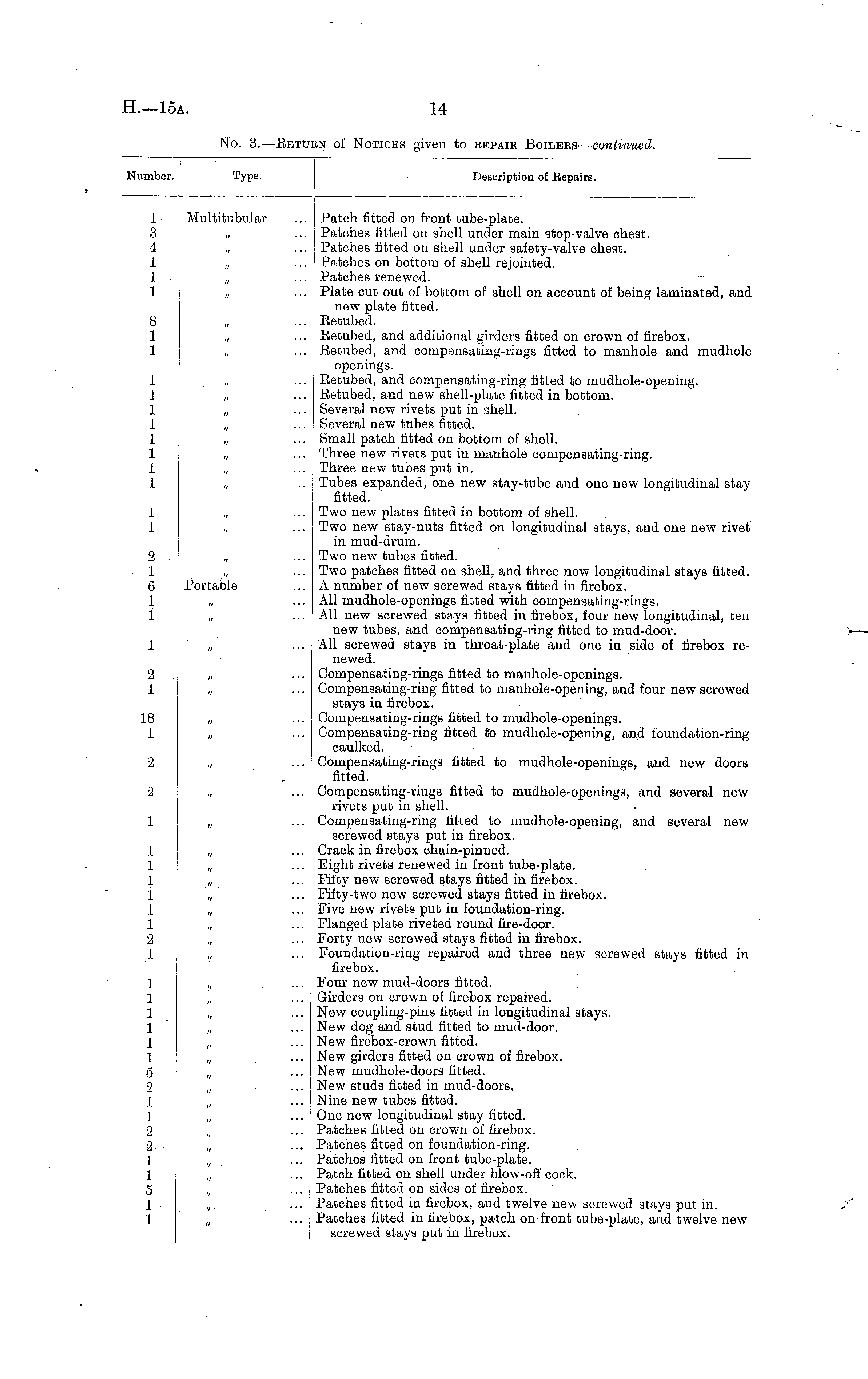 umber. Type. Description of Repairs. 1 3 4 1 1 1 8 1 1 Multitubular a a a Patch fitted on front tube-plate. Patches fitted on shell under main stop-valve chest. Patches fitted on shell under safety-valve chest. Patches on bottom of shell rejointed. Patches renewed. Plate cut out of bottom of shell on account of being laminated, and new plate fitted. Betubed. Betubed, and additional girders fitted on crown of firebox. Betubed, and compensating-rings fitted to manhole and mudhole openings. Betubed, and compensating-ring fitted to mudhole-opening. Betubed, and new shell-plate fitted in bottom. Several new rivets put in shell. Several new tubes fitted. Small patch fitted on bottom of shell. Three new rivets put in manhole compensating-ring. Three new tubes put in. Tubes expanded, one new stay-tube and one new longitudinal stay fitted. 1 1 1 1 1 1 1 1 a it a 1 1 Two new plates fitted in bottom of shell. Two new stay-nuts fitted on longitudinal stays, and one new rivet in mud-drum. Two new tubes fitted. Two patches fitted on shell, and three new longitudinal stays fitted. A number of new screwed stays fitted in firebox. All mudhole-openings fitted with compensating-rings. All new screwed stays fitted in firebox, four new longitudinal, ten new tubes, and compensating-ring fitted to mud-door. All screwed stays in throat-plate and one in side of firebox renewed. 2 1 6 1 1 Portable a a 1 2 1 Compensating-rings fitted to manhole-openings. Compensating-ring fitted to manhole-opening, and four new screwed stays in firebox. Compensating-rings fitted to mudhole-openings. Compensating-ring fitted to mudhole-opening, and foundation-ring caulked. Compensating-rings fitted to mudhole-openings, and new doors fitted. 18 1 2 2 Compensating-rings fitted to mudhole-openings, and several new rivets put in shell. Compensating-ring fitted to mudhole-opening, and several new screwed stays put in firebox. Crack in firebox chain-pinned. Eight rivets renewed in front tube-plate. Fifty new screwed stays fitted in firebox. Fifty-two new screwed stays fitted in firebox. Five new rivets put in foundation-ring. Flanged plate riveted round fire-door. Forty new screwed stays fitted in firebox. Foundation-ring repaired and three new screwed stays fitted in firebox. 1 1 1 1 1 1 1 2 1 1 1 1 1 1 1 5 2 1 1 2 2 1 1 5 1 L Four new mud-doors fitted. Girders on crown of firebox repaired. New coupling-pins fitted in longitudinal stays. New dog and stud fitted to mud-door. New firebox-crown fitted. New girders fitted on crown of firebox. New mudhole-doors fitted. New studs fitted in mud-doors. Nine new tubes fitted. One new longitudinal stay fitted. Patches fitted on crown of firebox. Patches fitted on foundation-ring. Patches fitted on front tube-plate. Patch fitted on shell under blow-off cock. Patches fitted on sides of firebox. Patches fitted in firebox, and twelve new screwed stays put in. Patches fitted in firebox, patch on front tube-plate, and twelve new screwed stays put in firebox.
