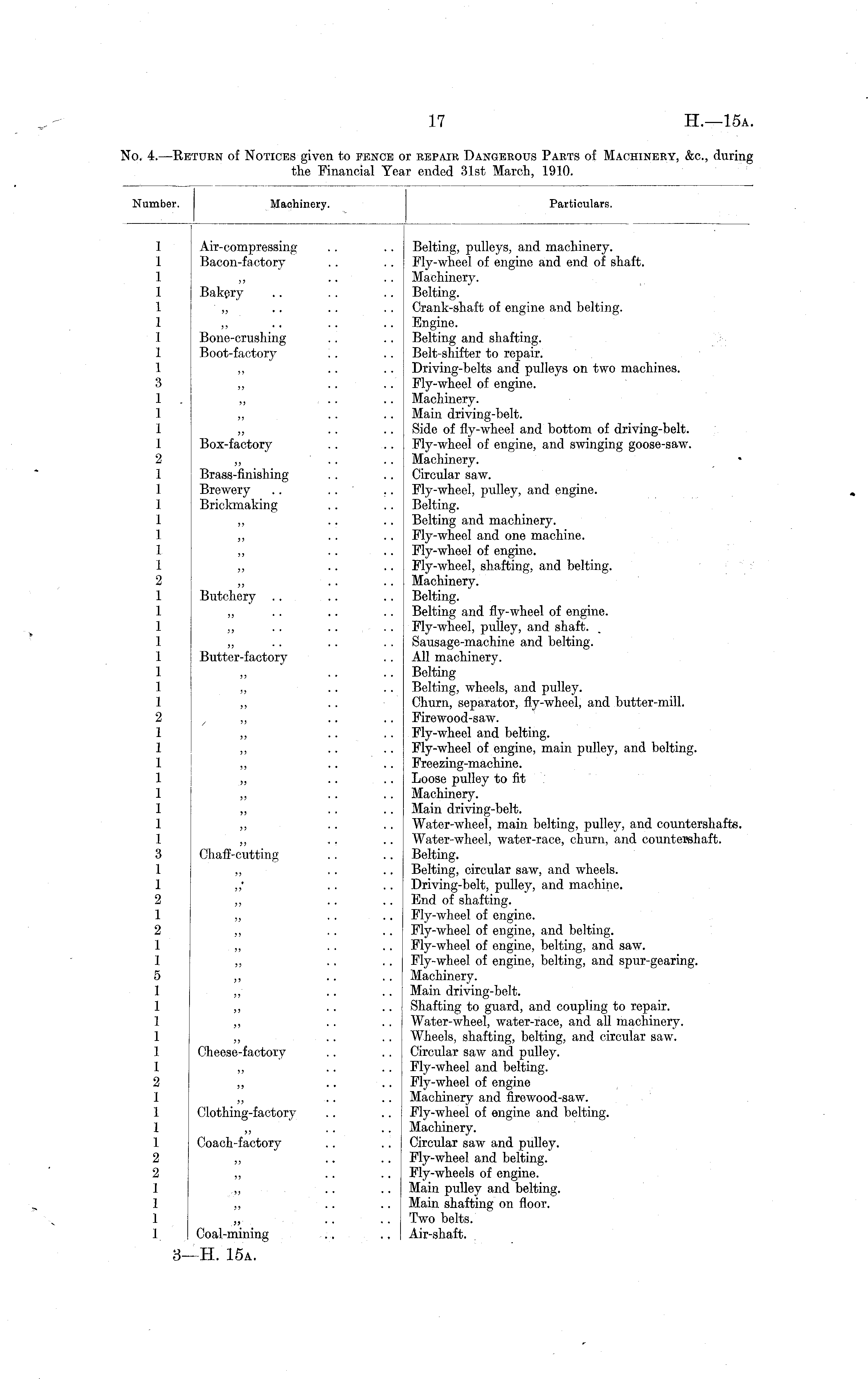 Number. Machinery. Particulars. Air-compressing Bacon-factory Bakery 3, • • 33 Bone-crushing Boot-factory 33 33 33 33 Box-factory Brass-finishing Brewery Brickmakmg 33 ,3 33 33 33 Butchery 33 " ' 33 33 ' * Butter-factory 33 33 Belting, pulleys, and machinery. Fly-wheel of engine and end of shaft. Machinery. Belting. Crank-shaft of engine and belting. Engine. Belting and shafting. Belt-shifter to repair. Driving-belts and pulleys on two machines. Fly-wheel of engine. Machinery. Main driving-belt. Side of fly-wheel and bottom of driving-belt. Fly-wheel of engine, and swinging goose-saw. Machinery. Circular saw. Fly-wheel, pulley, and engine. Belting. Belting and machinery. Fly-wheel and one machine. Fly-wheel of engine. Fly-wheel, shafting, and belting. Machinery. Belting. Belting and fly-wheel of engine. Fly-wheel, pulley, and shaft. Sausage-machine and belting. All machinery. Belting Belting, wheels, and pulley. Churn, separator, fly-wheel, and butter-mill. Firewood-saw. Fly-wheel and belting. Fly-wheel of engine, main pulley, and belting. Freezing-machine. Loose pulley to fit Machinery. Main driving-belt. Water-wheel, main belting, pulley, and countershafts. Water-wheel, water-race, churn, and countershaft. Belting. Belting, circular saw, and wheels. Driving-belt, pulley, and machine. End of shafting. Fly-wheel of engine. Fly-wheel of engine, and belting. Fly-wheel of engine, belting, and saw. Fly-wheel of engine, belting, and spur-gearing. Machinery. Main, driving-belt. Shafting to guard, and coupling to repair. Water-wheel, water-race, and all machinery. Wheels, shafting, belting, and circular saw. Circular saw and pulley. Fly-wheel and belting. Fly-wheel of engine Machinery and firewood-saw. Fly-wheel of engine and belting. Machinery. Circular saw and pulley. Fly-wheel and belting. Fly-wheels of engine. Main pulley and belting. Main shafting on floor. Two belts. Air-shaft. 33 33 33 33 33 33 33 Chaff-cutting 33 33 33 33 33 33 33 Cheese-factory 33 33 33 Clothing-factory 33 Coach-factory 33 33 33 3, Coal-mining