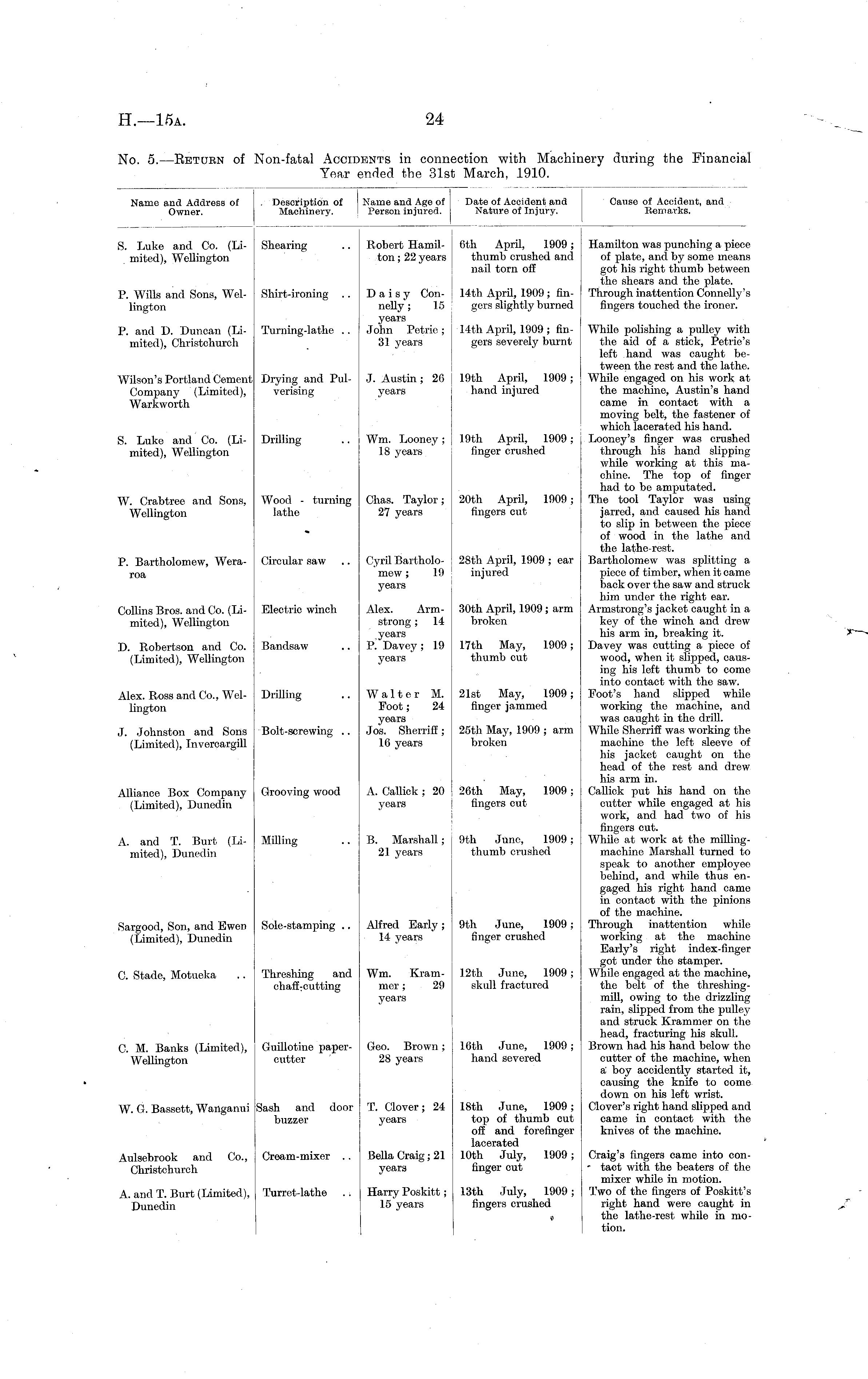 Name and Address of Owner. Description of Machinery. j Name and Age of Person injured. Date of Accident and Nature of Injury. Cause of Accident, and Remarks. S. Luke and Co. (Limited), Wellington Shearing Robert Hamilton ; 22 years 6th April, 1909; thumb crushed and nail torn off Hamilton was punching a piece of plate, and by some means got his right thumb between the shears and the plate. Through inattention Connelly's fingers touched the ironer. P. Wills and Sons, Wellington Shirt-ironing .. Daisy Connelly ; 15 years John Petrie; 31 years 14th April, 1909 ; fingers slightly burned P. and D. Duncan (Limited), Christchurch Turning-lathe .. 14th April, 1909 ; fingers severely burnt While polishing a pulley with the aid of a stick, Petrie's left hand was caught between the rest and the lathe. While engaged on his work at the machine, Austin's hand came in contact with a moving belt, the fastener of which lacerated his hand. Looney's finger was crushed through his hand slipping while working at this machine. The top of finger had to be amputated. The tool Taylor was using jarred, and caused his hand to slip in between the piece of wood in the lathe and the lathe-rest. Bartholomew was splitting a piece of timber, when it came back over the saw and struck him under the right ear. Armstrong's jacket caught in a key of the winch and drew his arm in, breaking it. Davey was cutting a piece of wood, when it slipped, causing his left thumb to come into contact with the saw. Eoot's hand slipped while working the machine, and was caught in the drill. While Sherriff was working the machine the left sleeve of his jacket caught on the head of the rest and drew his arm in. Callick put his hand on the cutter while engaged at his work, and had two of his fingers cut. While at work at the millingmachine Marshall turned to speak to another employee behind, and while thus engaged his right hand came in contact with the pinions of the machine. Through inattention while working at the machine Early's right index-finger got under the stamper. While engaged at the machine, the belt of the threshingmill, owing to the drizzling rain, slipped from the pulley and struck Krammer on the head, fracturing his skull. Brown had his hand below the cutter of the machine, when a' boy accidently started it, causing the knife to come down on his left wrist. Clover's right hand slipped and came in contact with the knives of the machine. Wilson's Portland Cement Company (Limited), Warkworth Drying and Pulverising J. Austin ; 20 years 19th April, 1909; hand injured S. Luke and Co. (Limited), Wellington Drilling Wm. Looney ; 18 years 19th April, 1909; finger crushed W. Crabtree and Sons, Wellington Wood - turning lathe Chas. Taylor ; 27 years 20th April, 1909; fingers cut P. Bartholomew, WeraCircular saw Cyril Bartholomew ; 19 years 28th April, 1909 ; ear injured roa Collins Bros, and Co. (Limited), Wellington Electric winch Alex. Armstrong ; 14 years P. Davey ; 19 years 30th April, 1909 ; arm broken D. Robertson and Co. (Limited), Wellington Bandsaw 17th May, 1909; thumb cut Alex. Ross and Co., Wellington Drilling Walter M. Foot; 24 years Jos. Sherriff; 16 years 21st May, 1909; finger jammed J. Johnston and Sons (Limited), Invercargill Bolt-screwing .. 25th May, 1909 ; arm broken Alliance Box Company (Limited), Dunedin Grooving wood A. Callick ; 20 years 26th May, 1909; fingers cut A. and T. Burt (Limited), Dunedin Milling B. Marshall; 21 years 9th June, 1909; thumb crushed Sargood, Son, and Ewen (Limited), Dunedin Sole-stamping .. Alfred Early; 14 years 9th June, 1909; finger crushed C. Stade, Motueka Threshing and chaffcutting Wm. Krammer; 29 years 12th June, 1909; skull fractured C. M. Banks (Limited), Wellington Guillotine papercutter Geo. Brown ; 28 years 16th June, 1909; hand severed W. G. Bassett, Wanganui Sash and door buzzer T. Clover; 24 years 18th June, 1909; top of thumb cut off and forefinger lacerated 10th July, 1909; finger cut Aulsebrook and Co., Christchurch Cream-mixer .. Bella Craig; 21 Craig's fingers came into con- - tact with the beaters of the mixer while in motion. Two of the fingers of Poskitt's right hand were caught in the lathe-rest while in motion. years A. and T. Burt (Limited), Dunedin Turret-lathe Harry Poskitt; 15 years 13th July, 1909; fingers crushed 9