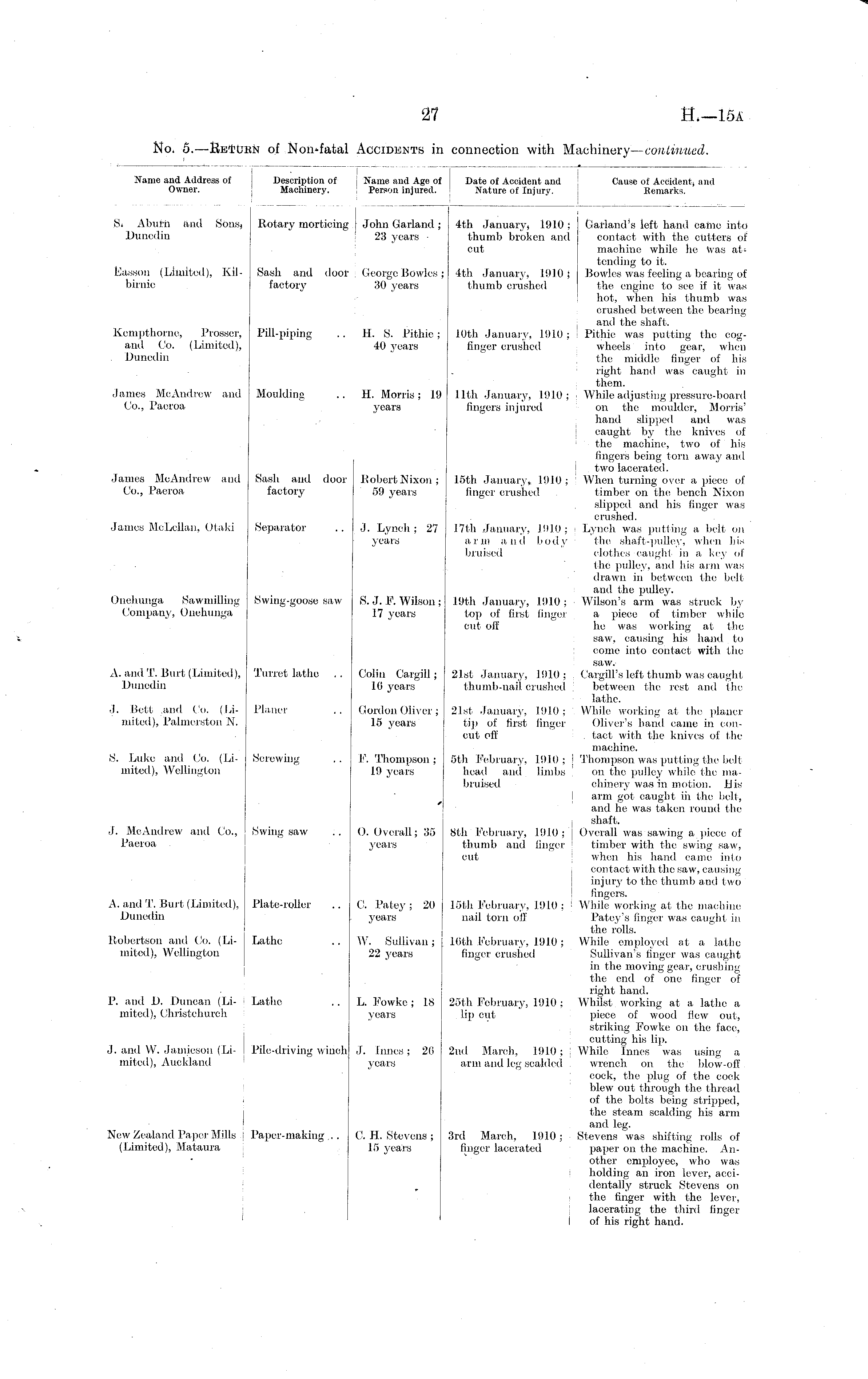 Name and Address of Description of , Name and Age of Owner. Machinery. Person injured. Date of Accident and Cause of Accident, and Nature of Injury. Eemarks. I 8i A buffi and SonS) Rotary morticing I John Garland ; Dunedin 23 years ■ 4th January, 1910 ; Garland's left hand came into thumb broken and contact with the cutters of cut machine while he was attending to it. 4th January, 1910; Bowles was feeling a bearing of thumb crushed the engine to see if it was hot, when his thumb was crushed between the bearing and the shaft. 10th January, 1910 ; Pithie was putting the cogfinger crushed wheels into gear, when the middle linger of his right hand was caught in them. 11th .January, 191.0; While adjusting pressure-board fingers injured on the moulder, Morris' hand slipped and was caught by the knives of the machine, two of his fingers being torn away anil two lacerated. 15th January, 1910 ; When turning over a piece of finger crushed timber on the bench Nixon slipped and his finger was crushed. 17th January, 1910 ; i Lynch was putting a belt on arm and body the shaft-pulley, when his bruised clothes caught in a key of the pulley, anil Ids arm was drawn in between the belt and the pulley. 19th January, 1910 ; Wilson's arm was struck by top of first linger a piece of timber while cut off he was working at the saw, causing his hand to come into contact with tire Easson (Limited), Kil- Sash and door George Bowles; birnie factory 30 years Kempt-homo, Prosser, Pill-piping .. H. S. Pithie; and Co. (Limited), 40 years Dunedin James McAndrew and Moulding .. H. Morris; 19 Co., Paeroa years James McAndrew and Sash and door Robert Nixon; Co., Paeroa factory 59 years James MoLellan, Otaki Separator .. J. Lynch; 27 years Onehunga Sawmilling Swing-goose saw S. ,1. F. Wilson ; Company, Onehunga 17 years A. and T. Burt (Limited), Turret lathe .. Colin Cargill; Dunedin 16 years saw.' 21st January, 1910; Car-gill's left thumb was caught thumb-nail crushed between the rest and the lathe. 21st January, 1910; While working at the planer tip of first finger Oliver's hand came in concut off tact with the knives of the machine. 5th February, 1910 ; I Thompson was putting the belt head and limbs on the pulley while the mabruised chinery was in motion. Disarm got caught in the licit, and he was taken round tinshaft. 8th February, 1910; ! Overall was sawing a piece of thumb and finger | timber with the swing saw, cut when his hand came into contact with the saw, causing injury to the thumb and two fingers. 15th February, 1910 ; ; While working at the machine nail torn oil Patey's finger was caught in the rolls. Kith February, 1.910; While employed at a lathe finger crushed Sullivan's finger was caught in the moving gear, crushing the end of one finger of right hand. 25th February, 1910 ; Whilst working at a lathe a lip cut piece of wood flew out, striking Fowke on the face, cutting his lip. 2nd March, 1910; While Innes was using a arm and leg scalded wrench on the blow-off cock, the plug of the cock blew out through the thread of the bolts being stripped, the steam scalding his arm and leg. 3rd March, 1910; Stevens was shifting rolls of linger lacerated paper on the machine. Airother employee, who was holding an iron lever, accidentally struck Stevens on the finger with the lever, lacerating the third finger I of his right hand. J. Rett and Co. (Li- Planer .. Cordon Oliver; mited), Palmerston N. 15 years iS. Luke and Co. (Li- Screwing .. F. Thompson; mited), Wellington 19 years f J. McAndrew and Co., Swing saw .. 0. Overall; 35 Paeroa years A. and T. Burt (Limited), Plate-roller .. C. Patey ; 20 Dunedin years Robertson and Co. (Li- Lathe .. W. Sullivan; mited), Wellington 22 years P. and D. Duncan (Li- Lathe . . L. Fowke; 18 mited), Christchurch years J. and W. Jamieson (Li- \ Pile-driving winch J. limes; 2(i mited), Auckland years ! New Zealand Paper Mills i Paper-making... C.H.Stevens; (Limited), Mataura 15 years