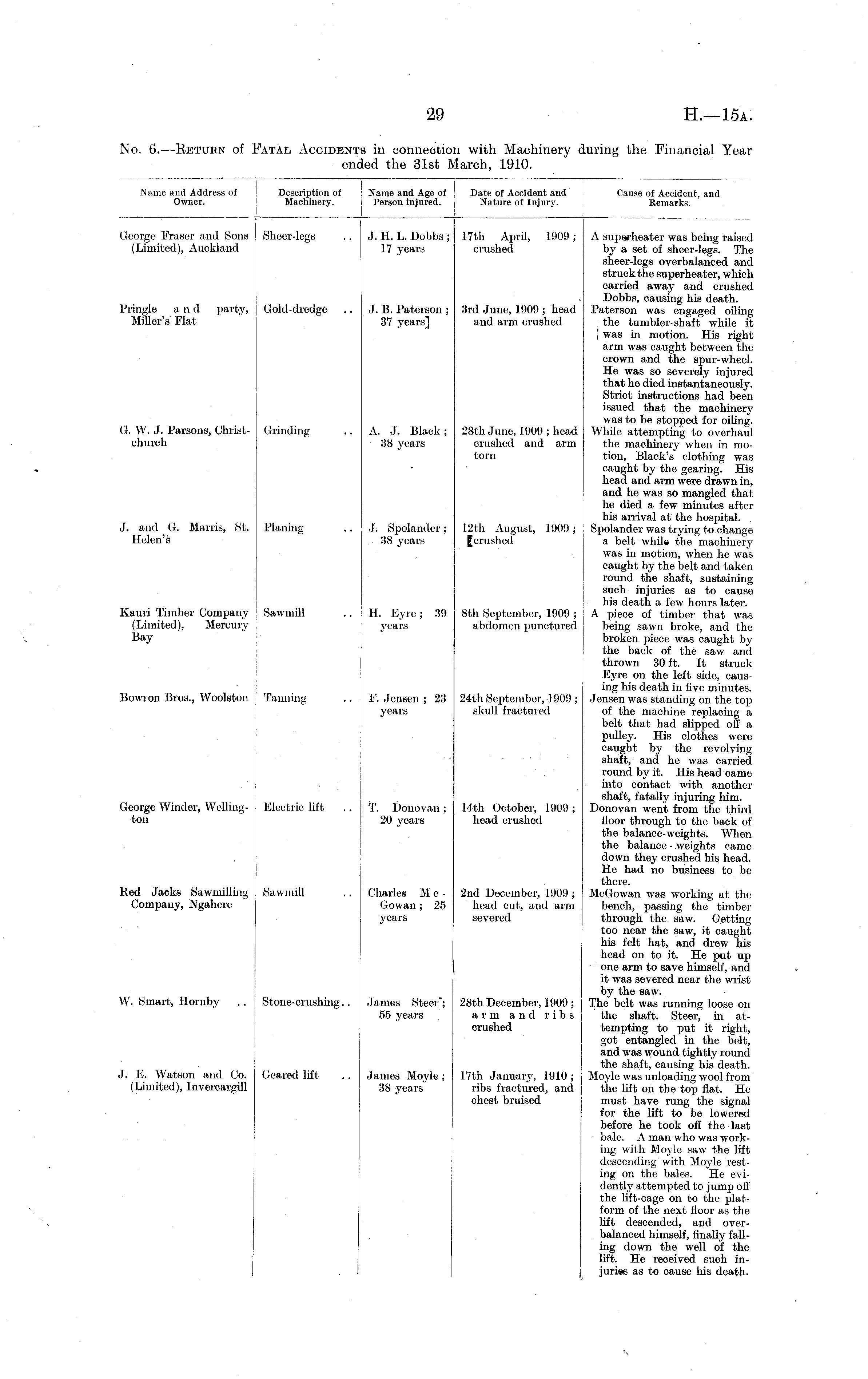 I Name and Address of Owner. Description of Machinery. Name and Age of : Person injured. Date of Accident and Nature of Injury. Cause of Accident, and Remarks. George Eraser ami Sons (Limited), Auckland Pringle a n d party, Miller's Flat G. W. J. Parsons, Christchurch J. and G. Marris, St. Helen's Kauri Timber Company (Limited), Mercury Bay Bowron Bros., Woolston Sheer-legs Gold-dredge Grinding Planing Sawmill Tanning A. J. Black ; 38 years J. Spolander ; 38 years H. Eyre; 39 years F. Jensen ; 23 years J.H.L. Dobbs; 17 3'ears J. B. Paterson ; 37 years] 17th April, 1909; crushed 3rd June, 1909 ; head and arm crushed 28th June, 1909; head crushed and arm torn 12th August, 1909 ; {^crushed 8th September, 1909 ; abdomen punctured 24th September, 1909; skull fractured A suparheater was being raised by a set of sheer-legs. The sheer-legs overbalanced and struck the superheater, which carried away and crushed Dobbs, causing his death. Paterson was engaged oiling the tumbler-shaft while it [ was in motion. His right arm was caught between the crown and the spur-wheel. He was so severely injured that he died instantaneously. Strict instructions had been issued that the machinery was to be stopped for oiling. While attempting to overhaul the machinery when in motion, Black's clothing was caught by the gearing. His head and arm were drawn in, and he was so mangled that he died a few minutes after his arrival at the hospital. Spolander was trying to.change a belt while the machinery was in motion, when he was caught by the belt and taken round the shaft, sustaining such injuries as to cause his death a few hours later. A piece of timber that was being sawn broke, and the broken piece was caught by the back of the saw and thrown 30 ft. It struck Eyre on the left side, causing his death in five minutes. Jensen was standing on the top of the machine replacing a belt that had slipped off a pulley. His clothes were caught by the revolving shaft, and he was carried round by it. His head came into contact with another shaft, fatally injuring him. Donovan went from the third floor through to the back of the balance-weights. When the balance - weights came down they crushed his head. He had no business to be there. McGowan was working- at the bench, passing the timber through the saw. Getting too near the saw, it caught his felt hat, and drew his head on to it. He put up one arm to save himself, and it was severed near the wrist by the saw. The belt was running loose on the shaft. Steer, in attempting to put it right, got entangled in the bolt, and was wound tightly round the shaft, causing his death. Moyle was unloading wool from the lift on the top flat. He must have rung the signal for the lift to be lowered before he took off the last bale. A. man who was working with Moyle saw the lift descending with Moyle resting on the bales. He evidently attempted to jump off the lift-cage on to the platform of the next floor as the lift descended, and overbalanced himself, finally falling down the well of the lift. Ho received such injuries as to cause his death. George Winder, Wellington Electric lift T. Donovan; 20 years 14th October, 1909; head crushed Sawmill Charles M c - Gowan ; 25 2nd December, 1909 ; head cut, and arm severed Red Jacks Sawmilling Company, Ngaherc years W. Smart, Hornby James Steer"; 55 years 28th December, 1909; arm and ribs crushed Stone-crushing.. J. E. Watson and Co. (Limited), Invercargill Geared lift James Moyle ; 38 years 17th January, 1910; ribs fractured, and chest bruised