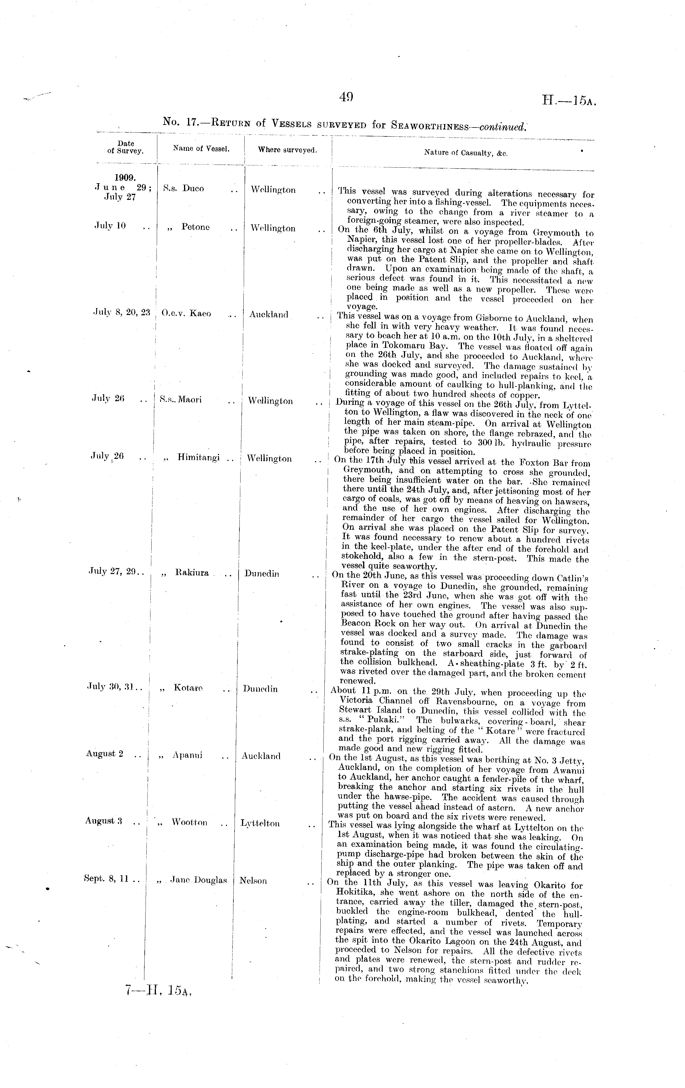 of Survey. Name of Ve3sel - of Survey. Where surveyed. Mature of Casualty, Ac. j July 27, 20 „ Rakiura 1909. June 29; S.s. Duco July 27 July 10 .. ,, Petone July 8, 20, 23 j O.e.v. Kaeo July 26 .. I S.s.. Maori July 26 . . „ Himitangi . . 1909. J u n e 29 ; July 27 July 10 Wellington .. ; This vessel was surveyed during alterations necessary for converting her into a fishing-vessel. The equipments necessary, owing- to the change from a river steamer- to a w .,. foreign-going steamer, were also inspected. Wellington .. On the 6th July, whilst on a voyage from Greymouth to Napier, this vessel lost one of her propeller-blades. After discharging her cargo at Napier she came on to Wellington, was put on the Patent Slip, and the propeller and shaft drawn. Upon an examination being made of the shaft, a serious defect was found in it. This necessitated a new one being made as well as a new propeller. These were placed in position and the vessel proceeded on her voyage. Auckland . . j This vessel was on a voyage from Gisborne to Auckland, when she fell in with very heavy weather. It was found necessary to beach her at 10 a.m. on the 10th July, in a sheltered place in Tokomaru Bay. The vessel was floated off again on the 26th July, and she proceeded to Auckland, where she was docked and surveyed. The damage sustained l>v grounding was made good, and included repairs to keel, a considerable amount of caulking to hull-planking, and ihe 1 fitting of about two hundred sheets of copper. Wellington .. | During a voyage of this vessel on the 26th July, from Lyttelton to Wellington, a flaw was discovered in the neck of one length of her main steam-pipe. On arrival at Wellington the pipe was taken on shore, the flange rebrazed and the pipe, after repairs, tested to 3001b. hydraulic pressure ;' before being placed in position. Wellington .. ; On the 17th July this vessel arrived at the Foxton Bar from Greymouth, and on attempting to cross she grounded there being insufficient water on the bar. -She remained there until the 24th July, and, after jettisoning most of her cargo of coals, was got off by means of heaving on hawsers, and the use of her own engines. After discharging the remainder of her cargo the vessel sailed for Wellington. On arrival she was placed on the Patent Slip for survey. It was found necessary to renew about a hundred rivets in the keel-plate, under the after end of the forehold and stokehold, also a few in the stern-post. This made the vessel quite seaworthy. I Dunedin .. : On the 20th June, as this vessel was 'proceeding down Catlin's River on a voyage to Dunedin, she grounded, remaining fast until the 23rd June, when she was got off with the assistance of her own engines. The vessel was also supposed to have touched the ground after having passed the Beacon Rock on her way out. On arrival at Dunedin the vessel was docked and a survey made. The damage was found to consist of two small cracks in the garboard strake-plating on the starboard, side, just forward of the collision bulkhead. A. sheathing-plate 3 ft. by "2 ft. was riveted over the damaged part, and the broken cemenl renewed. Dunedin .. | About 11p.m. on the 29th July, when proceeding up the Victoria Channel off Ravensbourno, on a voyage from Stewart Island to Dunedin, this vessel collided with the s.s. " Pukaki." The bulwarks, covering - board, shear strake-plank, and belting of the " Kotare " were fractured and the port rigging carried away. All the damage was made good and new rigging fitted. Auckland .. On the 1st August, as this vessel was berthing at No. 3 Jetty, Auckland, on the completion of her voyage from Awaniii to Auckland, her anchor caught a fender-pile of the wharf, breaking the anchor and starting six rivets in the hull under the hawse-pipe. The accident was caused through putting the vessel ahead instead of astern. A new anchor was put on board and the six rivets were renewed. Lyttelton .. This vessel was lying alongside the wharf at Lyttelton on the 1st August, when it was noticed that she was leaking. On an examination being made, it was found the circulatingpump discharge-pipe had broken between the skin of the ship and the outer planking. The pipe was taken off and replaced by a stronger one. Nelson .. On the 11th July, as this vessel was leaving Okarito for Hokitika, she went ashore on the north side of the entrance, carried away the tiller, damaged the stern-post, buckled the engine-room bulkhead, dented' the hullplating, and started a number of rivets. Temporary repairs were effected, and the vessel was launched across the spit into the Okarito Lagoon on the 24th August, and proceeded to Nelson for repairs. All the defective rivets and plates were renewed, the stern-post and rudder repaired, and two strong stanchions fitted under the deck on the forehold, making the vessel seaworthy. T „. July 30,31.. ; „ Kotaro August 2 .. j „ Apanui 1 August 3 August 3 .. .j .'„ Woollen ■ ■ . i Sept. 8, 11 .. Sept. 8, 11 .. „ .lane Douglas
