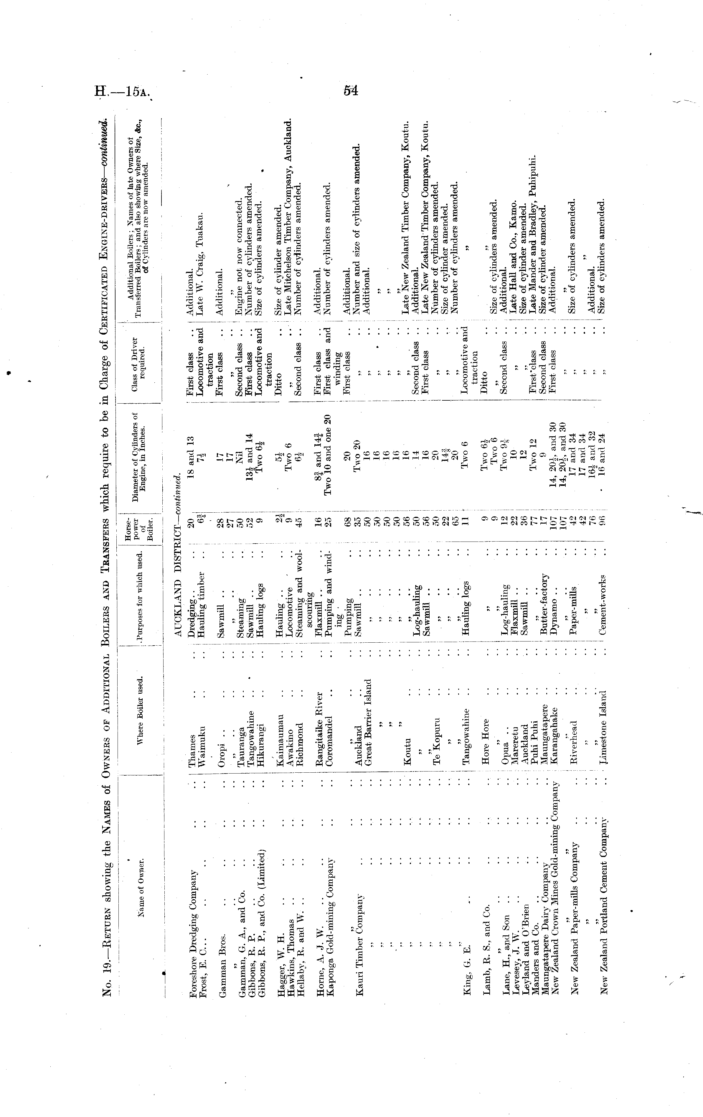 Name of Owner. Where Boiler used. I ,. '' I ■ • I' Horse- . t.„i„„„ Additional Boilers; Names of late Owners of ' I'urcoses for which used pow : er I Dia m eter of Cylinders ot Class of Driver ; Transterred Boilers . and als0 sh0 win a where Size, &c., j 1 urposes which used. f _)_ gme , m Inches. required. o£ Cv]judel , are now amencled . Boiler, i AUCKLAND DISTRICT— continued. Foreshore Dredging Company .. .. Thames Frost, E.G... .. * .. .. ■ ■ Waimuku Gamman Bros. .. .. .. .. Oropi Gamman, G. A., and Co. .. .. .. Tauranga Gibbons, R. P. .. .. .. .. Tangowahine Gibbons, R. P., and Co. (Limited) .. .. Hikurangi Hao-ger, W. H. .. .. .. .. Kaimaumau Hawkins, Thomas .. .. .. ... Awakino Hellaby, R. and W. .. .. .. .. I Richmond Home, A. J. W. .. .. .. .. Rangitaike River Kaponga Gold-mining Company .. .. Coromandel Kauri Timber Company .. .. .. Aucldand Great Barrier Island ,. ... ... ..' Koutu .. I Te Kopuru King, G. E. .. .. .. . • j Tangowahine Lamb, R. S., and Co. .. .. ,, I Hore Hore Lane, H., and Son .. .. .. .. Opua Levesey, J. W. .. .. .. .. Mareretu Leyland and O'Brien .. .. .. ■ Auckland Manders and Co. .. .. .. .. Puhi Puhi Maungatapere Dairy Company .. .. Maungatapere .. New Zealand Crown Mines Gold-mining Company Karangahake New Zealand Paper-mills Company .. .. Riverhead ,, - • ■ • 33 New Zealand Portland Cement Company .. ■ Limestone Island Dredging.. .... 1 20 18 and 13 j First class .. | Additional. .. ; Hauling timber .. 6f 7-1 ■ Locomotive and j Late W. Craig, Tuakau. • | traction Sawmill .. .. 28 17 First class .. ' Additional. ..!„.. 27 | 17 „ .. j Steamino- .,., 50 Nil Second class .. Engine not now connected. Sawmill".. .. : 52 134 and 14 First class .. : Number of cylinders amended. .. ; Haulino- logs .. | 9 Two 64 Locomotive and ' Size of cylinders amended. traction I Haulino- .. .. 24 54 Ditto .. Size of cylinder amended. | Locomotive .. j 9 Two 6 „ ..- Late Mitchelson Timber Company, Auckland. .. I Steaming and wool- 45 61 Second class .. Number of cylinders amended. scouring .. I Flaxmill .. . ... 16 8f and 14f ! First class .. Additional. .. ' Pumping and wind- I 25 ; Two 10 and one 20 \ First class and Number of cylinders amended. ing - : winding .. i Pnmpino- .. 68 20 : First class .. , Additional. ; Sawmill .. .. 35 ! Two 20 „ .. Number and size of cylinders amended. .. 50 16 ,. .. : Additional. ,,'.-. ..50 16 ,. . .. ..,,.. .. 50 16 ! „ ... „ .. ..50 16 .. j , .. .. 56 16 ,, ... Late New Zealand Timber Company, Koutu. .. ! Log-hauling .. 50 14 : Second class .. Additional. . Sawmill .. .. 56 16 First class .. Late New Zealand Timber Company, Koutu. ' .. .. 50 20 „ .. Number of cylinders amended. . . I , .. .. 22 14f ,, .. Size of cylinder amended. .'. '.. .. 65 20 ,, .. Number of cylinders amended. .. | Hauling logs .. lit Two 6 Locomotive and „ traction .. | „ .. 9 Two 64 Ditto .. „ .. 9 : Two 6 „ .. Size of cylinders amended. .. j Log-hauling .. 12 j Two 9J Second class .. Additional. .. j Flaxmill .. 22 j 10 „ .. Late Hall and Co., Kamo. .. I Sawmill .. .. 36; 12 „ .. Size of cylinder amended. n .. .. 77 Two 12 First'class .. Late Mander and Bradley, Puhipuhi. .. ■ Butter -factory .. 17 9 Second class . . Size of cylinder amended. .. i Dynamo.. .. 107 14, 201. and 30 First class .. j Additional. .. 1 „ .. .. 107 14, 20l, and 30 „ - - ! » .. | Paper-mills 42 17 and 34 ,, .. Size of cylinders amended. .. I ,. .. 42 17 and 34 „ .. j „ .. 76 j 161 and 32 „ .. j Additional. .. ' Cement-works .. 96 I -16 and 24 „ .. ' Size of cylinders amended.