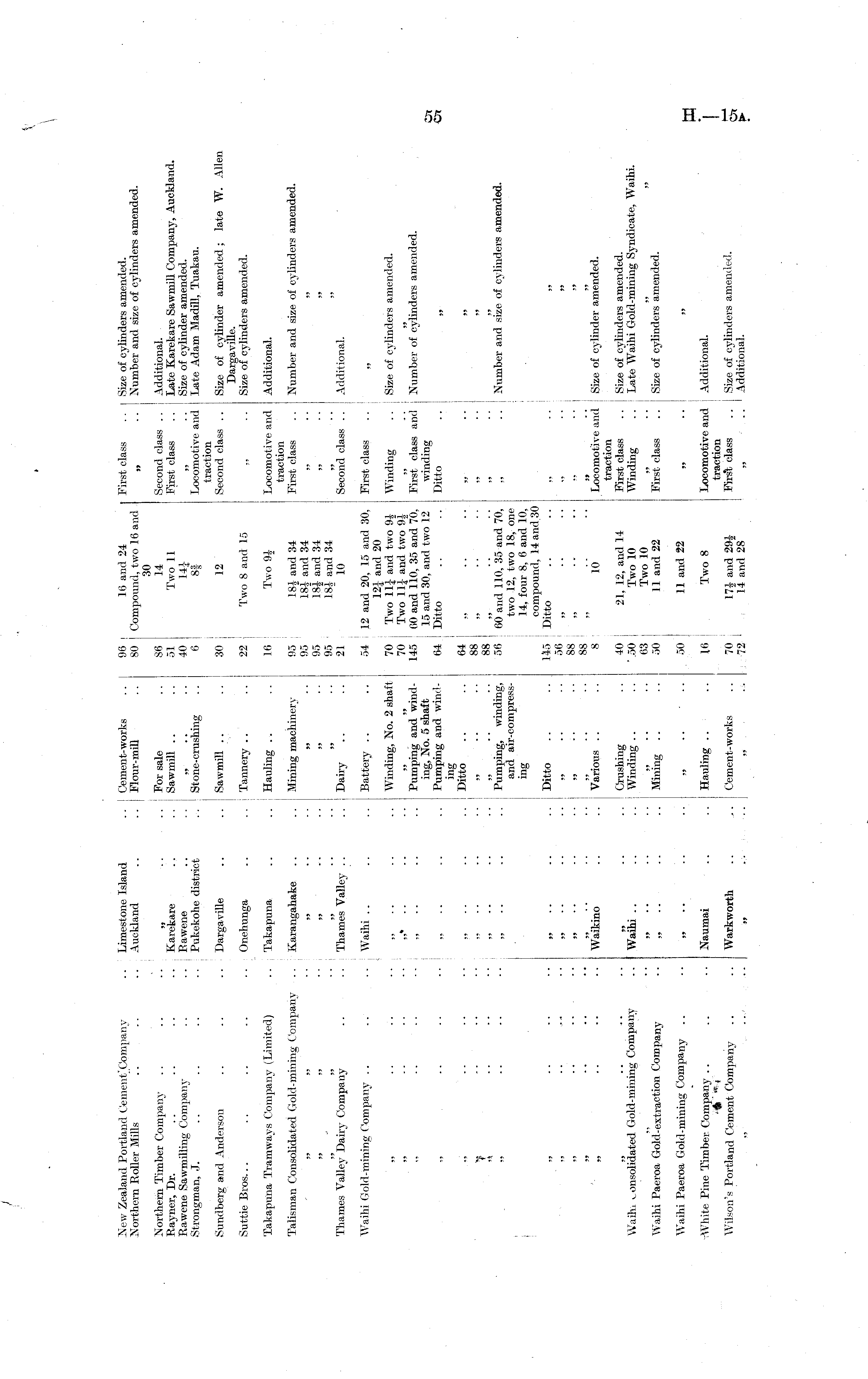 New Zealand Portland Cement" Company Northern Roller Mills Limestone Island Auckland Cement-works Flour-mill .. j 96 | 16 and 24 80 Compound, two 16 and 30 86 14 51 Two 11 40 141 6 8| First class .. Size of cylinders amended. „ .. dumber and size of cylinders amended. Second class .. j Additional. First class .. j Late Karekare Sawmill Company, Auckland. ,, .. Size of cylinder amended. Locomotive and j Late Adam Madill, Tuakau. traction Second class .. Size of cylinder amended; late W. Allen Dargaville. ,, .. Size of cylinders amended. Locomotive and Additional. traction First class .. Number and size of cylinders amended. Northern Timber Company R,ayner, Dr. Rawene Sawmilling Company Strongman, J. Sundberg and Anderson .. I Karekare .. j Rawene Pukekohe district Dargaville For sale Sawmill .. „ .. .. i Stone-crushing Sawmill 30 ; 12 Suttie Bros... Onehunga Tannery .. 22 | Two 8 and 15 Takapuna Tramways Company (Limited) .. . Takapuna Hauling 16 [ Two 91Talisman Consolidated Gold-mining Company Karangahake Mining machinery 95 184 and Si 95 18i am i 34 95 181 and 34 95 181 and 34 21 " 10 .. Thames Valley Dairy Company Thames Valley .. Dairy .. Second class . . 1 Additional. First class .. ,, Waihi Gold-mining Company .. .. J Waihi • • • .. i Battery Winding, No. 2 shaft 54 12 and 20, 15 and 30, 12-1 and 20 70 Two IIP and two 94 70 j Two 111 an( i two 91 145 : 00 and 110, 35 and 70, : 15 and 30, and two 12 64 I Ditto Winding .. ] Size of cylinders amended. ■ • I Pumping and winding, No. 5 shaft Pumping and winding Ditto First class and j Number of cylinders amended. winding Ditto .. j 9 \ I Pumping, winding, and air-compress-ing 64 j „ 88 i 88 1 56 60 and 110, 35 and 70, two 12, two 18, one 14, four 8, 6 and 10, compound, 14 and 30 145 i Ditto 56 I „ 88 : „ 88 : „ 8 10 H) * * i » „ .. I Number and size of cylinders amended. »J> Ditto i ,, .. » - „ •• ,, . . - " Waikino Various 333 ' * _ 33 Locomotive and j Size of cylinder amended. traction First class .. j Size of cylinders amended. Winding .. ! Late Waihi Gold-mining S3-ndicate, Waihi. Waihi consolidated Gold-mining Company - • Waihi .. '.'. .. Crushing Winding 40 | 21, 12, and 14 •.50 j Two 10 63 ! Two 10 50 | 11 and 22 Waihi Paeroa Gold-extraction Company ,, .. Mining First class .. Size of cylinders amended. Waihi Paeroa Gold-mining Company ,, 50 11 and 22 !! • • I » -White Pine Timber Company .. Wilson's Portland Cement Company Naumai Warkworth Hauling 16 I Two 8 Locomotive and Additional. traction First, class .. | Size of cylinders amended. „ .. 1 Additional. Cement- works 70 I 174 and 294 72 ' 14 and 28 • • I „ •• ■• I ... I