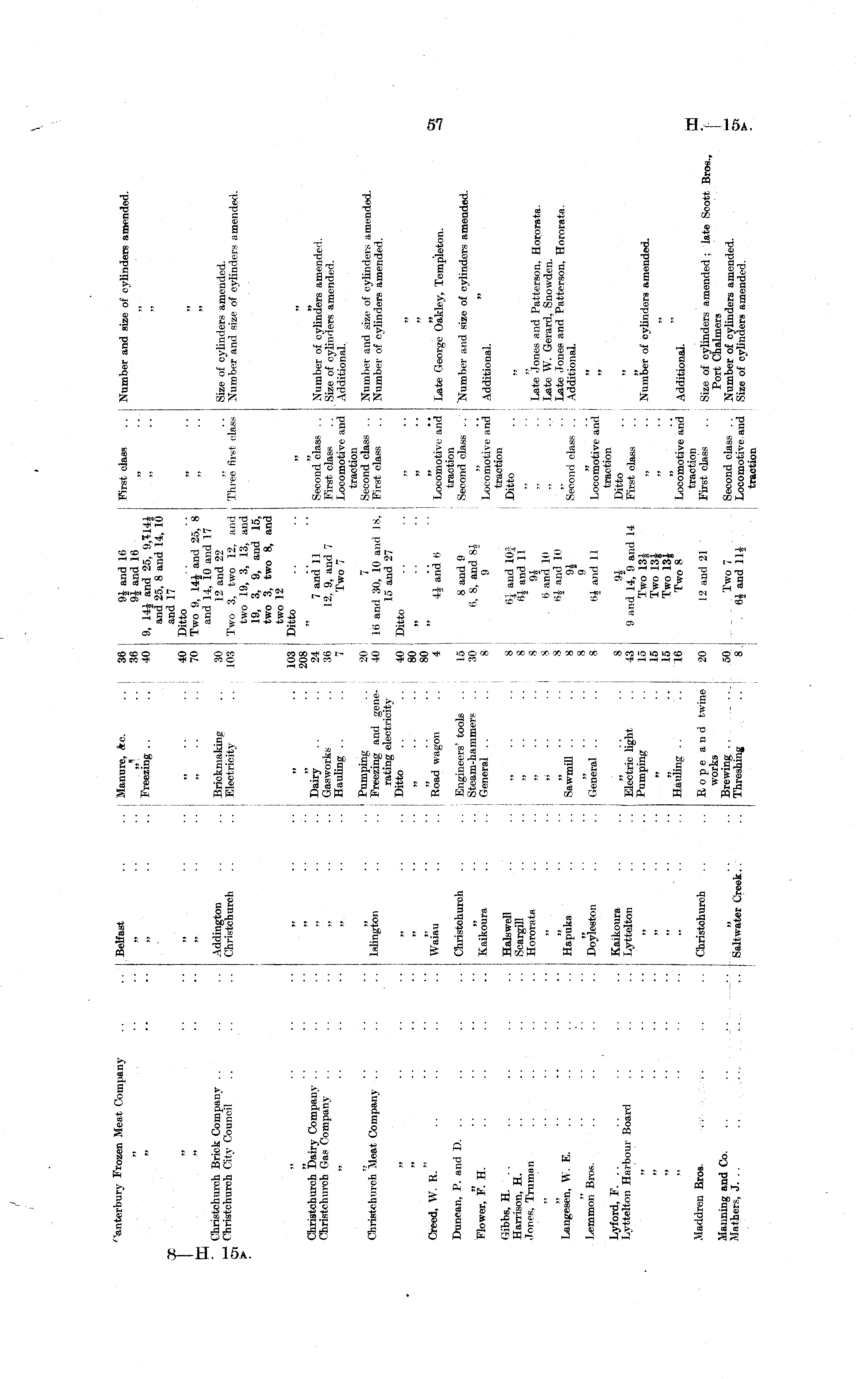 "anterbury Frozen Meat Company Christchurch Brick Company . . Christchurch City Council Christchurch Dairy Company .. Christchurch Gas Company Christchurch Meat Company .. Creed, W. R. Belfast Addington Christchurch Islington Waiau Christchureh Kaikoura Halswell Scargill Hororata Hapuka Doyleeton Kaikoura Lyttelton Christohuroh Saltwater Creek.. .. 1 Manure, *c. .. I 36 „1 ., ' 36 .. j Freezing .. .. 40 70 Brickmaking .. 30 .. Electricity .. I 103 .. I 103 .. j 208 Dairy .. .. 24 I Gasworks .. j 36 i .. j Hauling .. . . | 7 I .. ' Pumping . . 20 ' .. j Freezing and gene- 40 rating electricity .. Ditto .. .. 40 .. I 80 ..80 Road wagon .. 4 Engineers' tools .. j 15 .. j Steam-hammers .. 1 30 .. ' General . . .. ; 8 :: ;; :: :: I 8 .. Sawmill .. . . I 8 .. I 8 General .. .. 8 8 .. Electric light . . 43 Pumping . . 15 ..15 ..15 Hauling .. .. 16 Rope and twine 20 works Brewing .. ...... 50, Threshing .. 8, 94 and 16 94 and 16 9, 144 and 25, 9,1144 and 25, 8 and 14, 10 and 17 Ditto Two 9, 144 and 25. 8 and 14, 10 and 17 12 and 22 Two 3, two 12, and two 19, 3, 13, and 19, 3, 9, and 15, two 3, two 8, and two 12 Ditto 7 and 11 12, 9, and 7 Two 7 7 16 and 30, 10 and 18, 15 and 27 Ditto 44 and 6 8 and 9 6, 8, and 8-5-9 6-j, and 10$ H| and 11 94 . 6 and 10 64 and 10 9 64 and 11 9 and 14, 9 and 14 Two 13| Two 13J Two 13J Two 8 12 and 21 Two 7 . 64 and 114 First class .. Number and size of cylinders amended. „ ■ . Size of cylinders amended. Three first class Number and size of cylinders amended. Second class . . Number of cylinders amended. First class .. Size of cylinders amended. Locomotive and Additional, traction | Second class .. Number and size of cylinders amended. First class . . Number of cylinders amended. Locomotive and Late George Oakley, Templeton. traction Second class ... 'Number and size of cylinders amended. Locomotive and Additional. i traction Ditto .. ; ., . - Late Jones and Patterson, Hororata. .3 ... I Late W. Gerard, Snowden. „ • • | Late Jones and Patterson, Hororata. Second class . . | Additional. Locomotive and I „ traction Ditto .■. j First class . .. I „ ., .. | Number of cylinders amended. Locomotive and ! Additional. traction First class .. j Size of cylinders amended ; late Scott Br< Port Chalmers Second class .. : Number of cyilmders amended. Locomotive and i Size of cylinders amended. traction Duncan, P. and D. . . Flower, F. H. Gibbs, H. .. Harrison, H. Jones. Truman .. .. Langesen, W. E. Lemmon Bros. Lyford, F. .. Lyttelton Harbour Board Maddren Bros. .-;-. .-..-... Manning and Co. Mathers, J. . , .. ...