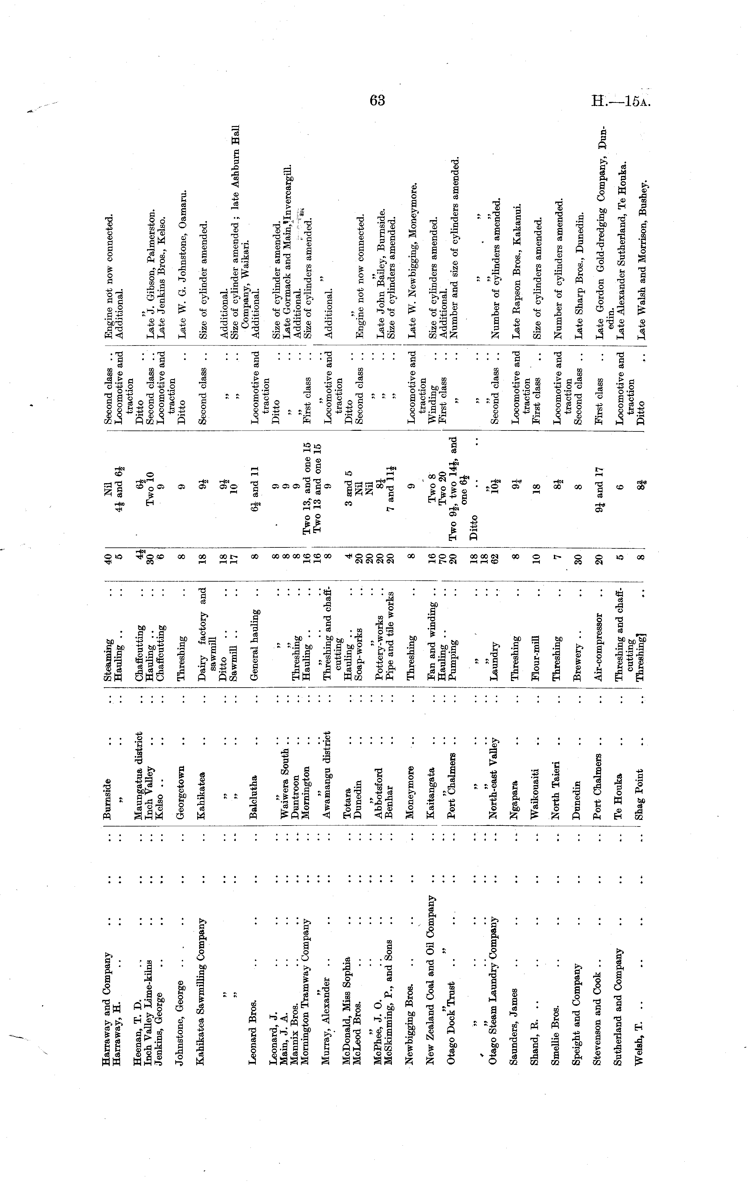 Harraway and Company Harraway, H. Burnside Steaming Hauling 40 5 NU 4J and 64 Second class .. Locomotive and traction Ditto Second class .. Locomotive and traction Ditto Engine not now connected. Additional. ,» Heenan, T. D. Inch VaUey Lime-kUns Jenkins, George Maungatua district Inch VaUey Kelso Chaffcutting Hauling Chaffcutting ii 30 6 Two 10 9 Late J. Gibson, Palmerston. Late Jenkins Bros., Kelso. Johnstone, George ... Georgetown Threshing 8 9 Late W. G. Johnstone, Oamaru. Kahikatea Sawmilling Company Kahikatea Dairy factory and SawmiU Ditto SawmiU 18 94 Second class .. Size of cylinder amended. 31 33 • • 18 17 94 10 Additional. Size of cylinder amended ; late Ashburn Hall Company, Waikari. Additional. Leonard Bros. Balclutha General hauling 8 64 and 11 Locomotive and traction Ditto Leonard, J. Main, J. A. Mannix Bros. Mornington Tramway Company Waiwera South .. Duntroon Mornington Threshing Hauling 8 8 8 16 16 8 9 9 9 Size of cylinder amended. Late Gormack and Main,*InvercargiU. Additional. r - - ,-.:, Size of cylinders amended. Two 13, and one 15 Two 13 and one 15 9 First class Murray, Alexander Awamangu district Threshing and chaffcutting Hauling Soap-works Locomotive and traction Ditto Second class .. Additional. McDonald, Miss Sophia McLeod Bros. Totara Dunedin 4 20 20 20 20 3 and 5 NU NU 8$ 7 and 114 Engine not now connected. McPhee, J. 0. McSkimming, P., and Sons Abbotsford Benhar Pottery- works Pipe and tile works Late John Bailey, Burnside. Size of cylinders amended. Newbigging Bros. Moneymore Threshing 8 9 Locomotive and traction Winding First class Late W. Newbigging, Moneymore. New Zealand Coal and OU Company Otago Dock Trust .. .. Kaitangata Port Chalmers .. Fan and winding .. Hauling Pumping 16 70 20 Two 8 Two 20 Two 94, two 144, and one 64 Size of cylinders amended. Additional. Number and size of cylinders amended. ,, . . . . Otago Steam Laundry Company North-east VaUey >i . • Laundry 18 18 62 Ditto 104 Second class .. Number of cylinders amended. Saunders, James Ngapara Threshing 8 9| Locomotive and traction First class Late Rapson Bros., Kakanui. Shand, R. .. Waikouaiti Flour-miU 10 18 Size of cylinders amended. SmeUie Bros. North Taieri Threshing 7 84 Locomotive and traction Second class .. Number of cylinders amended. Speight and Company Dunedin Brewery 30 8 Late Sharp Bros., Dunedin. Stevenson and Cook .. Port Chalmers .. Air-compressor 20 9$ and 17 First class Late Gordon Gold-dredging Company, Dunedin. Late Alexander Sutherland, Te Houka. Sutherland and Company Te Houka Threshing and chaffcutting Threshing] 5 6 Locomotive and traction Ditto Welsh, T. .. Shag Point 8 8$ Late Walsh and Morrison, Bushey.