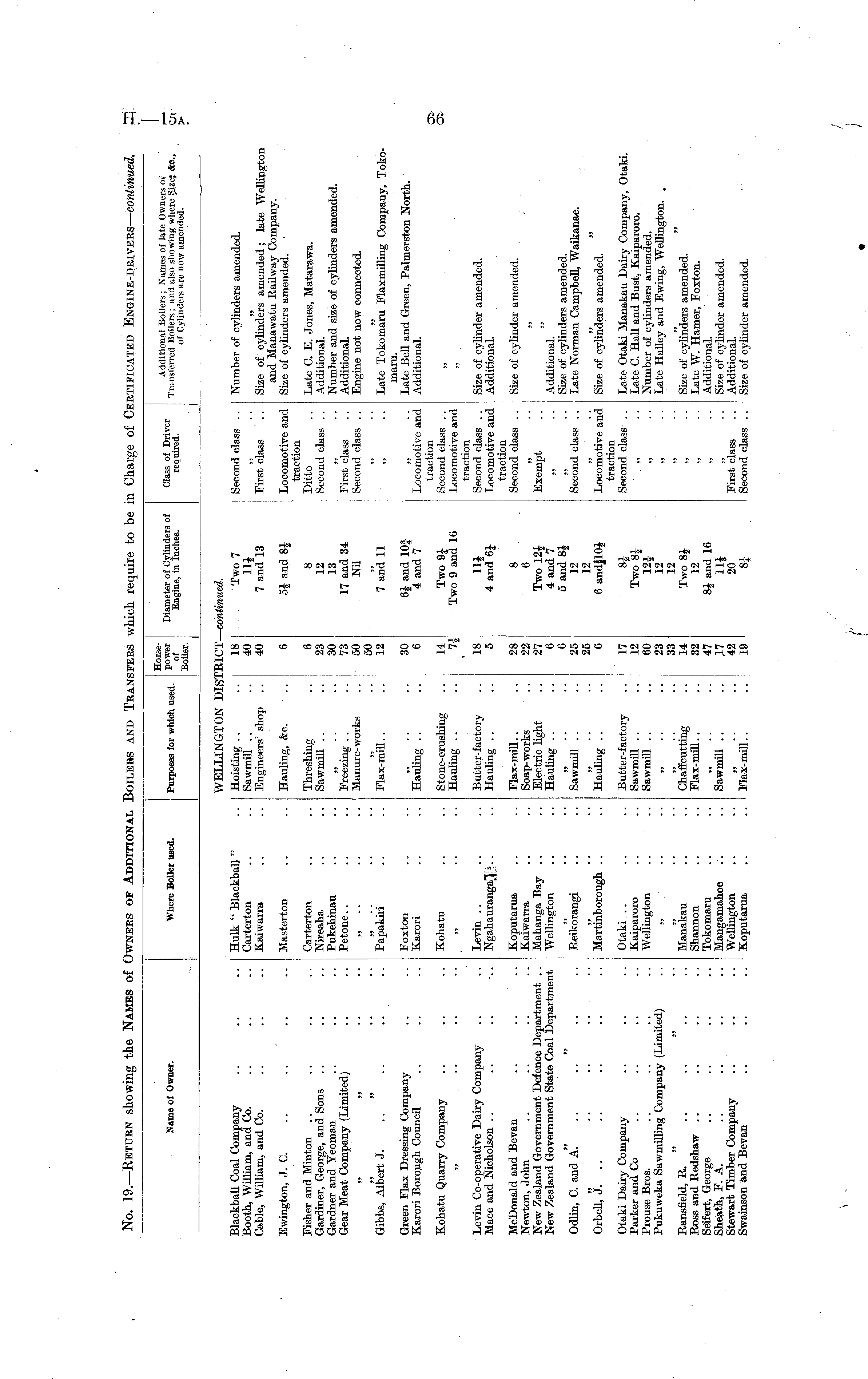 Name of Owner. Where Bolter used. Purposes for which used. Horsepower of Boiler. Diameter of Cylinders of Engine, in Inches. Class of Driver required. Additional Boilers; Names of late Owners of Transferred Boilers ; and also showing where Sjze; &c., of Cylinders are now amended. WELLINGTON DIS' RICTmtinued. Number of cylinders amended. BlackbaU Coal Company Booth, William, and Co. Cable, WiUiam, and Co. Hulk " BlackbaU " Carterton Kaiwarra Hoisting SawmiU Engineers' shop 18 40 40 Two 7 7 and 13 Second class .. First class ' .. Size of cylinders amended; late Wellington and Manawatu RaUway Company. Size of cylinders amended. Ewington, J. C. Masterton Hauling, &c. 6 54 and 84 Locomotive and traction Ditto Second class .. Fisher and Minton Gardiner, George, and Sons Gardner and Yeoman Gear Meat Company (Limited) Carterton Nireaha Pukehinau Petone Threshing SawmiU 6 23 30 73 50 50 12 8 12 13 17 and 34 NU Late C. E. Jones, Matarawa. Additional. Number and size of cylinders amended. Additional. Engine not now connected. Freezing Manure- works First class Second class .. Gibbs, Albert J. Papakiri Flax-mill 7 and 11 Late Tokomaru Flaxmilling Company, TokoGreen Flax Dressing Company Karori Borough CouncU Foxton Karori Hauling 30 6 64 and 10$ 4 and 7 Locomotive and traction Second class Locomotive and traction Second class .. Locomotive and traction Second class .. maru. Late BeU and Green, Palmerston North. Additional. Kohatu Quarry Company Kohatu Stone-crushing Hauling 14 Two 9$ Two 9 and 16 .. • • 1 Levin Co-operative Dairy Company Mace and Nicholson Levin .. NgahaurangaJ*.. Butter-factory Harding 18 5 4 and 6$ Size of cylinder amended. Additional. McDonald and Bevan Newton, John New Zealand Government Defence Department .. New Zealand Government State Coal Department Koputarua Kaiwarra Mahanga Bay .. Wellington Flax-miU.. Soap-works Electric light Hauling 28 22 27 6 6 25 25 6 8 6 Two 124 4 and 7 5 and 84 12 12 6 and]104 Exempt Size of cylinder amended. >. .. Odlin, C. and A. Reikorangi SawmiU Second class .. Additional. Size of cylinders amended. Late Norman CampbeU, Waikanae. Orbell, J. .. '.'. '.'. .. Martinborough .. Harding Locomotive and traction Second class .. Size of cylinders amended. Otaki Dairy Company Parker and Co Prouse Bros. Pukuweka SawmUling Company (Limited) Otaki .. Kaiparoro Wellington Butter-factory SawmiU SawmiU .. 17 12 60 23 33 14 32 47 17 42 19 84 Two 84 12 12 Two 84 12 84 and 16 20 8$ Late Otaki Manakau Dairy Company, Otaki. Late C. HaU and Bust, Kaiparoro. Number of cyUnders amended. Late HaUey and Ewing, WeUington. , ,, .. >. • • Manakau Shannon Tokomaru Mangamahoe Wellington Koputarua Chaffcutting Flax-miU.. Size of cylinders amended. Late W. Hamer, Foxton. Additional. Size of cylinder amended. Additional. Size of cylinder amended. Ransfield, R. Ross and Redshaw Seifert, George Sheath, F. A. Stewart Timber Company Swainson and Bevan SawmiU .. Flax-null First class Second class ..