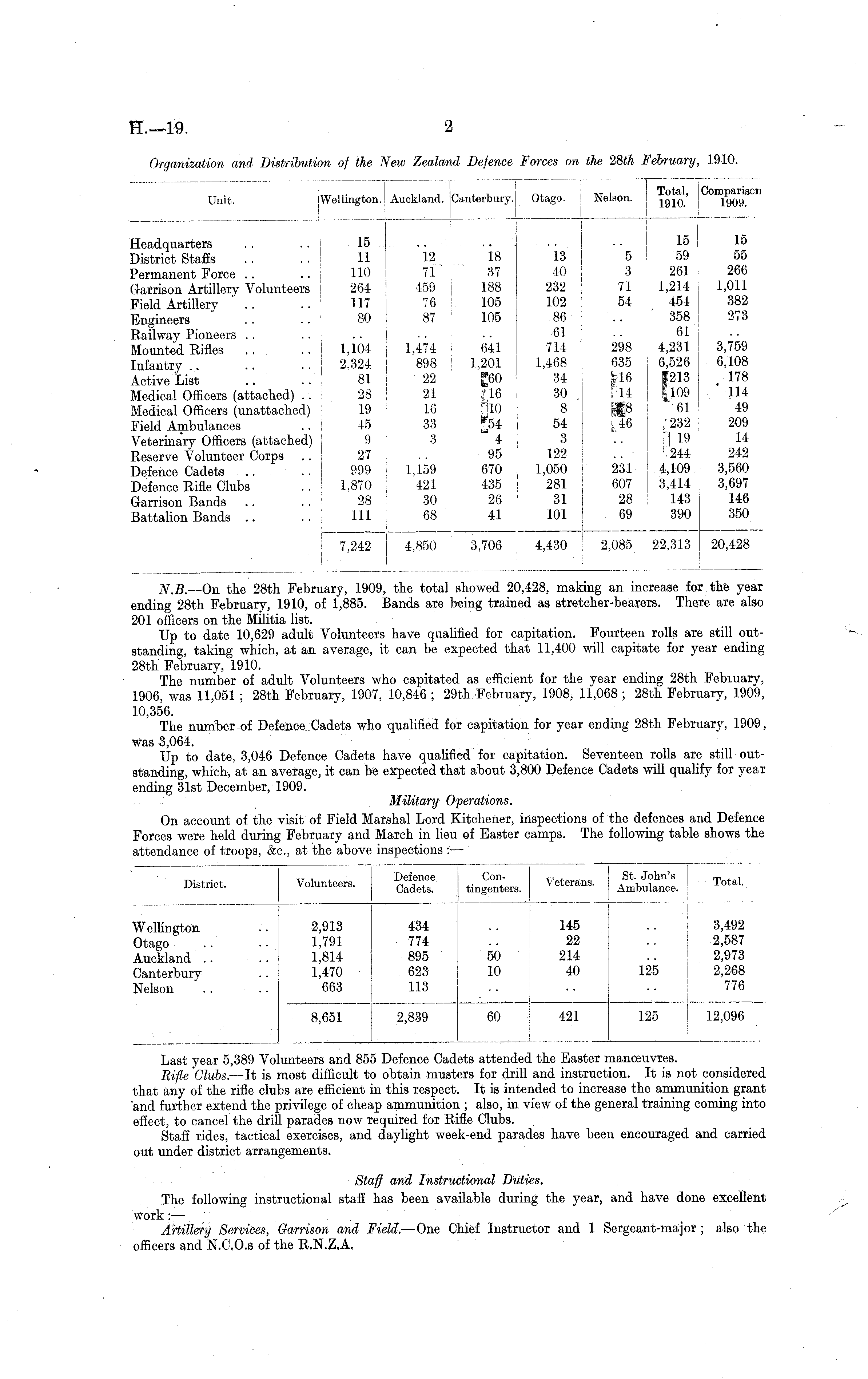 N.B.— On the 28th February, 1909, the total showed 20,428, making an increase for the year ending 28th February, 1910, of 1,885. Bands are being trained as stretcher-bearers. There are also 201 officers on the Militia list. Up to date 10,629 adult Volunteers have qualified for capitation. Fourteen rolls are still outstanding, taking which, at an average, it can be expected that 11,400 will capitate for year ending 28th February, 1910. The number of adult Volunteers who capitated as efficient for the year ending 28th Febiuary, 1906, was 11,051 ; 28th February, 1907, 10,846 ; 29th Febiuary, 1908, 11,068 ; 28th February, 1909, 10,356. The number of Defence Cadets who qualified for capitation for year ending 28th February, 1909, was 3,064. Up to date, 3,046 Defence Cadets have qualified for capitation. Seventeen rolls are still outstanding, which, at an average, it can be expected that about 3,800 Defence Cadets will qualify for year ending 31st December, 1909. Military Operations. On account of the visit of Field Marshal Lord Kitchener, inspections of the defences and Defence Forces were held during February and March in lieu of Easter camps. The following table shows the attendance of troops, &c, at the above inspections :'—