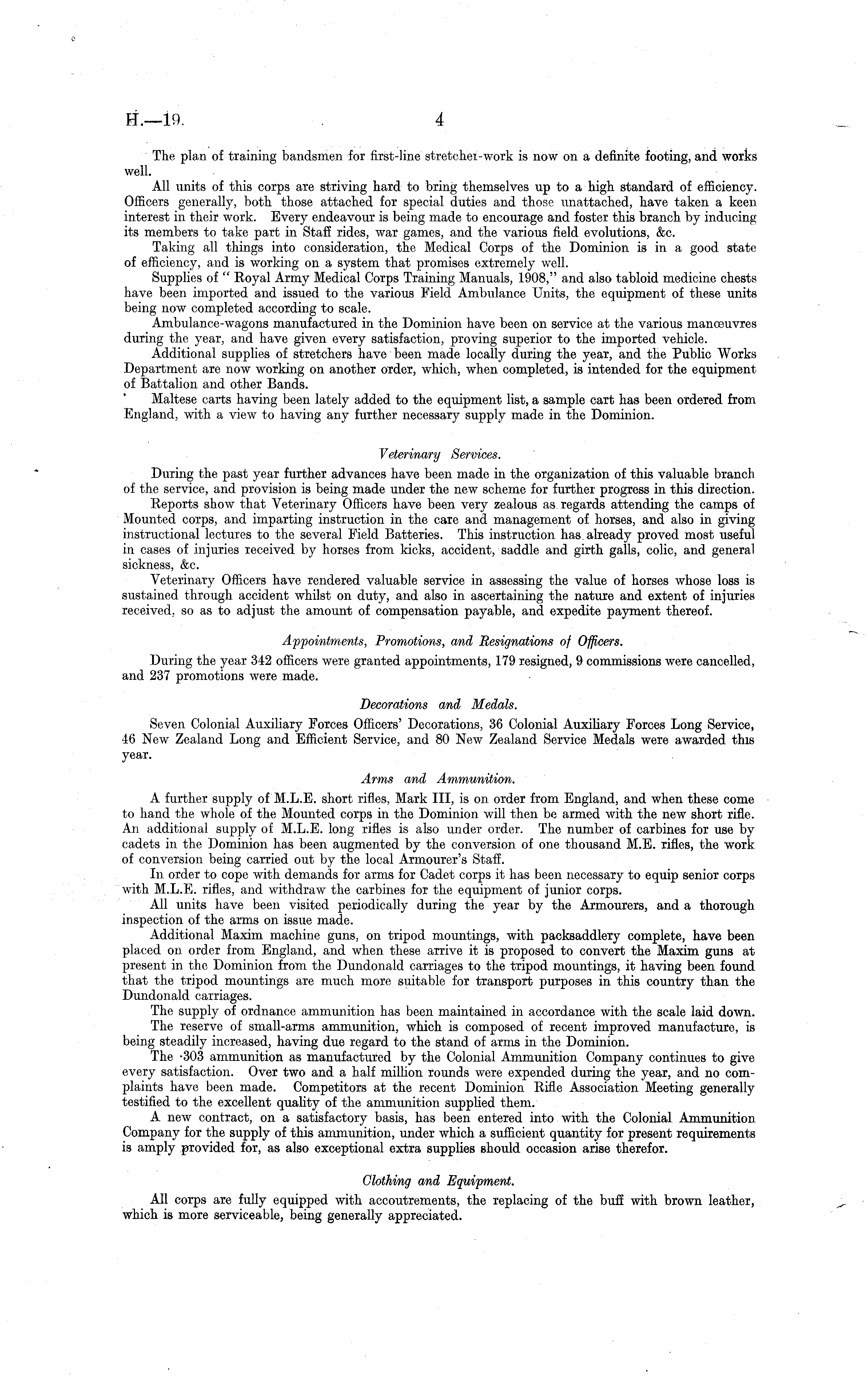 The plan of training bandsmen for first-line stretcher-work is now on a definite footing, and works well. All units of this corps are striving hard to bring themselves up to a high standard of efficiency. Officers generally, both those attached for special duties and those unattached, have taken a keen interest in their work. Every endeavour is being made to encourage and foster this branch by inducing its members to take part in Staff rides, war games, and the various field evolutions, &c. Taking all things into consideration, the Medical Corps of the Dominion is in a good state of efficiency, and is working on a system that promises extremely well. Supplies of " Royal Army Medical Corps Training Manuals, 1908," and also tabloid medicine chests have been imported and issued to the various Field Ambulance Units, the equipment of these units being now completed according to scale. Ambulance-wagons manufactured in the Dominion have been on service at the various manoeuvres during the year, and have given every satisfaction, proving superior to the imported vehicle. Additional supplies of stretchers have been made locally during the year, and the Public Works Department are now working on another order, which, when completed, is intended for the equipment of Battalion and other Bands. Maltese carts having been lately added to the equipment list, a sample cart has been ordered from England, with a view to having any further necessary supply made in the Dominion. Veterinary Services. During the past year further advances have been made in the organization of this valuable branch of the service, and provision is being made under the new scheme for further progress in this direction. Reports show that Veterinary Officers have been very zealous as regards attending the camps of Mounted corps, and imparting instruction in the care and management of horses, and also in giving instructional lectures to the several Field Batteries. This instruction has. already proved most useful in cases of injuries received by horses from kicks, accident, saddle and girth galls, colic, and general sickness, &c. Veterinary Officers have rendered valuable service in assessing the value of horses whose loss is sustained through accident whilst on duty, and also in ascertaining the nature and extent of injuries received, so as to adjust the amount of compensation payable, and expedite payment thereof. Appointments, Promotions, and Resignations of Officers. During the year 342 officers were granted appointments, 179 resigned, 9 commissions were cancelled, and 237 promotions were made. Decorations and Medals. Seven Colonial Auxiliary Forces Officers' Decorations, 36 Colonial Auxiliary Forces Long Service, 46 New Zealand Long and Efficient Service, and 80 New Zealand Service Medals were awarded this year. Arms and Ammunition. A further supply of M.L.E. short rifles, Mark 111, is on order from England, and when these come to hand the whole of the Mounted corps in the Dominion will then be armed with the new short rifle. An additional supply of M.L.E. long rifles is also under order. The number of carbines for use by cadets in the Dominion has been augmented by the conversion of one thousand M.E. rifles, the work of conversion being carried out by the local Armourer's Staff. In order to cope with demands for arms for Cadet corps it has been necessary to equip senior corps with M.L.E. rifles, and withdraw the carbines for the equipment of junior corps. All units have been visited periodically during the year by the Armourers, and a thorough inspection of the arms on issue made. Additional Maxim machine guns, on tripod mountings, with packsaddlery complete, have been placed on order from England, and when these arrive it is proposed to convert the Maxim guns at present in the Dominion from the Dundonald carriages to the tripod mountings, it having been found that the tripod mountings are much more suitable for transport purposes in this country than the Dundonald carriages. The supply of ordnance ammunition has been maintained in accordance with the scale laid down. The reserve of small-arms ammunition, which is composed of recent improved manufacture, is being steadily increased, having due regard to the stand of arms in the Dominion. The -303 ammunition as manufactured by the Colonial Ammunition Company continues to give every satisfaction. Over two and a half million rounds were expended during the year, and no complaints have been made. Competitors at the recent Dominion Rifle Association Meeting generally testified to the excellent quality of the ammunition supplied them. A new contract, on a satisfactory basis, has been entered into with the Colonial Ammunition Company for the supply of this ammunition, under which a sufficient quantity for present requirements is amply provided for, as also exceptional extra supplies should occasion arise therefor. Clothing and Equipment. All corps are fully equipped with accoutrements, the replacing of the buff with brown leather, which is more serviceable, being generally appreciated.