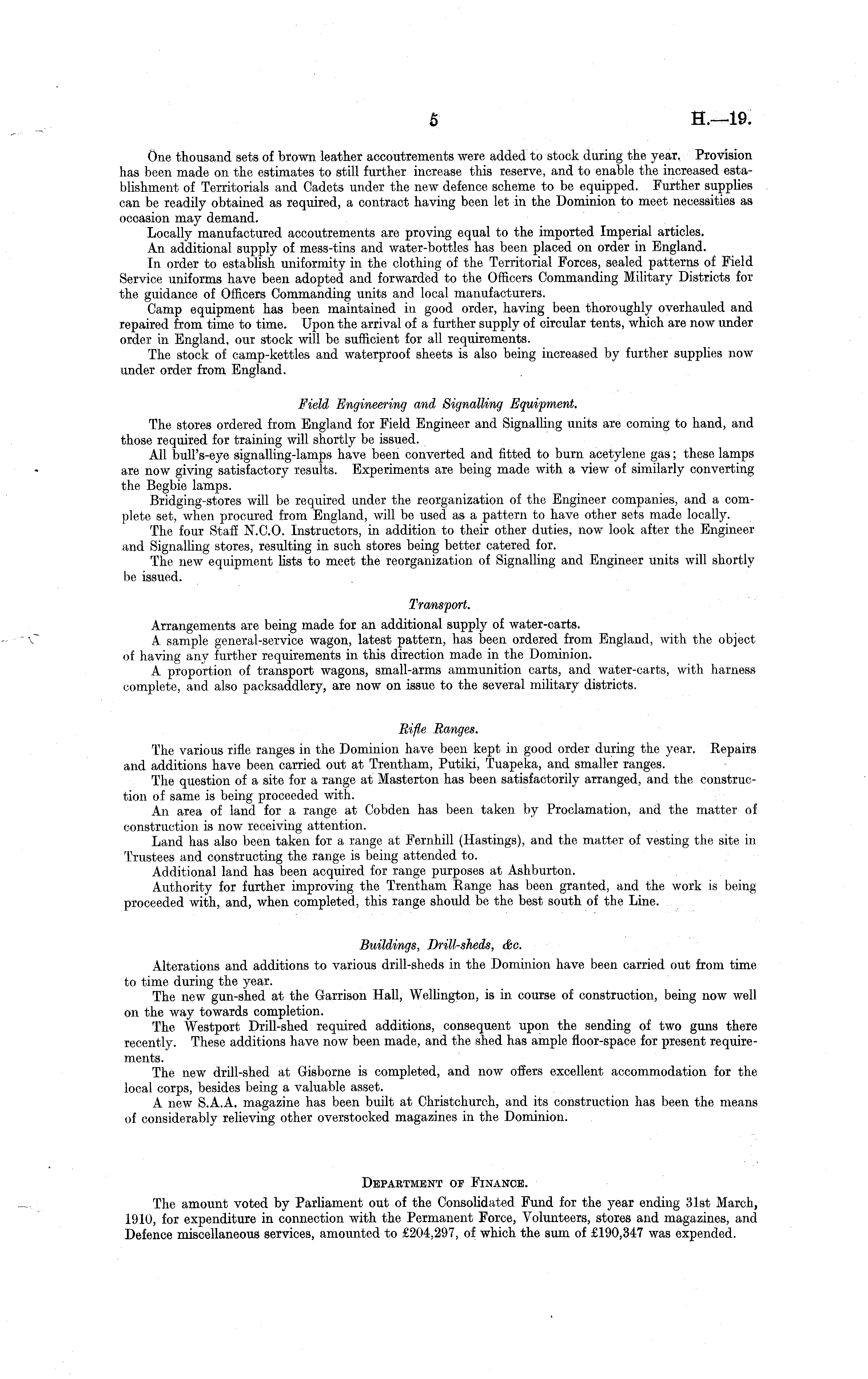 One thousand sets of brown leather accoutrements were added to stock during the year. Provision has been made on the estimates to still further increase this reserve, and to enable the increased establishment of Territorials and Cadets under the new defence scheme to be equipped. Further supplies can be readily obtained as required, a contract having been let in the Dominion to meet necessities as occasion may demand. Locally manufactured accoutrements are proving equal to the imported Imperial articles. An additional supply of mess-tins and water-bottles has been placed on order in England. In order to establish uniformity in the clothing of the Territorial Forces, sealed patterns of Field Service uniforms have been adopted and forwarded to the Officers Commanding Military Districts for the guidance of Officers Commanding units and local manufacturers. Camp equipment has been maintained in good order, having been thoroughly overhauled and repaired from time to time. Upon the arrival of a further supply of circular tents, which, are now under order in England, our stock will be sufficient for all requirements. The stock of camp-kettles and waterproof sheets is also being increased by further supplies now under order from England. Field Engineering and Signalling Equipment. The stores ordered from England for Field Engineer and Signalling units are coming to hand, and those required for training will shortly be issued. All bull's-eye signalling-lamps have been converted and fitted to burn acetylene gas; these lamps are now giving satisfactory results. Experiments are being made with a view of similarly converting the Begbie lamps. Bridging-stores will be required under the reorganization of the Engineer companies, and a complete set, when procured from England, will be used as a pattern to have other sets made locally. The four Staff N.C.O. Instructors, in addition to their other duties, now look after the Engineer and Signalling stores, resulting in such stores being better catered for. The new equipment lists to meet the reorganization of Signalling and Engineer units will shortly be issued. Transport. Arrangements are being made for an additional supply of water-carts. A sample general-service wagon, latest pattern, has been ordered from England, with the object of having any further requirements in this direction made in the Dominion. A proportion of transport wagons, small-arms ammunition carts, and water-carts, with harness complete, and also packsaddlery, are now on issue to the several military districts. Rifle Ranges. The various rifle ranges in the Dominion have been kept in good order during the year. Repairs and additions have been carried out at Trentham, Putiki, Tuapeka, and smaller ranges. The question of a site for a range at Masterton has been satisfactorily arranged, and the construction of same is being proceeded with. An area of land for a range at Cobden has been taken by Proclamation, and the matter of construction is now receiving attention. Land has also been taken for a range at Fernhill (Hastings), and the matter of vesting the site in Trustees and constructing the range is being attended to. Additional land has been acquired for range purposes at Ashburton. Authority for further improving the Trentham Range has been granted, and the work is being proceeded with, and, when completed, this range should be the best south of the Line. Buildings, Drill-sheds, &c. Alterations and additions to various drill-sheds in the Dominion have been carried out from time to time during the year. The new gun-shed at the Garrison Hall, Wellington, is in course of construction, being now well on the way towards completion. The Westport Drill-shed required additions, consequent upon the sending of two guns there recently. These additions have now been made, and the shed has ample floor-space for present requirements. The new drill-shed at Gisborne is completed, and now offers excellent accommodation for the local corps, besides being a valuable asset. A new S.A.A. magazine has been built at Christchurch, and its construction has been the means of considerably relieving other overstocked magazines in the Dominion. Dbpabtmbnt of Finance. The amount voted by Parliament out of the Consolidated Fund for the year ending 31st March, 1910, for expenditure in connection with the Permanent Force, Volunteers, stores and magazines, and Defence miscellaneous services, amounted to £204,297, of which the sum of £190,347 was expended.