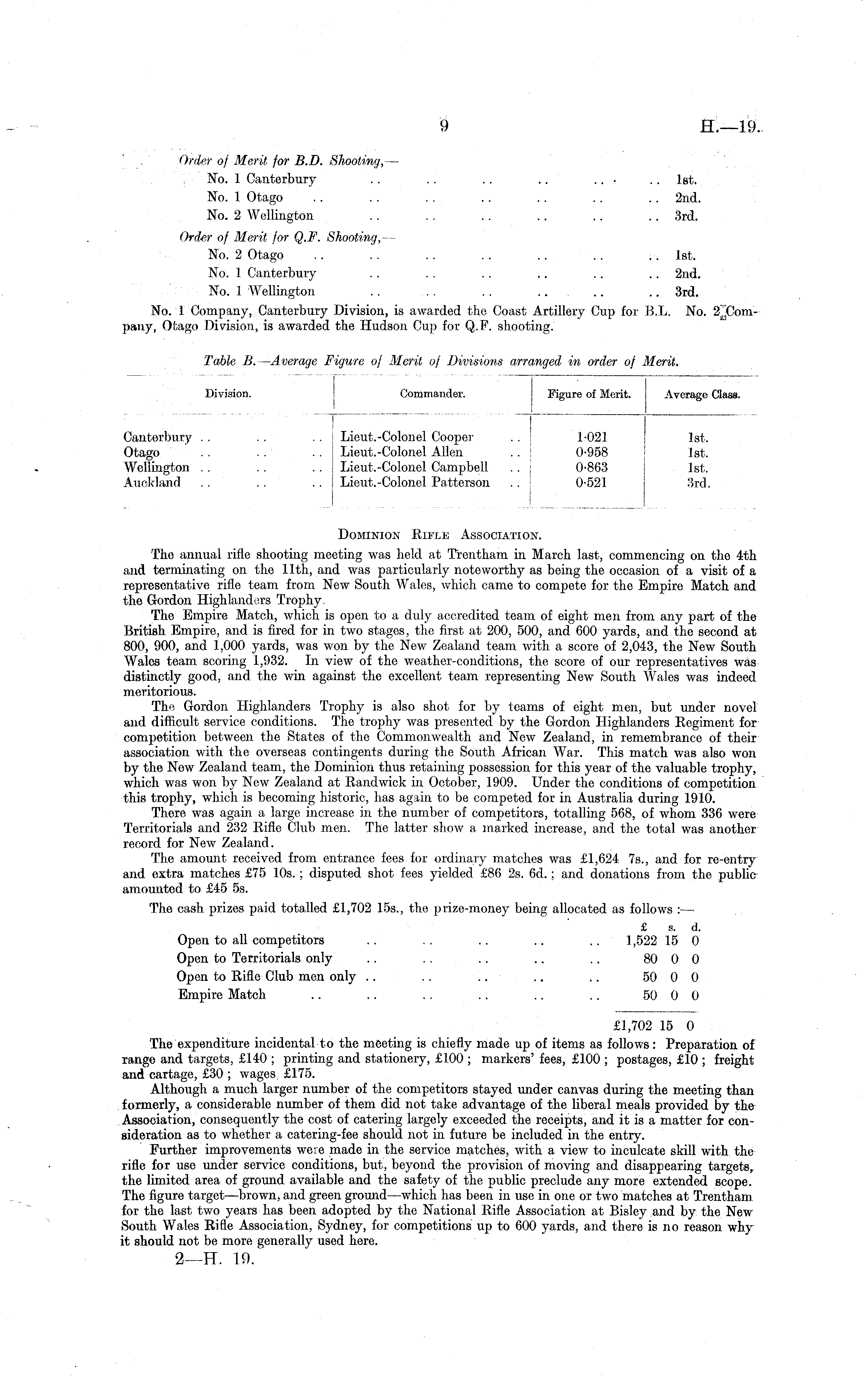 Order of Merit for B.D. Shooting, — No. 1 Canterbury .. . . . . .. ... . . Ist. No. 1 Otago .. . . .. .. .. .. .. 2nd. No. 2 Wellington .. .. .. .. .. .. 3rd. Order of Merit for Q.F. Shooting, — No. 2 Otago .. .. .. .. .. ■■"..•; .. Ist. No. 1 Canterbury . . . . .. .. . . .. 2nd. No. 1 Wellington . . . . . . .. .. ~ 3rd. No. "1 Company, Canterbury Division, is awarded the Coast Artillery Cup for B.L. No. pany, Ofcago Division, is awarded the Hudson Cup for Q.F. shooting.