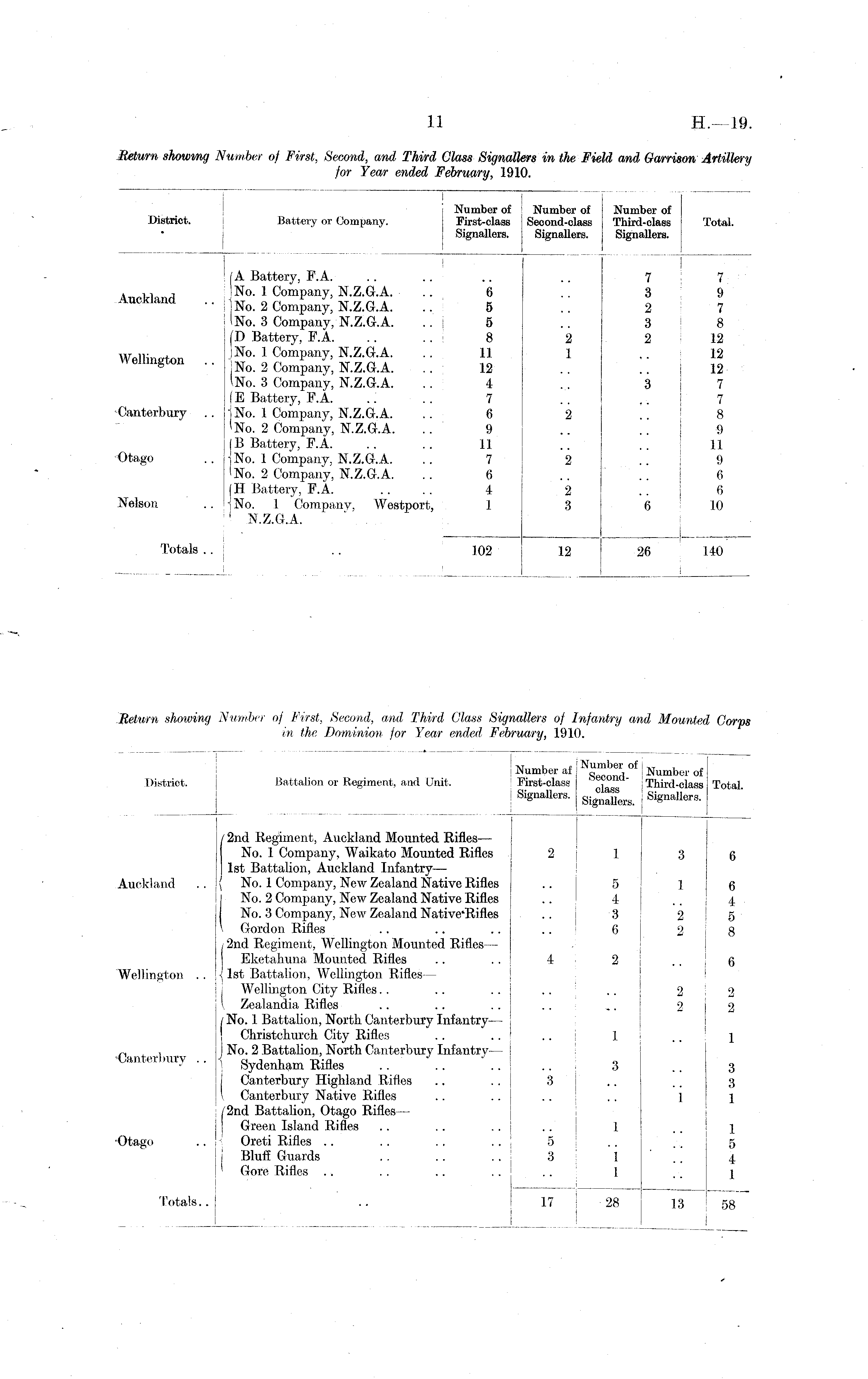 District. j Battery or Company. I I I Number of i Number of First-class Seoond-class Signallers. Signallers. Number of Third-class Total. Signallers. I j Auckland Wellington Canterbury (A Battery, F.A. I No. 1 Company, N.Z.G.A. .. No. 2 Company, N.Z.G.A. I No. 3 Company, N.Z.G.A. .. i (D Battery, F.A. .. .'.] i No. 1 Company, N.Z.G.A. j No. 2 Company, N.Z.G.A. iNo. 3 Company, N.Z.G.A. IE Battery, F.A. iNo. 1 Company, N.Z.G.A. ( No. 2 Company, N.Z.G.A. I B Battery, F.A. No. 1 Company, N.Z.G.A. I No. 2 Company, N.Z.G.A. IH Battery, F.A. JNo. 1 Company, Westport, i N.Z.G.A. 6 5 5 8 11 12 4 7 6 9 11 7 6 4 1 2 1 2 7 7 3 9 2 7 3 8 2 12 12 : i2 3 7 7 8 9 11 9 6 6 6 10 Otago 2 Nelson 2 3 Totals . . 102 26 140 102 12 26