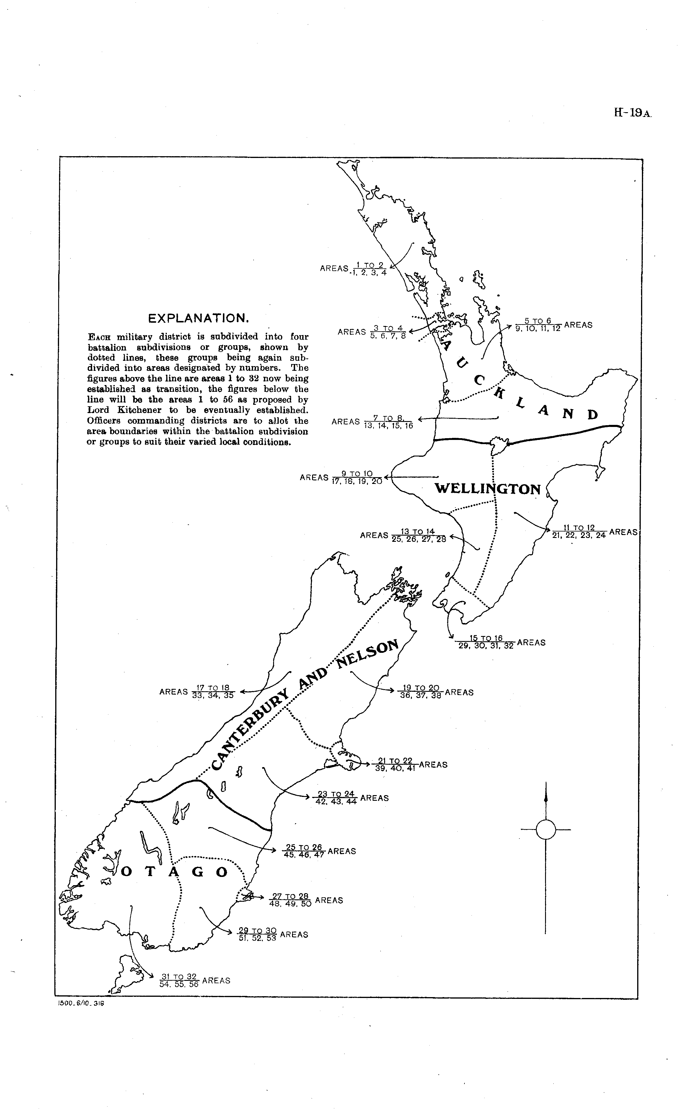 EXPLANATION. Each military district is subdivided into four battalion subdivisions or groups, shown by dotted lines, these groups being again subdivided into areas designated by numbers. The figures above the line are areas 1 to 32 now being established as transition, the figures below the line will be the areas 1 to 56 as proposed by Lord Kitchener to be eventually established. Officers commanding districts are to allot the area boundaries within the battalion subdivision or groups to suit their varied local conditions.