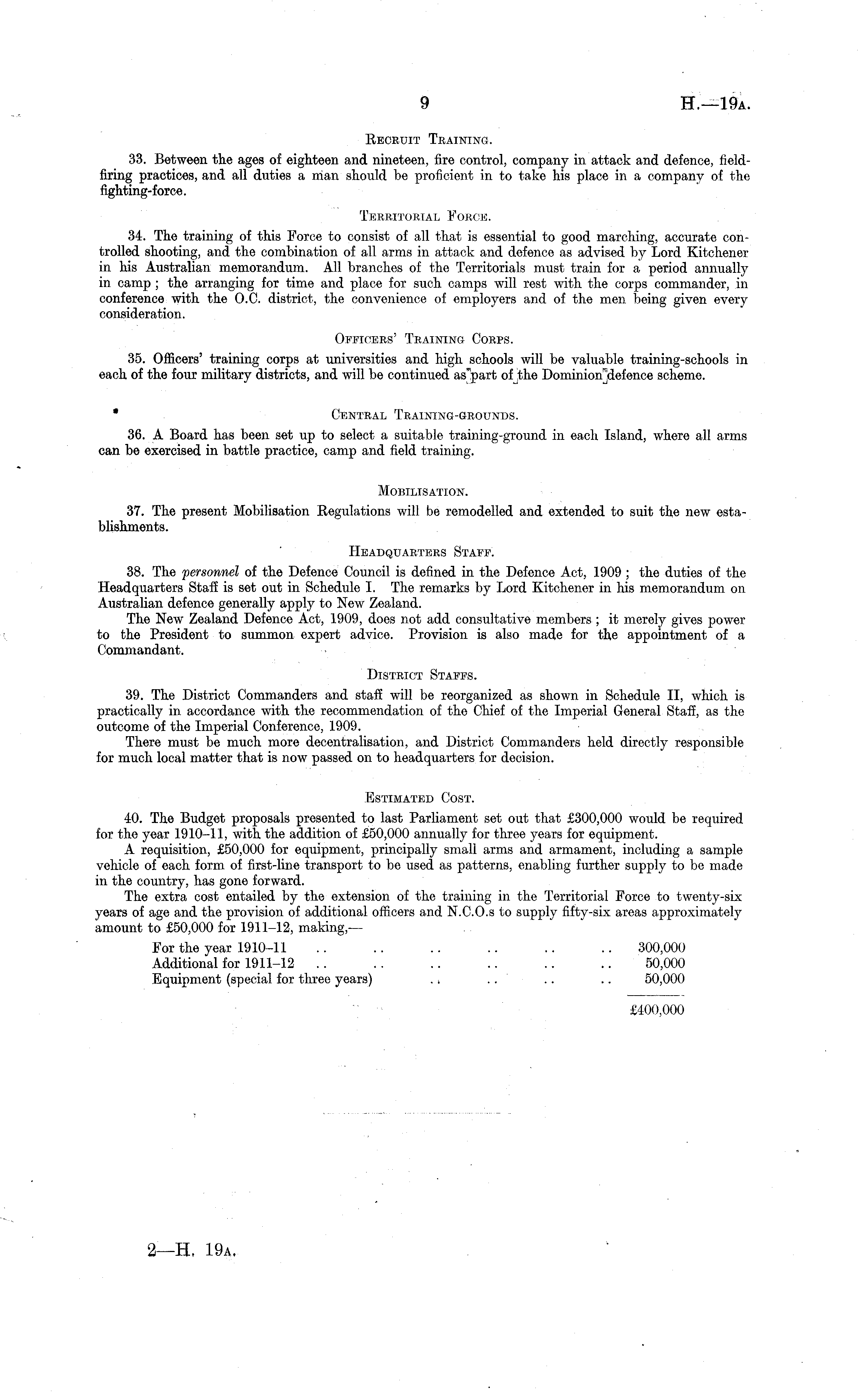 Recruit Training. 33. Between the ages of eighteen and nineteen, fire control, company in attack and defence, fieldfiring practices, and all duties a man should be proficient in to take his place in a company of the fighting-force. Territorial Force. 34. The training of this Force to consist of all that is essential to good marching, accurate controlled shooting, and the combination of all arms in attack and defence as advised by Lord Kitchener in his Australian memorandum. All branches of the Territorials must train for a period annually in camp ; the arranging for time and place for such camps will rest with the corps commander, in conference with the O.C. district, the convenience of employers and of the men being given every consideration. Officers' Training Corps. 35. Officers' training corps at universities and high schools will be valuable training-schools in each of the four military districts, and will be continued asjiart ofjfche Dominionjlefence scheme. Central Tbaining-grounds. 36. A Board has been set up to select a suitable training-ground in each Island, where all arms can be exercised in battle practice, camp and field training. Mobilisation. 37. The present Mobilisation Eegulations will be remodelled and extended to suit the new establishments. Headquarters Staff. 38. The personnel of the Defence Council is defined in the Defence Act, 1909 ; the duties of the Headquarters Staff is set out in Schedule I. The remarks by Lord Kitchener in his memorandum on Australian defence generally apply to New Zealand. The New Zealand Defence Act, 1909, does not add consultative members ; it merely gives power to the President to summon expert advice. Provision is also made for the appointment of a Commandant. District Staffs. 39. The District Commanders and stafi will be reorganized as shown in Schedule 11, which is practically in accordance with the recommendation of the Chief of the Imperial General Staff, as the outcome of the Imperial Conference, 1909. There must be much more decentralisation, and District Commanders held directly responsible for much local matter that is now passed on to headquarters for decision. Estimated Cost. 40. The Budget proposals presented to last Parliament set out that £300,000 would be required for the year 1910-11, with, the addition of £50,000 annually for three years for equipment. A requisition, £50,000 for equipment, principally small arms and armament, including a sample vehicle of each form of first-line transport to be used as patterns, enabling further supply to be made in the country, has gone forward. The extra cost entailed by the extension of the training in the Territorial Force to twenty-six years of age and the provision of additional officers and N.C.O.s to supply fifty-six areas approximately amount to £50,000 for 1911-12, making,— For the year 1910-11 .. .. .. .. .. .. 300,000 Additional for 1911-12 .. .. .. .. .. .. 50,000 Equipment (special for three years) ~ .. .. .. 50,000 £400,000