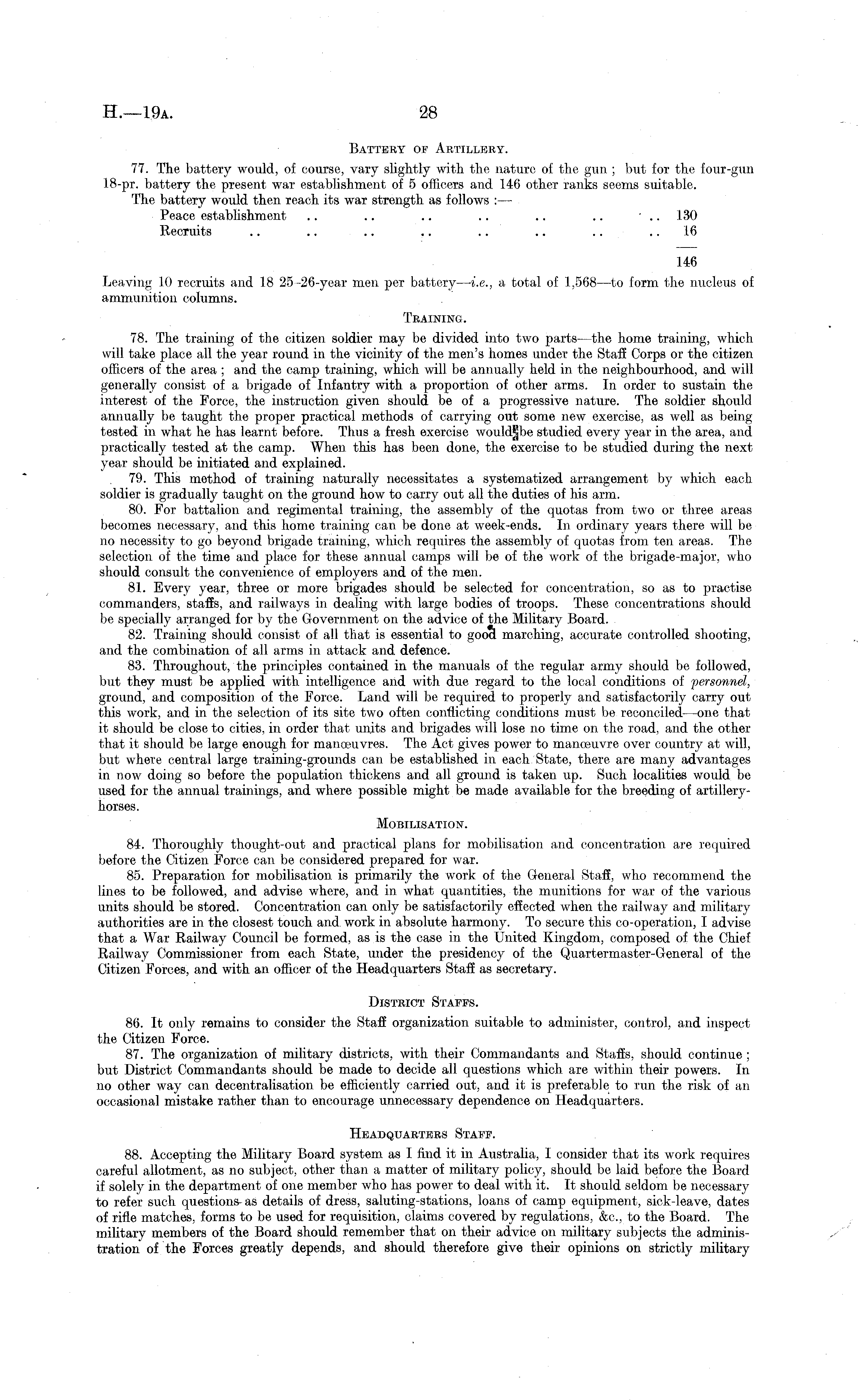 Battery of Artillery. 77. The battery would, of course, vary slightly with the nature of the gun ; but for the four-gun 18-pr. battery the present war establishment of 5 officers and 146 other ranks seems suitable. The battery would then reach its war strength as follows : — Peace establishment .. .. .. .. .. .. ' .. 130 Recruits .. .. .. .. .. .. .. 16 146 Leaving 10 Tecruits and 18 25 26-year men per battery — i.e., a total of 1,568 —to form the nucleus of ammunition columns. Training. 78. The training of the citizen soldier may be divided into two parts —the home training, which will take place all the year round in the vicinity of the men's homes under the Staff Corps or the citizen officers of the area ; and the camp training, which will be annually held in the neighbourhood, and will generally consist of a brigade of Infantry with a proportion of other arms. In order to sustain the interest of the Force, the instruction given should be of a progressive nature. The soldier should annually be taught the proper practical methods of carrying out some new exercise, as well as beingtested in what he has learnt before. Thus a fresh exercise would|be studied every year in the area, and practically tested at the camp. When this has been done, the exercise to be studied during the next year should be initiated and explained. 79. This method of training naturally necessitates a systematized arrangement by which each soldier is gradually taught on the ground how to carry out all the duties of his arm. 80. For battalion and regimental training, the assembly of the quotas from two or three areas becomes necessary, and this home training can be done at week-ends. In ordinary years there will be no necessity to go beyond brigade training, which requires the assembly of quotas from ten areas. The selection of the time and place for these annual camps will be of the work of the brigade-major, who should consult the convenience of employers and of the men. 81. Every year, three or more brigades should be selected for concentration, so as to practise commanders, staffs, and railways in dealing with large bodies of troops. These concentrations should be specially arranged for by the Government on the advice of the Military Board. 82. Training should consist of all that is essential to good marching, accurate controlled shooting, and the combination of all arms in attack and defence. 83. Throughout, the principles contained in the manuals of the regular army should be followed, but they must be applied with intelligence and with due regard to the local conditions of personnel, ground, and composition of the Force. Land will be required to properly and satisfactorily carry out this work, and in the selection of its site two often conflicting conditions must be reconciled —one that it should be close to cities, in order that units and brigades will lose no time on the road, and the other that it should be large enough for manoeuvres. The Act gives power to manoeuvre over country at will, but where central large training-grounds can be established in each State, there are many advantages in now doing so before the population thickens and all ground is taken up. Such localities would be used for the annual trainings, and where possible might be made available for the breeding of artilleryhorses. Mobilisation. 84. Thoroughly thought-out and practical plans for mobilisation and concentration are required before the Citizen Force can be considered prepared for war. 85. Preparation for mobilisation is primarily the work of the General Staff, who recommend the lines to be followed, and advise where, and in what quantities, the munitions for war of the various units should be stored. Concentration can only be satisfactorily effected when the railway and military authorities are in the closest touch and work in absolute harmony. To secure this co-operation, I advise that a War Railway Council be formed, as is the case in the United Kingdom, composed of the Chief Railway Commissioner from each State, under the presidency of the Quartermaster-General of the Citizen Forces, and with an officer of the Headquarters Staff as secretary. District Staffs. 86. It only remains to consider the Staff organization suitable to administer, control, and inspect the Citizen Force. 87. The organization of military districts, with their Commandants and Staffs, should continue ; but District Commandants should be made to decide all questions which are within their powers. In no other way can decentralisation be efficiently carried out, and it is preferable to run the risk of an occasional mistake rather than to encourage unnecessary dependence on Headquarters. Headquarters Staff. 88. Accepting the Military Board system as I find it in Australia, I consider that its work requires careful allotment, as no subject, other than a matter of military policy, should be laid before the Board if solely in the department of one member who has power to deal with it. It should seldom be necessary to refer such questions-as details of dress, saluting-stations, loans of camp equipment, sick-leave, dates of rifle matches, forms to be used for requisition, claims covered by regulations, &c, to the Board. The military members of the Board should remember that on their advice on military subjects the administration of the Forces greatly depends, and should therefore give their opinions on strictly military