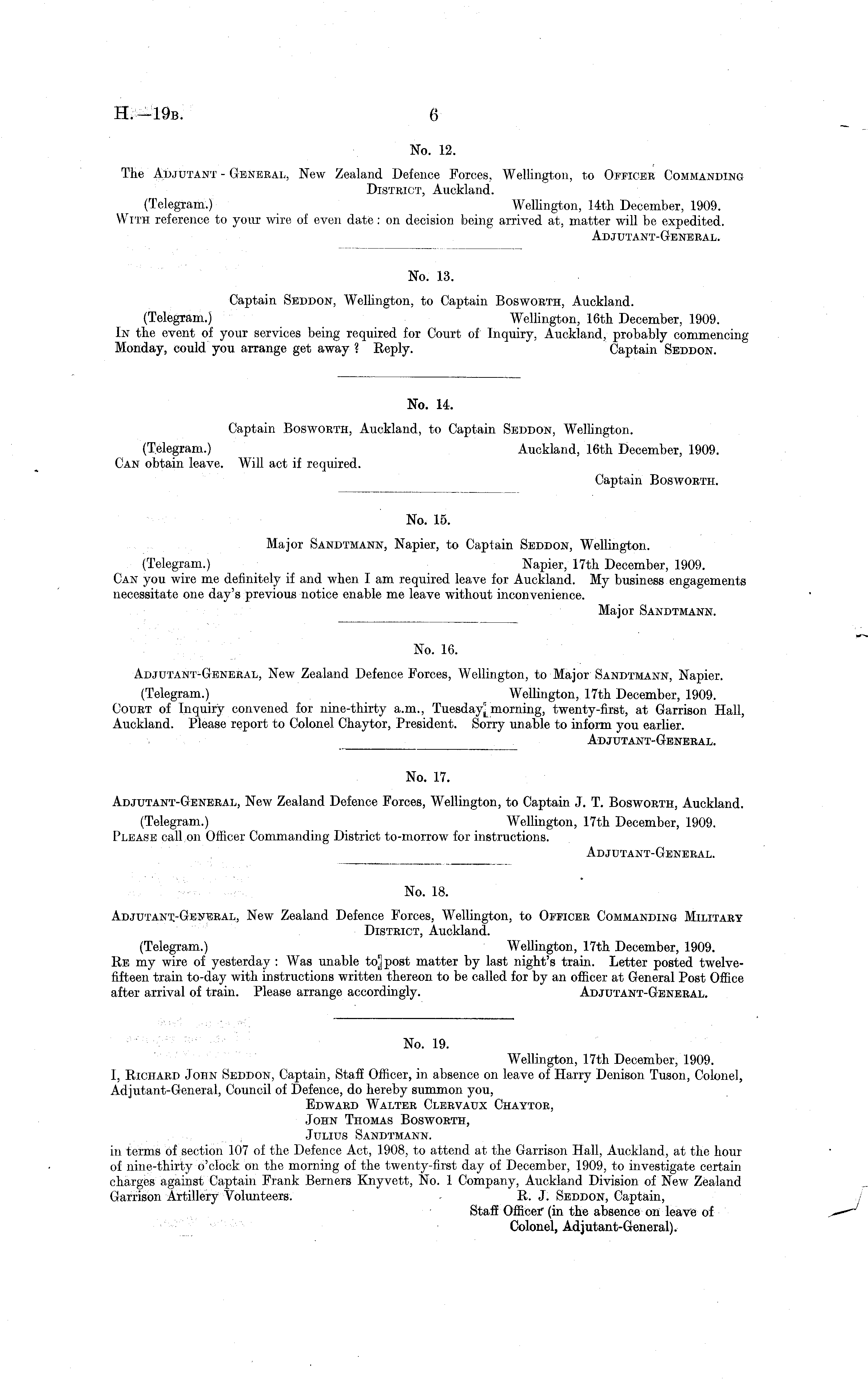 No. 19. Wellington, 17th December, 1909. 1, Richard John Seddon, Captain, Staff Officer, in absence on leave of Harry Denison Tuson, Colonel, Adjutant-General, Council of Defence, do hereby summon you, Edward Walter Clervaux Chaytor, John Thomas Bosworth, Julius Sandtmann. in terms of section 107 of the Defence Act, 1908, to attend at the Garrison Hall, Auckland, at the hour of nine-thirty o'clock on the morning of the twenty-first day of December, 1909, to investigate certain charges against Captain Frank Berners Knyvett, No. 1 Company, Auckland Division of New Zealand Garrison Artillery Volunteers. R. J. Seddon, Captain, Staff Officer" (in the absence on leave of Colonel, Adjutant-General).
