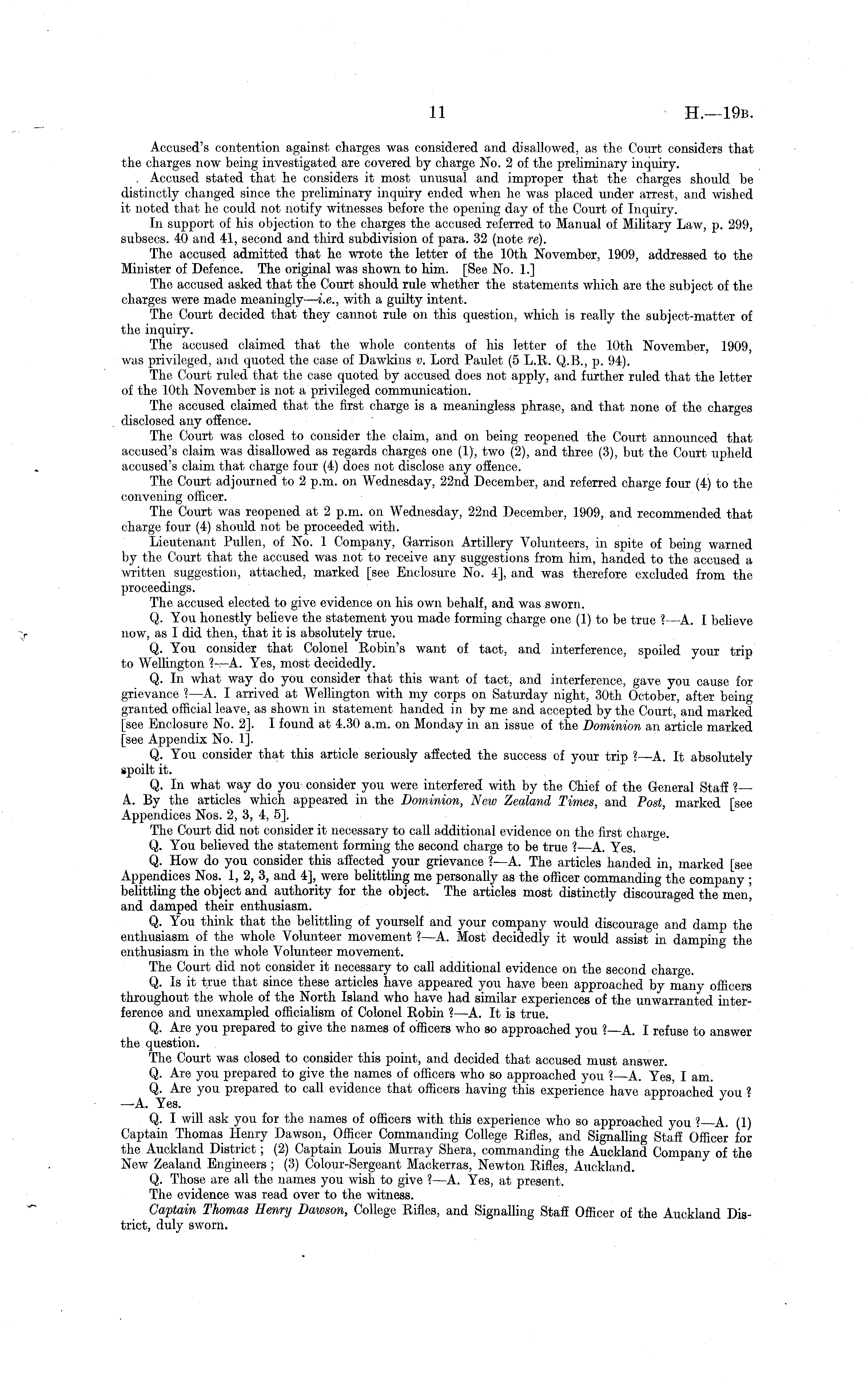 Accused's contention against charges was considered and disallowed, as the Court considers that the charges now being investigated are covered by charge No. 2 of the preliminary inquiry. . Accused stated that he considers it most unusual and improper that the charges should be distinctly changed since the preliminary inquiry ended when he was placed under arrest, and wished it noted that he could not notify witnesses before the opening day of the Court of Inquiry. In support of his objection to the charges the accused referred to Manual of Military Law, p. 299, subsecs. 40 and 41, second and third subdivision of para. 32 (note re). The accused admitted that he wrote the letter of the 10th November, 1909, addressed to the Minister of Defence. The original was shown to him. [See No. I.] The accused asked that the Court should rule whether the statements which are the subject of the charges were made meaningly — i.e., with a guilty intent. The Court decided that they cannot rule on this question, which is really the subject-matter of the inquiry. The accused claimed that the whole contents of his letter of the 10th November, 1909, was privileged, and quoted the case of Dawkins v. Lord Faulet (5 L.R. Q. 8., p. 94). The Court ruled that the case quoted by accused does not apply, and further ruled that the letter of the 10th November is not a privileged communication. The accused claimed that the first charge is a meaningless phrase, and that none of the charges disclosed any offence. The Court was closed to consider the claim, and on being reopened the Court announced that accused's claim was disallowed as regards charges one (1), two (2), and three (3), but the Court upheld accused's claim that charge four (4) does not disclose any offence. The Court adjourned to 2 p.m. on Wednesday, 22nd December, and referred charge four (4) to the convening officer. The Court was reopened at 2 p.m. on Wednesday, 22nd December, 1909, and recommended that charge four (4) should not be proceeded with. Lieutenant Pullen, of No. 1 Company, Garrison Artillery Volunteers, in spite of being warned by the Court that the accused was not to receive any suggestions from him, handed to the accused a written suggestion, attached, marked [see Enclosure No. 4], and was therefore excluded from the proceedings. The accused elected to give evidence on his own behalf, and was sworn. Q. You honestly believe the statement you made forming charge one (1) to be true ?—A. I believe now, as I did then, that it is absolutely true. Q. You consider that Colonel Robin's want of tact, and interference, spoiled your trip to Wellington ?—A. Yes, most decidedly. Q. In what way do you consider that this want of tact, and interference, gave you cause for grievance I —A. I arrived at Wellington with my corps on Saturday night, 30th October, after being granted official leave, as shown in statement handed in by me and accepted by the Court, and marked [see Enclosure No. 2]. I found at 4.30 a.m. on Monday in an issue of the Dominion an article marked [see Appendix No. I]. Q. You consider that this article seriously affected the success of your trip ? —A. It absolutely spoilt it. Q. In what way do you consider you were interfered with by the Chief of the General Staff 1 — A. By the articles which appeared in the Dominion, New Zealand Times, and Post, marked [see Appendices Nos. 2, 3, 4, s]. The Court did not consider it necessary to call additional evidence on the first charge. Q. You believed the statement forming the second charge to be true % —A. Yes. Q. How do you consider this affected your grievance ?—A. The articles handed in, marked [see Appendices Nos. 1, 2, 3, and 4], were belittling me personally as the officer commanding the company ; belittling the object and authority for the object. The articles most distinctly discouraged the men, and damped their enthusiasm. Q. You think that the belittling of yourself and your company would discourage and damp the enthusiasm of the whole Volunteer movement ? —A. Most decidedly it would assist in damping the enthusiasm in the whole Volunteer movement. The Court did not consider it necessary to call additional evidence on the second charge. Q. Is it true that since these articles have appeared you haye been approached by many officers throughout the whole of the North Island who have had similar experiences of the unwarranted interference and unexampled officialism of Colonel Robin ?—A. It is true. Q. Are you prepared to give the names of officers who so approached you ?—A. I refuse to answer the question. The Court was closed to consider this point, and decided that accused must answer. Q. Are you prepared to give the names of officers who so approached you ? —A. Yes, I am. Q. Are you prepared to call evidence that officers having this experience have approached you ? —A. Yes. Q. I will ask you for the names of officers with this experience who so approached you ? A. (1) Captain Thomas Henry Dawson, Officer Commanding College Rifles, and Signalling Staff Officer for the Auckland District; (2) Captain Louis Murray Shera, commanding the Auckland Company of the New Zealand Engineers ; (3) Colour-Sergeant Mackeras, Newton Rifles, Auckland. Q. Those are all the names you wish to give ?—A. Yes, at present. The evidence was read over to the witness. Captain Thomas Henry Dawson, College Rifles, and Signalling Staff Officer of the Auckland District, duly sworn.