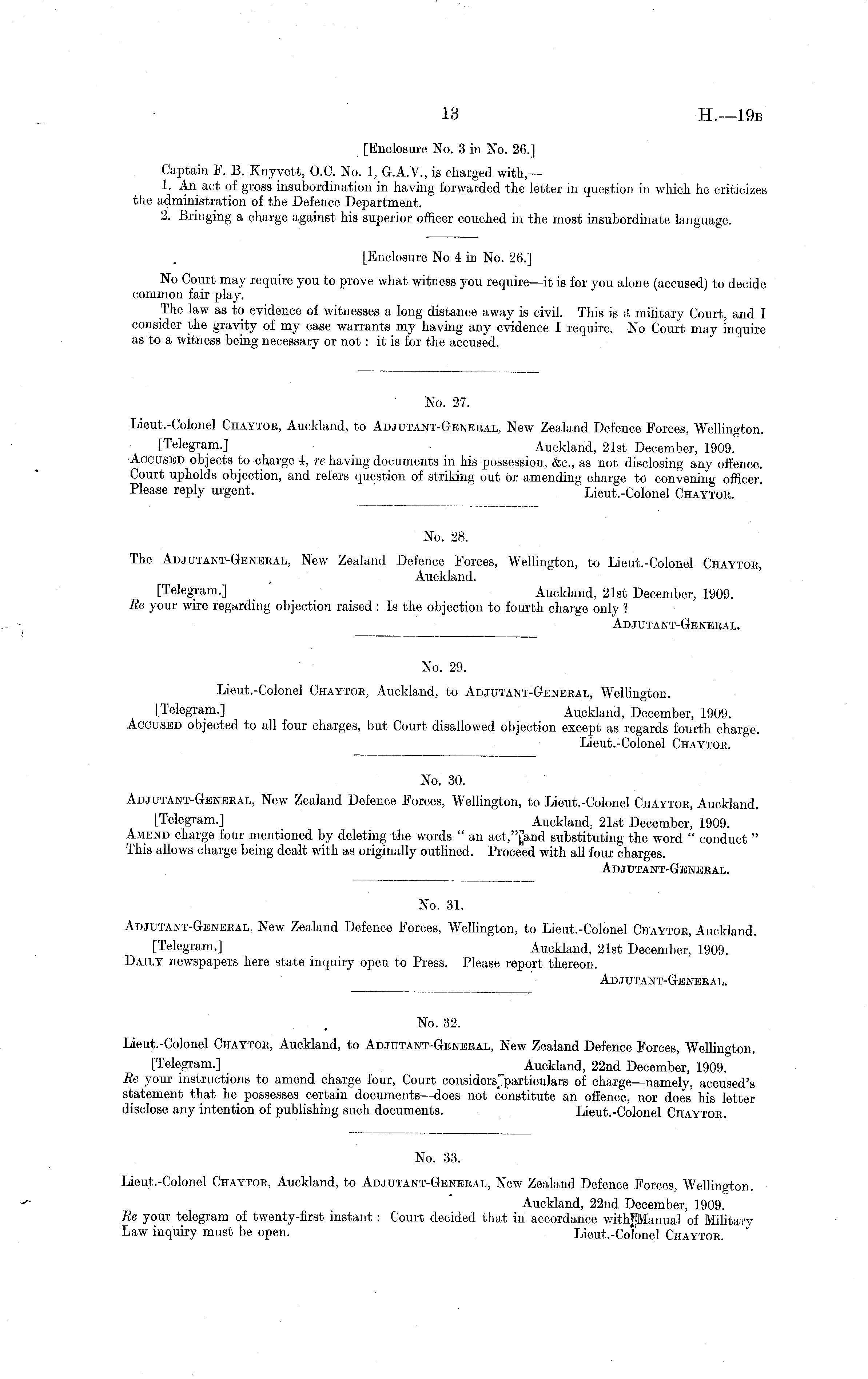 No. 30. Adjutant-Geneeal, New Zealand Defence Forces, Wellington, to Lieut.-Colonel Chaytob, Auckland. [Telegram.] Auckland, 21st December, 1909. Amend charge four mentioned by deleting the words " an act,"[and substituting the word " conduct " This allows charge being dealt with as originally outlined. Proceed with all four charges. Adjutant-General.
