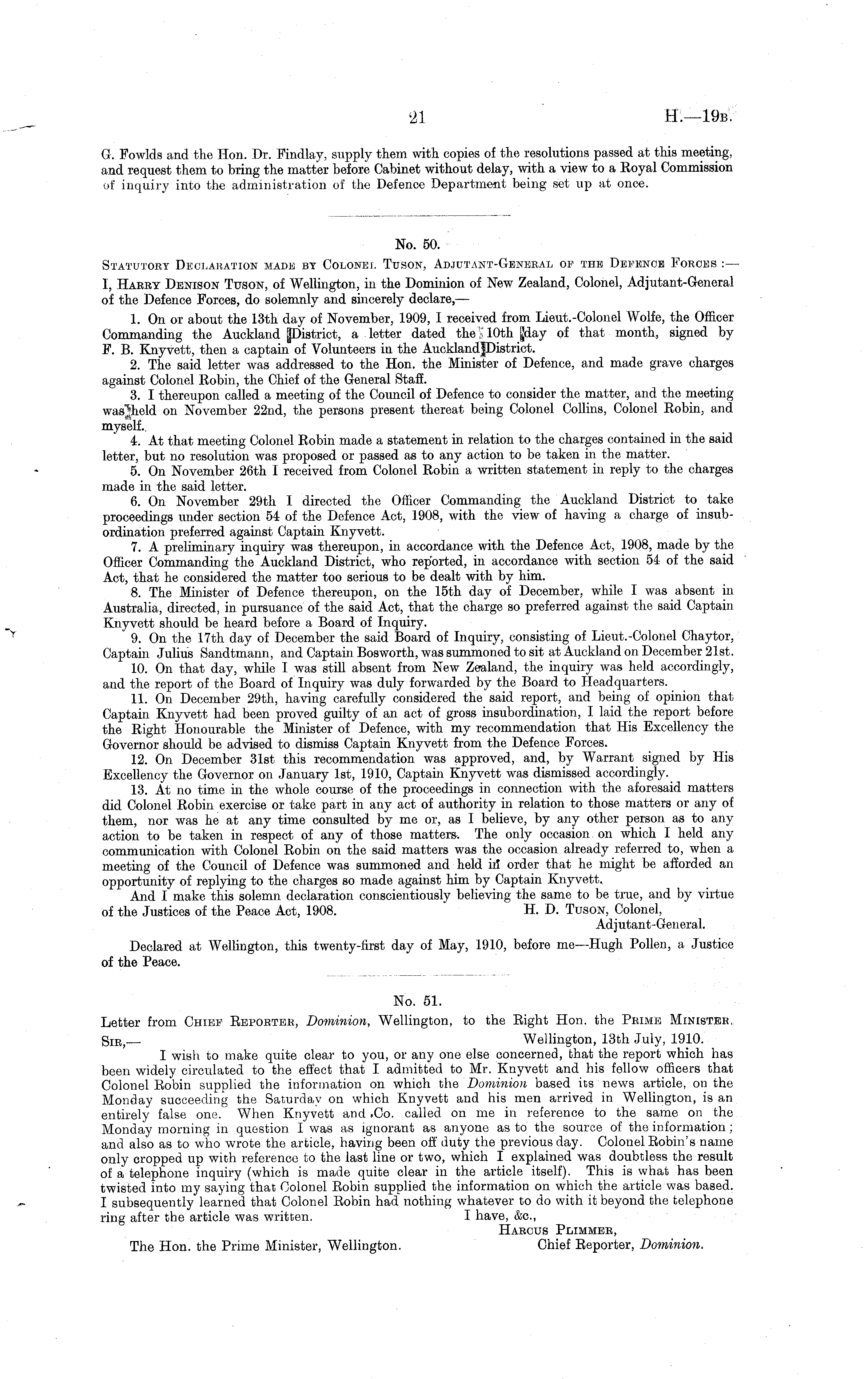 No. 50. Statutory Declaration made by Colonel Tuson, Adjutant-General of the Defence Forces : — I, Haeby Denison Tuson, of Wellington, in the Dominion of New Zealand, Colonel, Adjutant-General of the Defence Forces, do solemnly and sincerely declare, — 1. On or about the 13th day of November, 1909, I received from Lieut.-Colonel Wolfe, the Officer Commanding the Auckland [[District, a letter dated the IS 10th |day of that month, signed by F. B. Knyvett, then a captain of Volunteers in the AucklandJDistrict. 2. The said letter was addressed to the Hon. the Minister of Defence, and made grave charges against Colonel Robin, the Chief of the General Staff. 3. I thereupon called a meeting of the Council of Defence to consider the matter, and the meeting wasjjheld on November 22nd, the persons present thereat being Colonel Collins, Colonel Robin, and myself.. 4. At that meeting Colonel Robin made a statement in relation to the charges contained in the said letter, but no resolution was proposed or passed as to any action to be taken in the matter. 5. On November 26th I received from Colonel Robin a written statement in reply to the charges made in the said letter. 6. On November 29th I directed the Officer Commanding the Auckland District to take proceedings under section 54 of the Defence Act, 1908, with the view of having a charge of insubordination preferred against Captain Knyvett. 7. A preliminary inquiry was thereupon, in accordance with the Defence Act, 1908, made by the Officer Commanding the Auckland District, who reported, in accordance with section 54 of the said Act, that he considered the matter too serious to be dealt with by him. 8. The Minister of Defence thereupon, on the 15th day of December, while I was absent in Australia, directed, in pursuance of the said Act, that the charge so preferred against the said Captain Knyvett should be heard before a Board of Inquiry. 9. On the 17th day of December the said Board of Inquiry, consisting of Lieut.-Colonel Chaytor, Captain Julius Sandtmann, and Captain Bosworth, was summoned to sit at Auckland on December 21st. 10. On that day, while I was still absent from New Zealand, the inquiry was held accordingly, and the report of the Board of Inquiry was duly forwarded by the Board to Headquarters. 11. On December 29th, having carefully considered the said report, and being of opinion that Captain Knyvett had been proved guilty of an act of gross insubordination, I laid the report before the Right Honourable the Minister of Defence, with my recommendation that His Excellency the Governor should be advised to dismiss Captain Knyvett from the Defence Forces. 12. On December 31st this recommendation was approved, and, by Warrant signed by His Excellency the Governor on January Ist, 1910, Captain Knyvett was dismissed accordingly. 13. At no time in the whole course of the proceedings in connection with the aforesaid matters did Colonel Robin exercise or take part in any act of authority in relation to those matters or any of them, nor was he at any time consulted by me or, as I believe, by any other person as to any action to be taken in respect of any of those matters. The only occasion on which I held any communication with Colonel Robin on the said matters was the occasion already referred to, when a meeting of the Council of Defence was summoned and held irf order that he might be afforded an opportunity of replying to the charges so made against him by Captain Knyvett. And I make this solemn declaration conscientiously believing the same to be true, and by virtue of the Justices of the Peace Act, 1908. H. D. Tuson, Colonel, Adjutant-General. Declared at Wellington, this twenty-first day of May, 1910, before me—Hugh Pollen, a Justice of the Peace.
