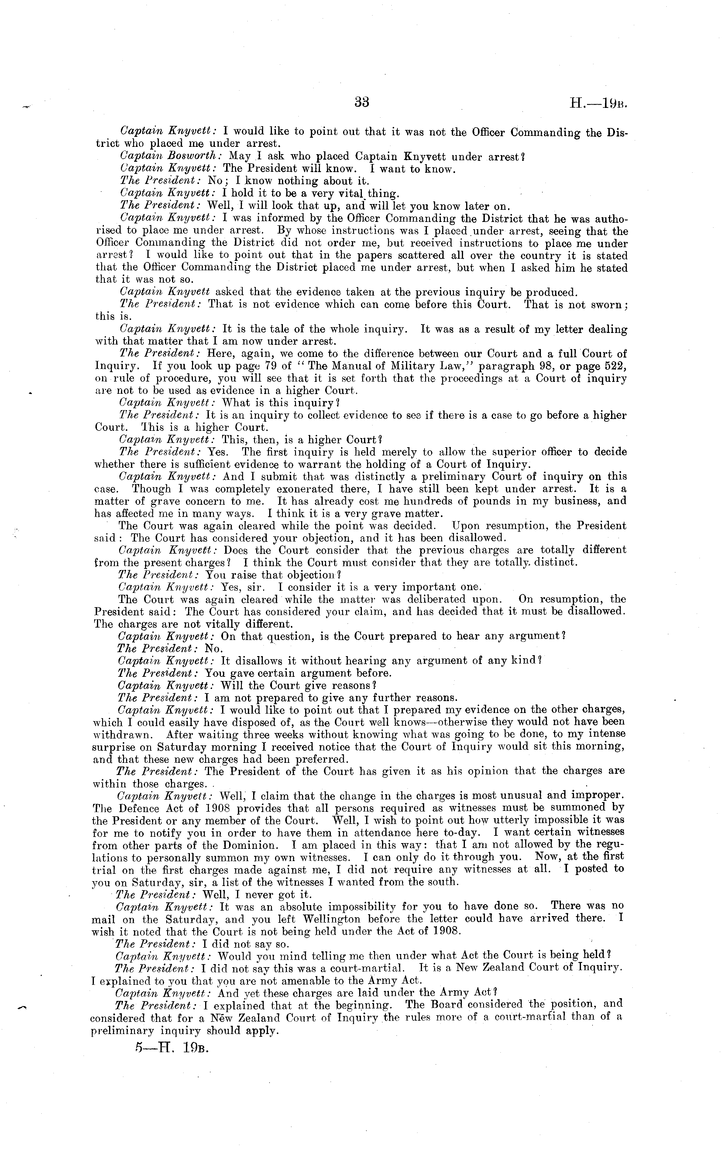 Captain Enyvett: I would like to point out that it was not the Officer Commanding the District who placed me under arrest. Captain Bosworth: May I ask who placed Captain Knyvett under arrest? Captain Knyvett: The President will know. I want to know. The President: No; I know nothing about it. Captain Knyvett: I hold it to be a very vital thing. The President: Well, I will look that up, and" will let you know later on. Captain Knyvett: I was informed by the Officer Commanding the District that he was authorised to place me under arrest. By whose instructions was I placed under arrest, seeing that the Officer Commanding the District did not order me, but received instructions to place me under arrest? I would like to point out that in the papers scattered all over the country it is stated that the Officer Commanding the District placed me under arrest, but when I asked him he stated that it was not so. Captain Knyvett asked that the evidence taken at the previous inquiry be produced. The President: That is not evidence which can come before this Court. That is not sworn; this is. Captain Knyvett: It is the tale of the whole inquiry. It was as a result of my letter dealing with that matter that I am now under arrest. The President: Here, again, we come to the difference between our Court and a full Court of Inquiry. If you look up page 79 of " The Manual of Military Law," paragraph 98, or page 522, on rule of procedure, you will see that it is set. forth that the proceedings at a Court of inquiry are not to be used as evidence in a higher Court. Captain Knyvett: What is this inquiry 1 The President: It is an inquiry to collect evidence to ses if there is a case to go before a higher Court. Ihis is a higher Court. Captain Knyvett: This, then, is a higher Court? The President: Yes. The first inquiry is held merely to allow the superior officer to decide whether there is sufficient evidence to warrant the holding of a Court of Inquiry. Captain Knyvett: And I submit that was distinctly a preliminary Court of inquiry on this case. Though I was completely exonerated there, I have still been kept under arrest. It is a matter of grave concern to me. It has already cost me hundreds of pounds in my business, and has affected me in many ways. I think it is a very grave matter. The Court was again cleared while the point was decided. Upon resumption, the President said : The Court has considered your objection, and it has been disallowed. Captain Knyvett: Does the Court consider that the previous charges are totally different from the present charges? I think the Court must consider that they are totally, distinct. The President: You raise that objection? Captain Knyvett: Yes, sir. I consider it is a very important one. The Court was again cleared while the matter was deliberated upon. On resumption, the President said: The Court has considered your claim, and has decided that it must be disallowed. The charges are not vitally different. Captain Knyvett: On that question, is the Court prepared to hear any argument? The President: No. Captain Knyvett: It disallows it without hearing any argument of any kind? The President: You gave certain argument before. Captain Knyvett: Will the Court give reasons ? The President: lam not prepared to give any further reasons. Captain Knyvett: I would like to point out that I prepared my evidence on the other charges, which I could easily have disposed of, as the Court well knows—otherwise they would not have been withdrawn. After waiting three weeks without knowing what was going to be done, to my intense surprise on Saturday morning I received notice that the Court of Inquiry would sit this morning, and that these new charges had been preferred. The President: The President of the Court has given it as his opinion that the charges are within those charges. . Captain Knyvett: Well, I claim that the change in the charges is most unusual and improper. The Defence Act of 1908 provides that all persons required as witnesses must be summoned by the President or any member of the Court. Well, I wish to point out how utterly impossible it was for me to notify you in order to have them in attendance here to-day. I want certain witnesses from other parts of the Dominion. lam placed in this way: that lam not allowed by the regulations to personally summon my own witnesses. I can only do it through you. Now, at the first trial on the first charges made against me, I did not require any witnesses at all. I posted to you on Saturday, sir, a list of the witnesses I wanted from the south. The President: Well, I never got it. Captain Knyvett: It was an absolute impossibility for you to have done so. There was no mail on the Saturday, and you left Wellington before the letter could have arrived there. I wish it noted that the Court is not being held under the Act of 1908. The President: I did not say so. Captain Knyvett: Would you mind telling me then under what Act the Court is being held? The President: I did not say this was a court-martial. It is a, New Zealand Court of Inquiry. I explained to you that you are not amenable to the Army Act. Captain Knyvett: And yet these charges are laid under the Army Act? The President: I explained that at the beginning. The Board considered the position, and considered that for a New Zealand Court of Inquiry the rules more of a court-martial than of a preliminary inquiry should apply.