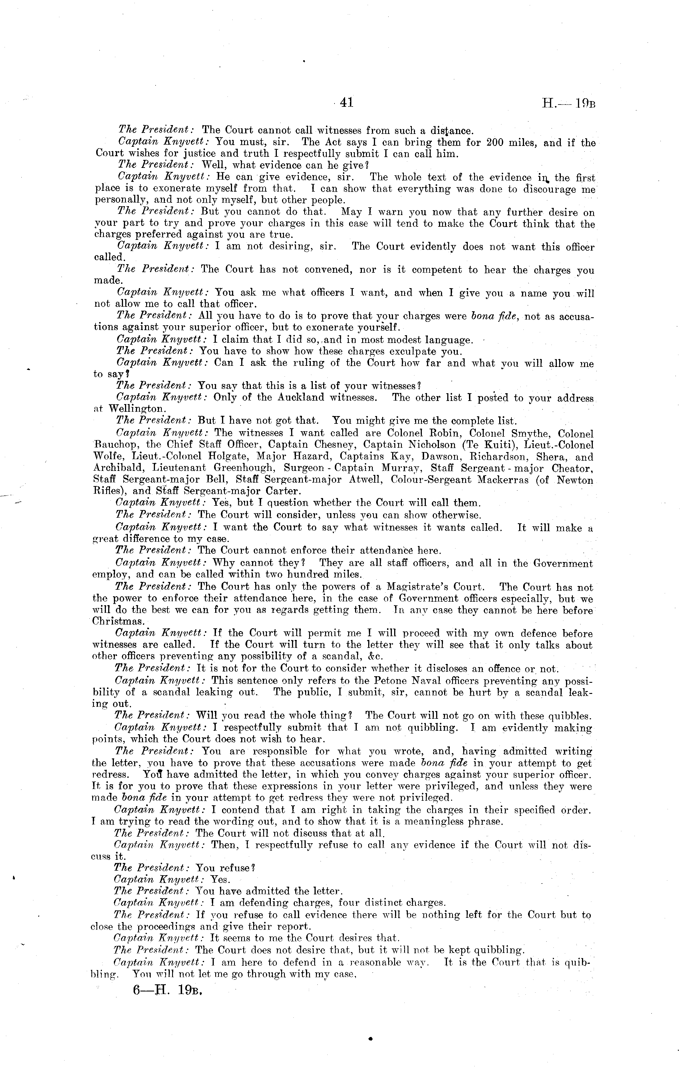 The President: The Court cannot call witnesses from such a distance. Captain Knyvett: You must, sir. The Act says I can bring them for 200 miles, and if the Court wishes for justice and truth I respectfully submit I can call him. The President: Well, what evidence can he give? Captain Knyvett: He can give evidence, sir. The whole text of the evidence in, the first place is to exonerate nryself from that. I can show that everything was done to discourage me personally, and not only myself, but other people. The President: But you cannot do that. May I warn you now that any further desire on your part to try and prove your charges in this case will tend to make the Court think that the charges preferred against you are true. Captain Knyvett: lam not desiring, sir. The Court evidently does not want this officer called. The President: The Court has not convened, nor is it competent to hear the charges you made. Captain Knyvett: You ask me what officers I want, and when I give you a name you will not allow me to call that officer. The President: All you have to do is to prove that your charges were bona fide, not as accusations against your superior officer, but to exonerate yourself. Captain Knyvett: I claim that I did so,,and in most modest language. • The President: You have to show how these charges exculpate you. Captain Knyvett: Can I ask the ruling of the Court how far and what you will allow me to say? The President: You say that this is a list of your witnesses ? Captain Knyvett: Only of the Auckland witnesses. The other list I posted to your address at Wellington. The President: But I have not got that. You might give me the complete list. Captain Knyvett: The witnesses I want called are Colonel Robin, Colonel Smythe, Colonel Bauchop, the Chief Staff Officer, Captain Chesney, Captain Nicholson (Te Kuiti), Lieut.-Colonel Wolfe, Lieut.-Colonel Holgate, Major Hazard, Captains Kay, Dawson, Richardson, Shera, and Archibald, Lieutenant Greenhough, Surgeon - Captain Murray, Staff Sergeant - major Cheator, Staff Sergeant-major Bell, Staff Sergeant-major Atwell, Colour-Sergeant Mackerras (of Newton Rifles), and Staff Sergeant-major Carter. Captain Knyvett: Yes, but I question whether the Court will call them. The President: The Court will consider, unless you can show otherwise. Captain Knyvett: I want the Court to say what witnesses it wants called. It will make a great difference to my case. The President: The Court cannot enforce their attendance here. Captain Knyvett: Why cannot they? They are all staff officers, and all in the Government employ, and can be called within two hundred miles. The President: The Court has only the powers of a Magistrate's Court. The Court has not the power to enforce their attendance here, in the case of Government officers especially, but we will do the best we can for you as regards getting them. In any case they cannot be here before Christmas. Captain Knyvett: If the Court will permit me I will proceed with my own defence before witnesses are called. If the Court will turn to the letter they will see that it only talks about other officers preventing any possibility of a scandal, &c. The President: It is not for the Court to consider whether it discloses an offence or not. Captain Knyvett: This sentence only refers to the Petone Naval officers preventing any possibility of a scandal leaking out. The public, I submit, sir, cannot be hurt by a scandal leaking out. The President: Will you read the whole thing? The Court will not go on with these quibbles. Captain Knyvett: I respectfully submit that I am not quibbling. I am evidently making points, which the Court does not wish to hear. The President: You are responsible for what you wrote, and, having admitted writing the letter, you have to prove that these accusations were made bona fide in your attempt to get redress. You , have admitted the letter, in which you convey charges against your superior officer. It is for you to prove that these expressions in your letter were privileged, and unless they were made bona fide in your attempt to get redress they were not privileged. Captain Knyvett: I contend that I am right in taking the charges in their specified order. I am trying to read the wording out, and to show that it is a meaningless phrase. The President: The Court will not discuss that at all. Captain Knyvett: Then, I respectfully refuse to call any evidence if the Court will not discuss it. The President: You refuse? Gaptai-n Knyvett: Yes. The President: You have admitted the letter. Captain Knyvett: I am defending charges, four distinct charges. The President: If you refuse to call evidence there will be nothing left for the Court but to close the proceedings and give their report. Captain Knyvett: It seems to me the Court desires that. The President: The Court does not desire that, but it will not be kept quibbling. Captain Knyvett: lam here to defend in a reasonable way. It is the Court that is quibbling. You will not let me go through with my case,