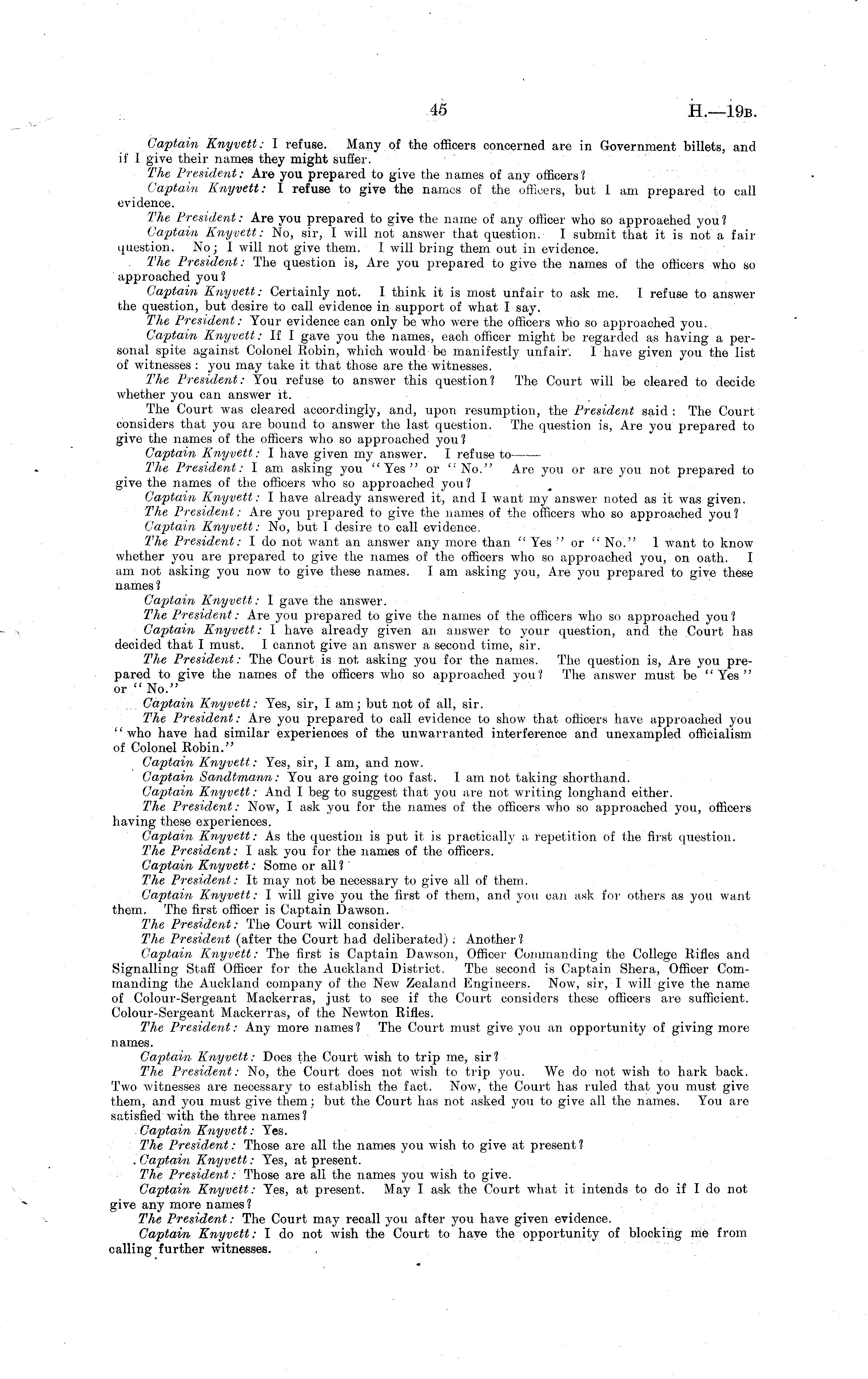 Captain Knyvett: I refuse. Many of the officers concerned are in Government billets, and if 1 give their names they might suffer. The President: Are you prepared to give the names of any officers'/ Captain Knyvett: I refuse to give the names of the officers, but 1 am prepared to call evidence. The President: Are you prepared to give the name of any officer who so approached you ? Captain Knyvett: No, sir, I will not answer that question. I submit that it is not a failquestion. No; I will not give them. I will bring them out in evidence. . The President: The question is, Are you prepared to give the names of the officers who so approached you 1 Captain Knyvett: Certainly not. I think it is most unfair to ask me. I refuse to answer the question, but desire to call evidence in support of what I say. The President: Tour evidence can only be who were the officers who so approached you. Captain Knyvett: If I gave you the names, each officer might be regarded as having a personal spite against Colonel Eobin, which would be manifestly unfair. I have given you the list of witnesses : you may take it that those are the witnesses. The President: You refuse to answer this question? The Court will be cleared to decide whether you can answer it. The Court was cleared accordingly, and, upon resumption, the President said : The Court considers that you are bound to answer the last question. The question is, Are you prepared to give the names of the officers who so approached you ? Captain Knyvett: I have given my answer. I refuse to The President: lam asking you "Yes" or " No." Are you or are you not prepared to give the names of the officers who so approached you ? Captain Knyvett: I have already answered it, and I want my answer noted as it was given. The President: Are you prepared to give the names of the officers who so approached you ? Captain Knyvett: No, but 1 desire to call evidence. The President: Ido not want an answer any more than " Yes "or " No." 1 want to know whether you are prepared to give the names of the officers who so approached you, on oath. I am not asking you now to give these names. lam asking you, Are you prepared to give these names ? Captain Knyvett: 1 gave the answer. The President: Are you prepared to give the names of the officers who so approached you ? Captain Knyvett: I have already given an answer to your question, and the Court has decided that I must. I cannot give an answer a second time, sir. The President: The Court is not asking you for the names. The question is, Are you prepared to give the names of the officers who so approached you? The answer must be "Yes" or "No." Captain Knyvett: Yes, sir, I am; but not of all, sir. The President: Are you prepared to call evidence to show that officers have approached you "who have had similar experiences of the unwarranted interference and unexampled officialism of Colonel Robin." Captain Knyvett: Yes, sir, I am, and now. Captain Sandtmann: You are going too fast. lam not taking shorthand. Captain Knyvett: And I beg to suggest that you are not writing longhand either. The President: Now, I ask you for the names of the officers who so approached you, officers having these experiences. Captain Knyvett: As the question is put it is practically a, repetition of the first question. The President: I ask you for the names of the officers. Captain Knyvett: Some or all? The President: It may not be necessary to give all of them. Captain Knyvett: I will give you the first of them, and you can ask for others as you want them. The first officer is Captain Dawson. The President: The Court will consider. The President (after the Court had deliberated) ; Another 1 Captain Knyvett: The first is Captain Dawson, Officer Commanding the College Rifles and Signalling Staff Officer for the Auckland District. The second is Captain Shera, Officer Commanding the Auckland company of the New Zealand Engineers. Now, sir, I will give the name of Colour-Sergeant Mackerras, just to see if the Court considers these officers are sufficient. Colour-Sergeant Mackerras, of the Newton Rifles. The President: Any more names? The Court must give you an opportunity of giving more names. Captain Knyvett: Does the Court wish to trip me, sir? The President: No, the Court does not wish to trip you. We do not wish to hark back. Two witnesses are necessary to establish the fact. Now, the Court has ruled that you must give them, and you must give them; but the Court has not asked you to give all the names. You are satisfied with the three names ? - Captain Knyvett: Yes. The President: Those are all the names you wish to give at present? .Captain Knyvett: Yes, at present. The President: Those are all the names you wish to give. Captain Knyvett: Yes, at present. May I ask the Court what it intends to do if Ido not give any more names ? The President: The Court may recall you after you have given evidence. Captain Knyvett: I do not wish the Court to have the opportunity of blocking me from calling further witnesses.