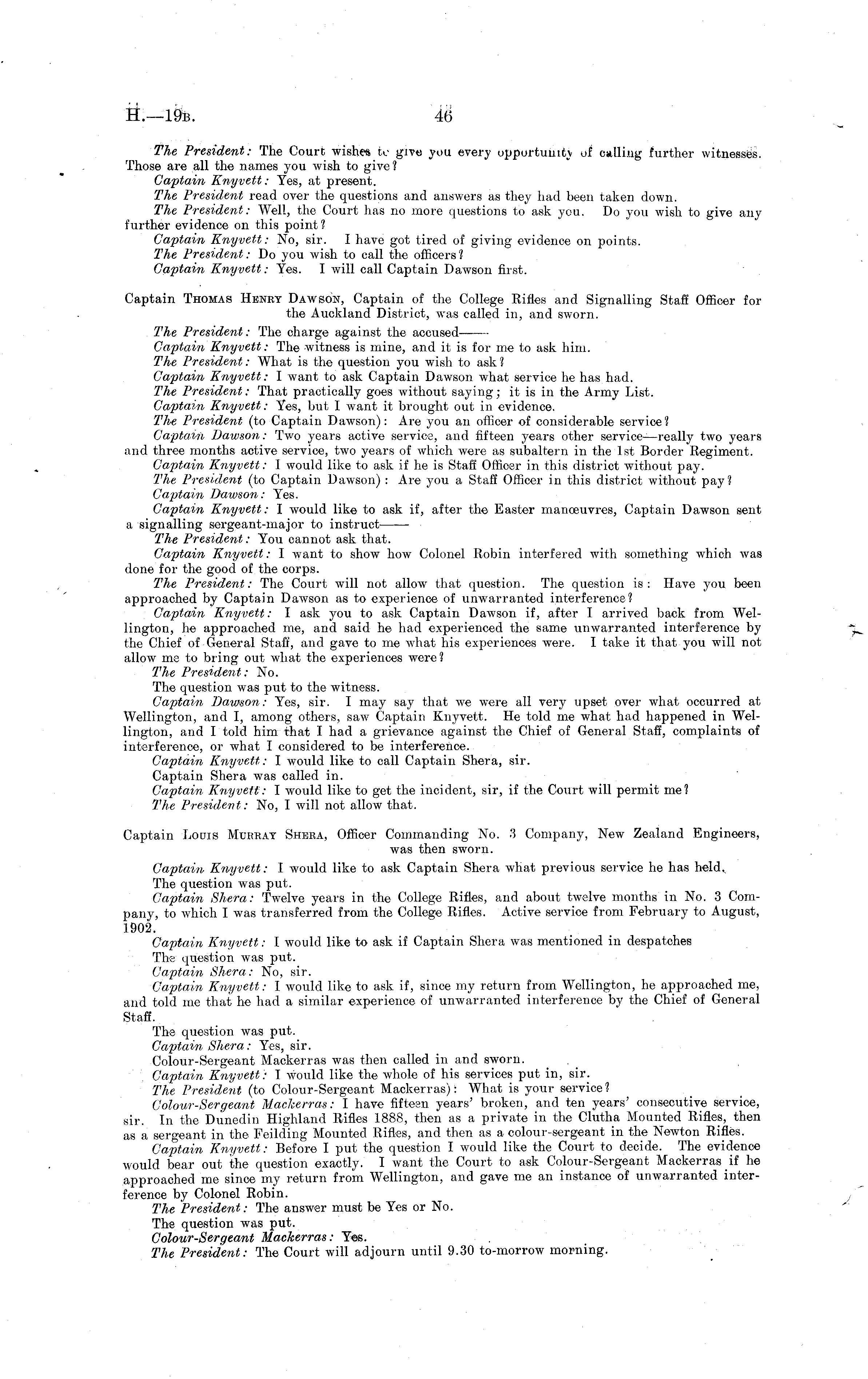 The President: The Court wishes to givu you every opportunity uf calling further witnesses. Those are all the names you wish to give 1 Captain Knyvett: Yes, at present. The President read over the questions and answers as they had been taken down. The President: Well, the Court has no more questions to ask you. Do you wish to give anyfurther evidence on this point 1 Captain Knyvett: No, sir. I have got tired of giving evidence on points. The President: Do you wish to call the officers? Captain Knyvett: Yes. I will call Captain Dawson first. Captain Thomas Henry Dawson, Captain of the College Rifles and Signalling Staff Officer for the Auckland District, was called in, and sworn. The President: The charge against the accused Captain Knyvett: The witness is mine, and it is for me to ask him. The President: What is the question you wish to ask ? Captain Knyvett: I want to ask Captain Dawson what service he has had. The President: That practically goes without saying; it is in the Army List. Captain Knyvett: Yes, but I want it brought out in evidence. The President (to Captain Dawson): Are you an officer of considerable service? Captain Dawson: Two years active service, and fifteen years other service-—really two years and three months active service, two years of which were as subaltern in the Ist Border Regiment. Captain Knyvett: I would like to ask if he is Staff Officer in this district without pay. The President (to Captain Dawson) : Are you a Staff Officer in this district without pay? Captain Dawson: Yes. Captain Knyvett: I would like to ask if, after the Easter manoeuvres, Captain Dawson sent a signalling sergeant-major to instruct The President: You cannot ask that. Captain Knyvett: I want to show how Colonel Robin interfered with something which was done for the good of the corps. The President: The Court will not allow that question. The question is: Have you been approached by Captain Dawson as to experience of unwarranted interference? Captain Knyvett: I ask you to ask Captain Dawson if, after I arrived back from Wellington, he approached me, and said he had experienced the same unwarranted interference by the Chief of General Staff, and gave to me what his experiences were. I take it that you will not allow me to bring out what the experiences were? The President: No. The question was put to the witness. Captain Dawson: Yes, sir. I may say that we were all very upset over what occurred at Wellington, and I, among others, saw Captain Knyvett. He told me what had happened in Wellington, and I told him that I had a grievance against the Chief of General Staff, complaints of interference, or what I considered to be interference. Captain Knyvett: I would like to call Captain Shera, sir. Captain Shera was called in. Captain Knyvett: I would like to get the incident, sir, if the Court will permit me? The President: No, I will not allow that. Captain Louis Murray Shera, Officer Commanding No. 3 Company, New Zealand Engineers, was then sworn. Captain Knyvett: I would like to ask Captain Shera what previous service he has held,. The question was put. Captain Shera: Twelve years in the College Rifles, and about twelve months in No. 3 Company, to which I was transferred from the College Rifles. Active service from February to August, 1902. Captain Knyvett: I would like to ask if Captain Shera was mentioned in despatches The question was put. Captain Shera: No, sir. Captain Knyvett: I would like to ask if, since my return from Wellington, he approached me, and told me that he had a similar experience of unwarranted interference by the Chief of General Staff. The question was put. Captain Shera: Yes, sir. Colour-Sergeant Mackerras was then called in and sworn. Captain Knyvett: I would like the whole of his services put in, sir. The President (to Colour-Sergeant Mackerras): What is your service? Colour-Sergeant Mackerras: I have fiftesn years' broken, and ten years' consecutive service, sir. In the Dunedin Highland Rifles 1888, then as a private in the Clutha Mounted Rifles, then as a sergeant in the Feilding Mounted Rifles, and then as a colour-sergeant in the Newton Rifles. Captain Knyvett: Before I put the question I would like the Court to decide. The evidence would bear out the question exactly. I want the Court to ask Colour-Sergeant Mackerras if he approached me since my return from Wellington, and gave me an instance of unwarranted interference by Colonel Robin. The President: The answer must be Yes or No. The question was put. Colour-Sergeant Mackerras: Yes. The President: The Court will adjourn until 9.30 to-morrow morning.